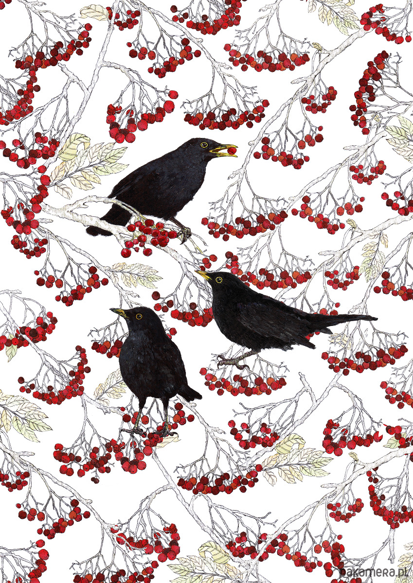 Kosy w jarzębinie - Grafika- Ilustracja- Ptaki