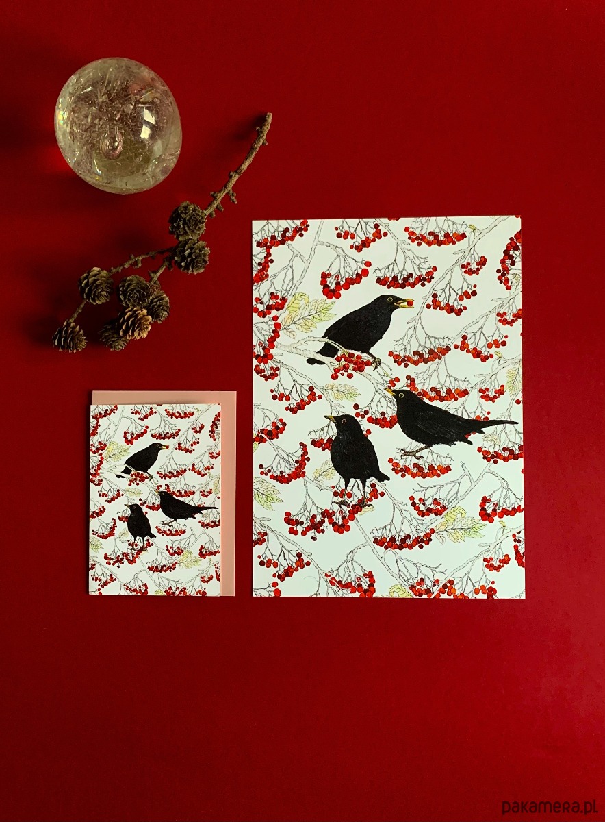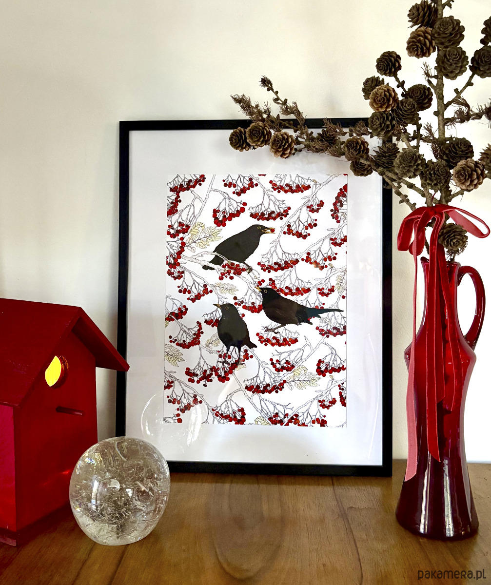 Kosy w jarzębinie, to wydruk najnowszej autorskiej ilustracji inspirowanej światem rodzimej fauny oraz estetyką vintage.
