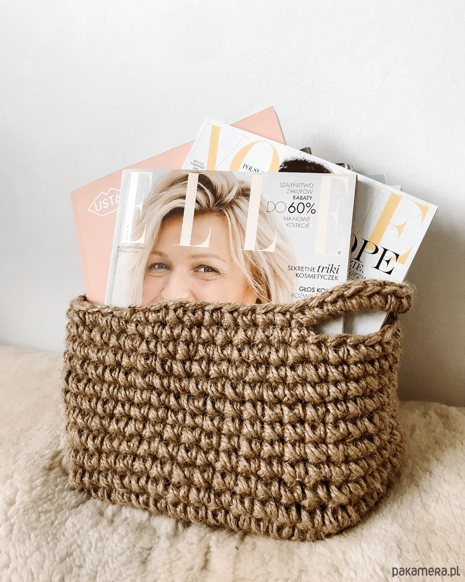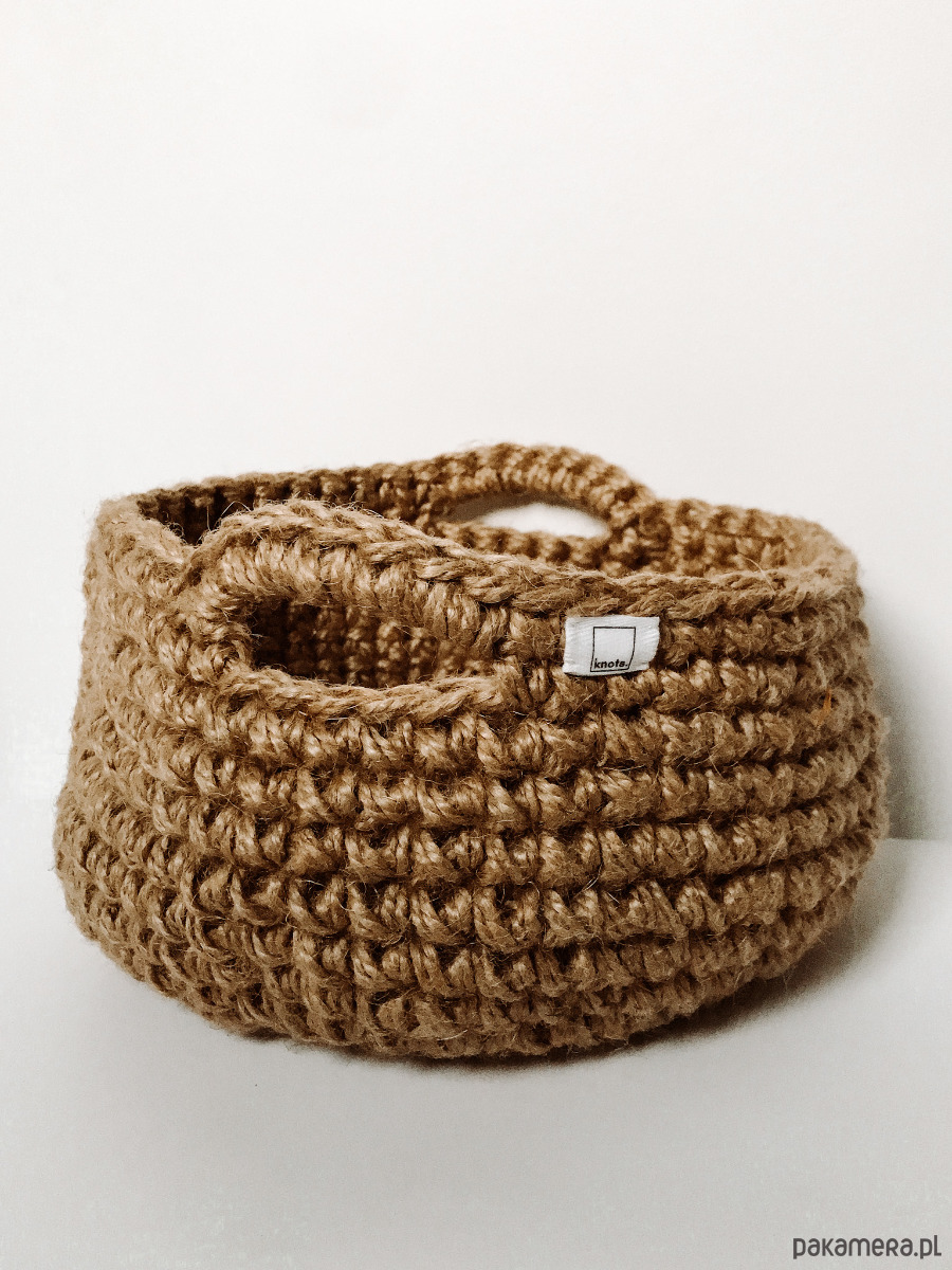 Kosz wykonany ze sznura jutowego.