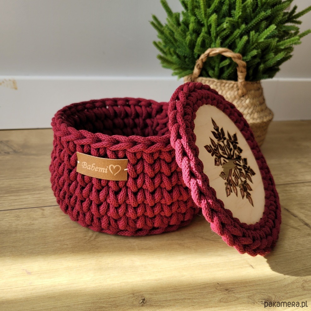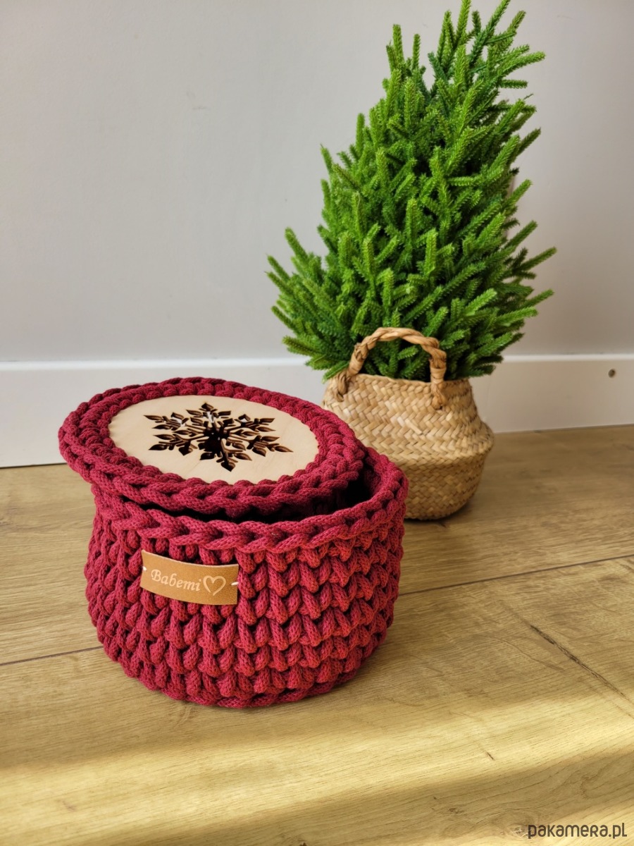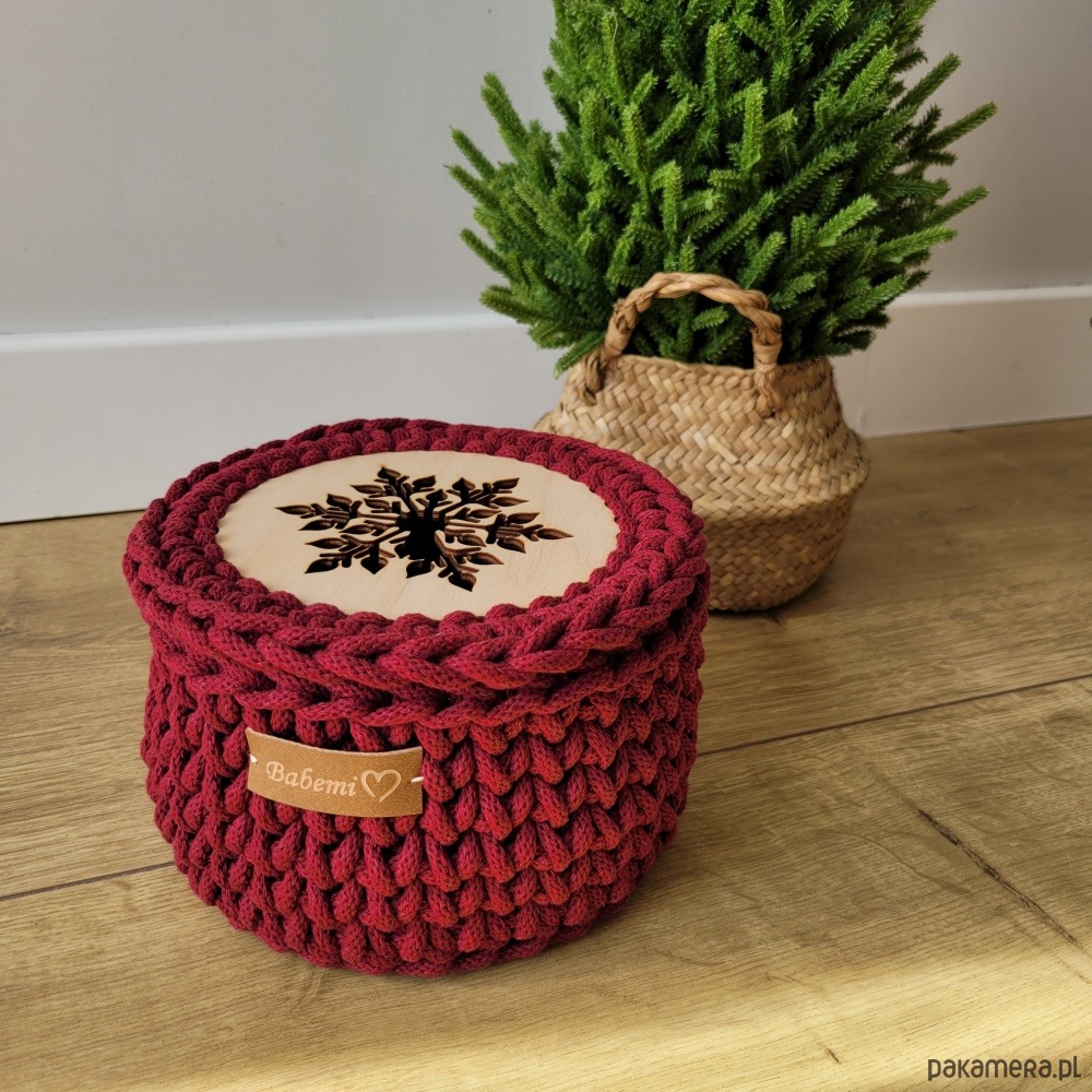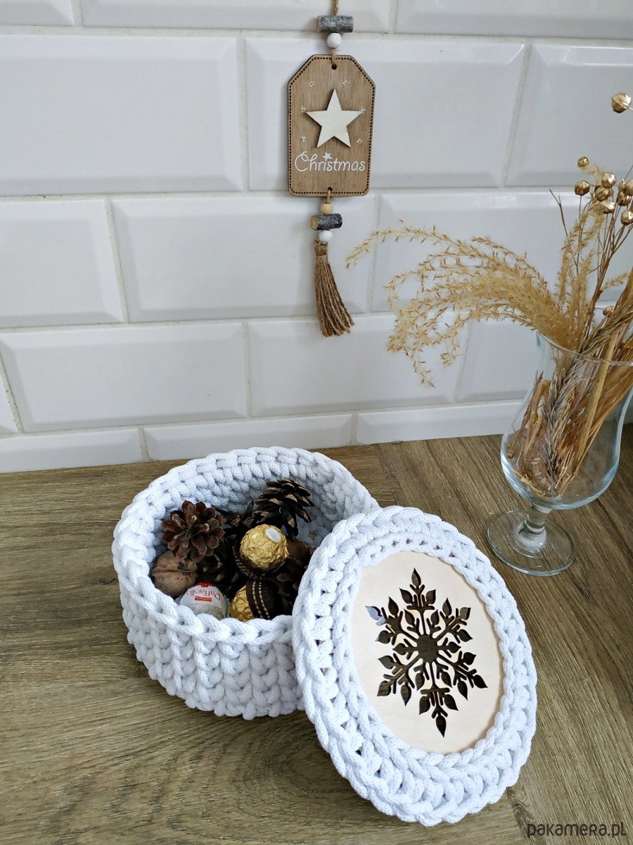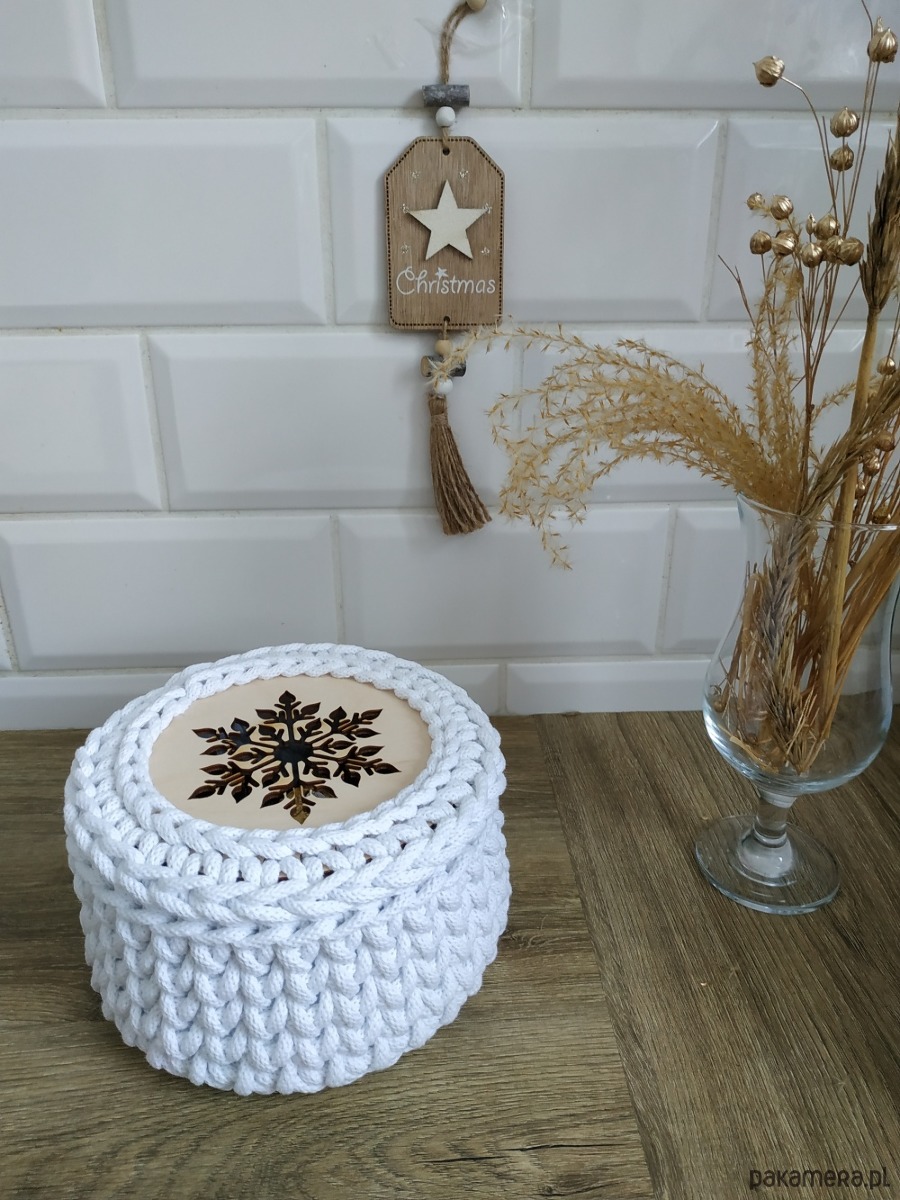 Koszyk prezentowy wykonany jest na szydełku, z bardzo sztywnego sznurka, dzięki czemu koszyk pięknie zachowuje swój kształt przez cały czas użytkowania. Wieczko jest luźno kładzione. Świąteczny wzór śnieżynka idealnie wpasuje się w dekoracje Bożo - Narodzeniową. Koszyk idealnie sprawdzi się do przechowywania orzechów, słodyczy, biżuterii czy pięknej filiżanki. Jeśli myślisz o drobnym upominku dla znajomych, cioci, babci, mamy - to będzie idealny wybór!