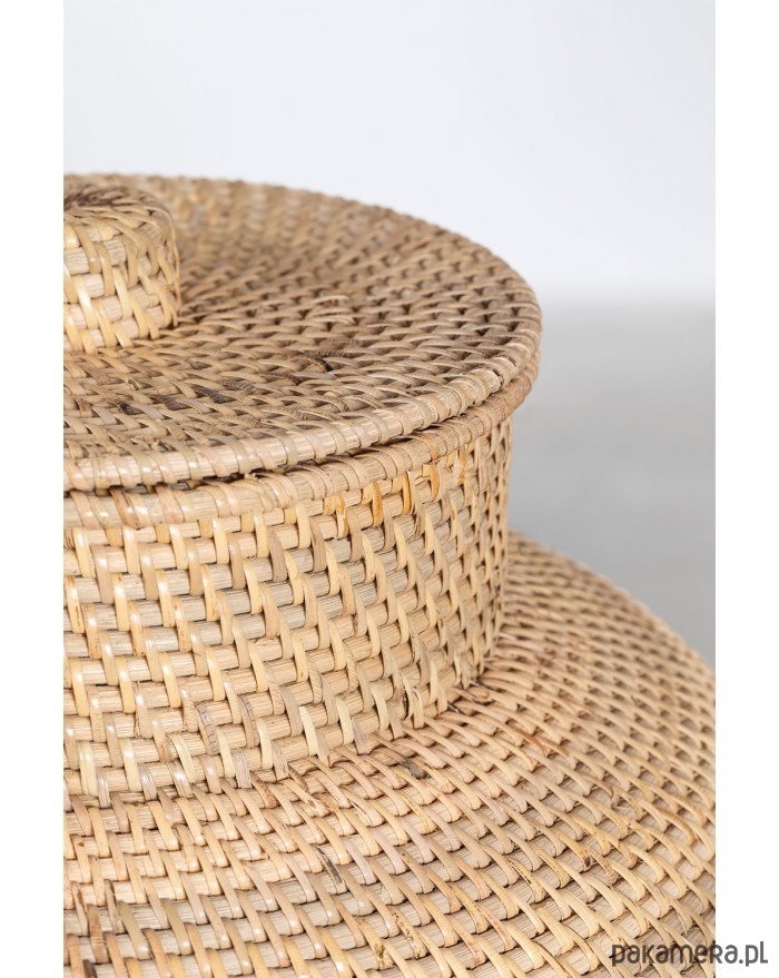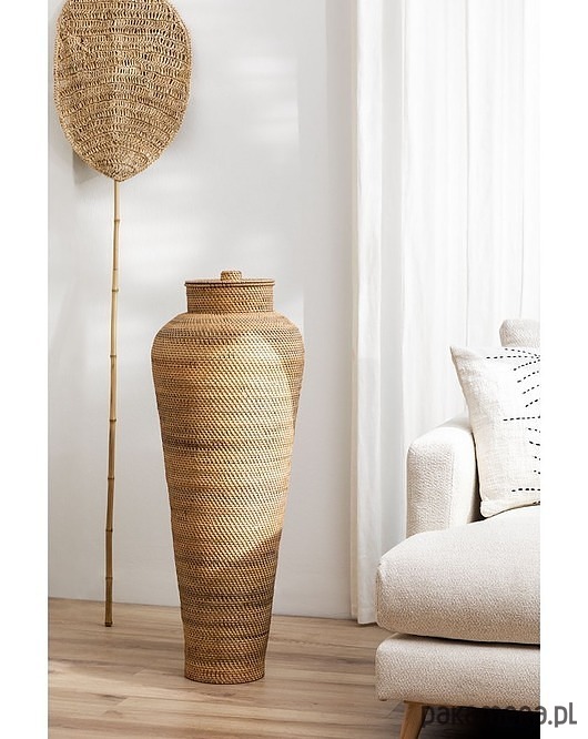 Wysoki kosz wykonany z rattanu z pokrywą. Idealny jako kosz na bieliznę, w salonie jako kosz na koce czy inne rzeczy. Całość utrzymana w naturalnym kolorze beżowym.