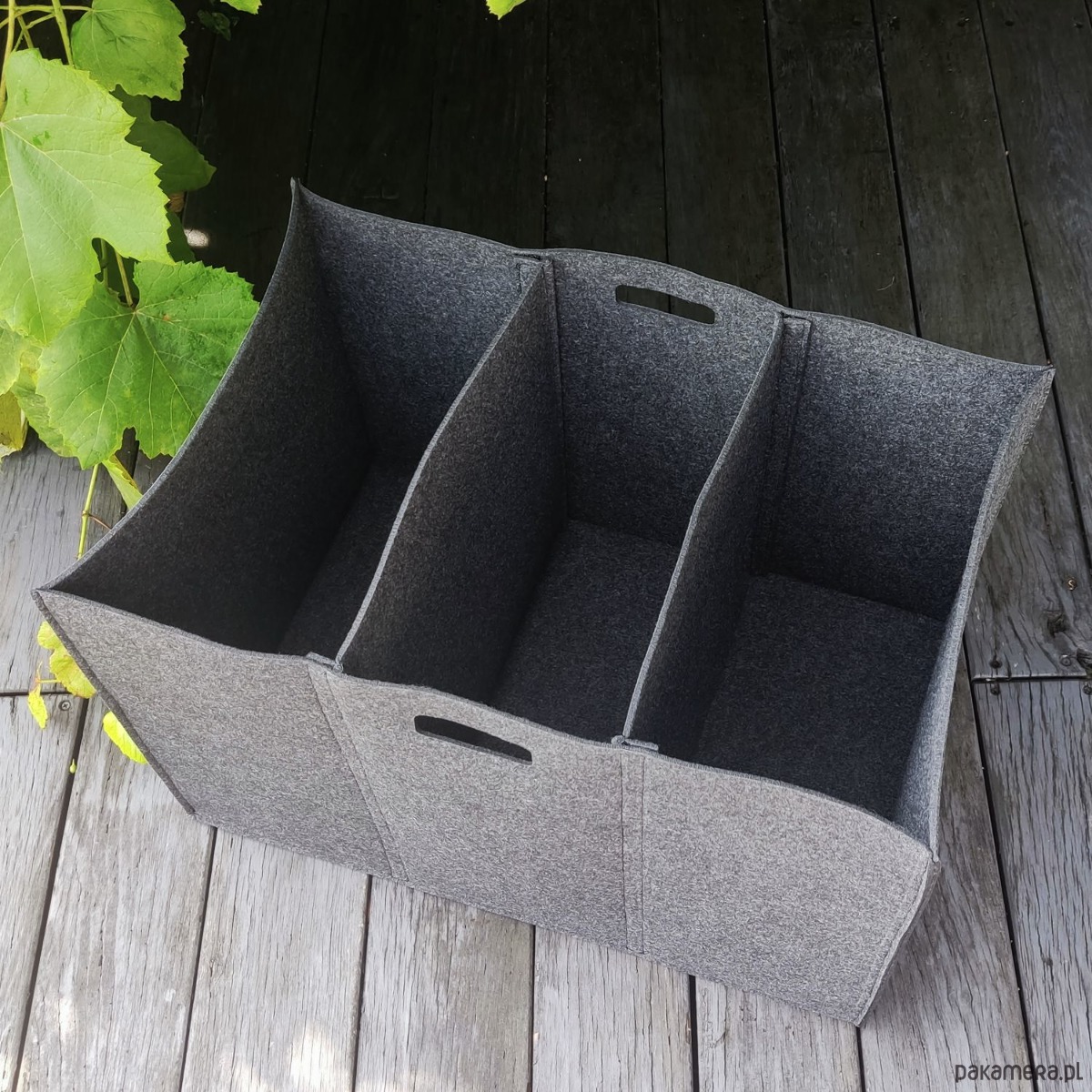 Kosz uszyty z ciemnego, grafitowego filcu grubości 4mm, 100% poliester.