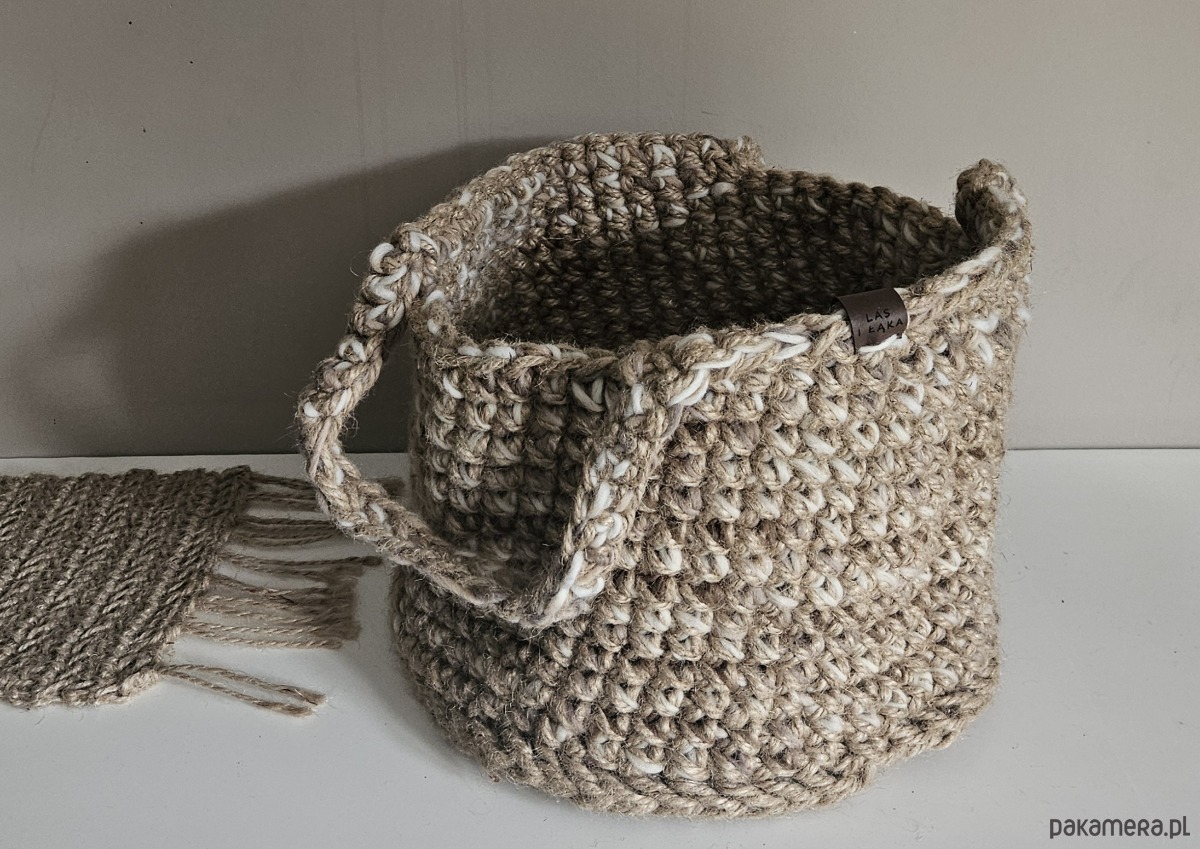 Kosz ze sznurka konopnego z dodatkiem wełnianej przędzy – ręcznie robiony na szydełku | styl eko & boho