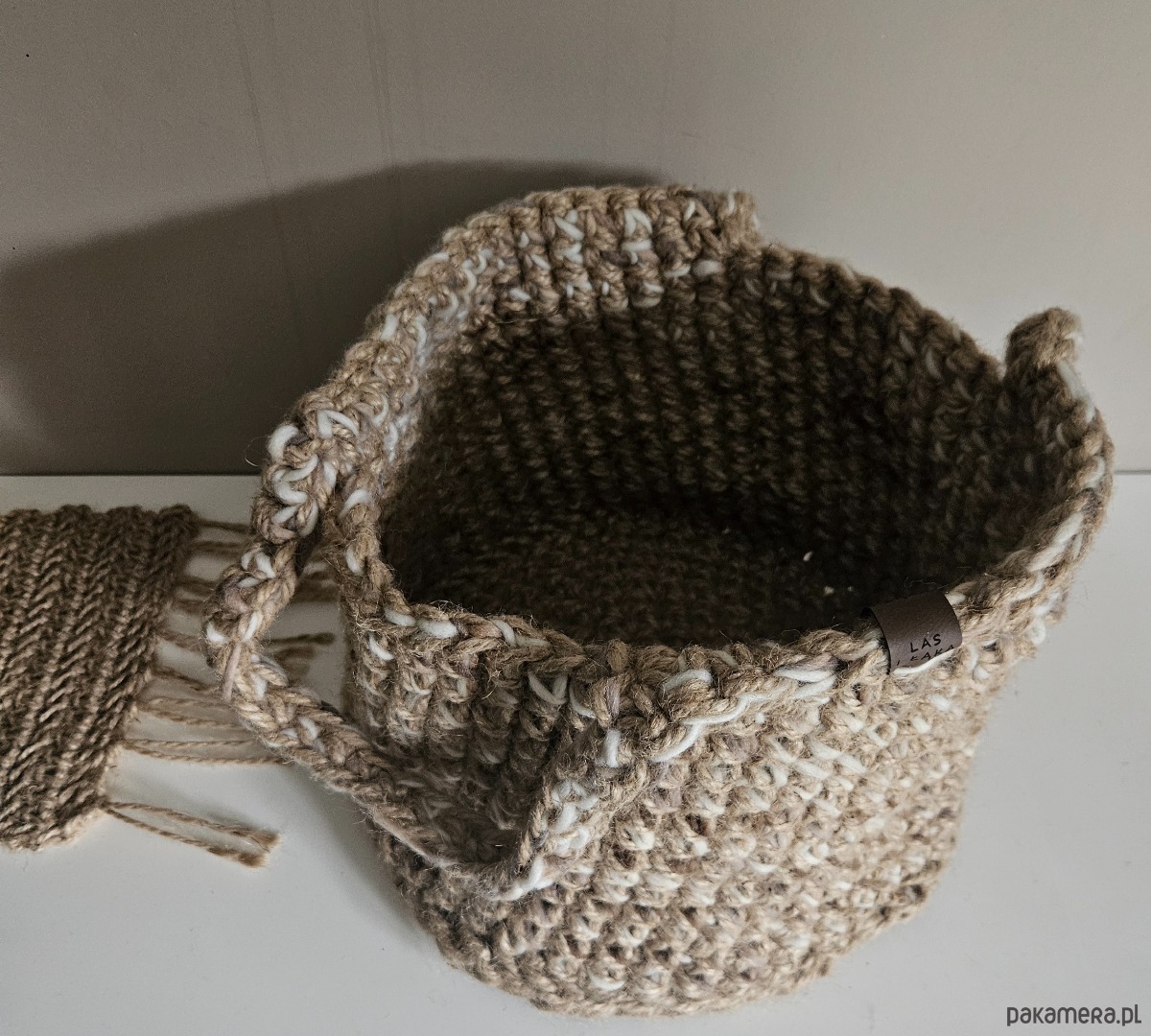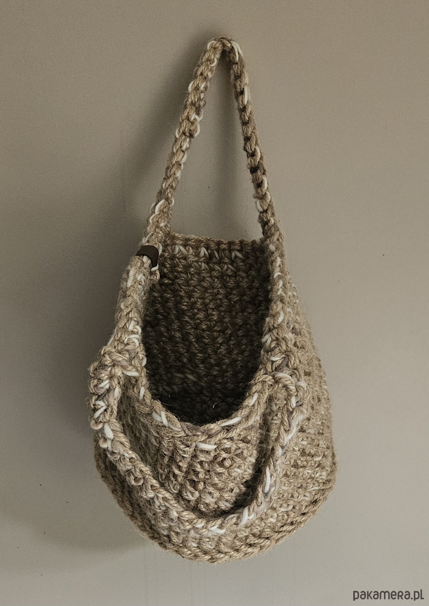 Kosz ze sznurka konopnego z dodatkiem wełnianej przędzy – ręcznie robiony na szydełku | styl eko & boho