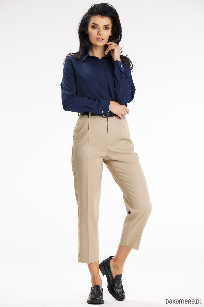 Elegancka koszula z kołnierzem i długim rękawem zakończonym mankietem ze złotym guzikiem.