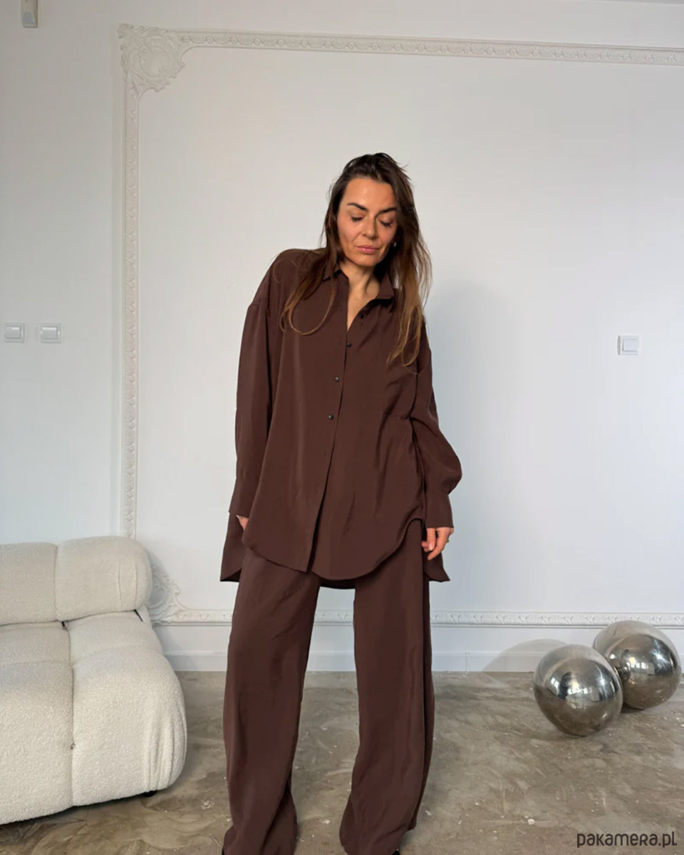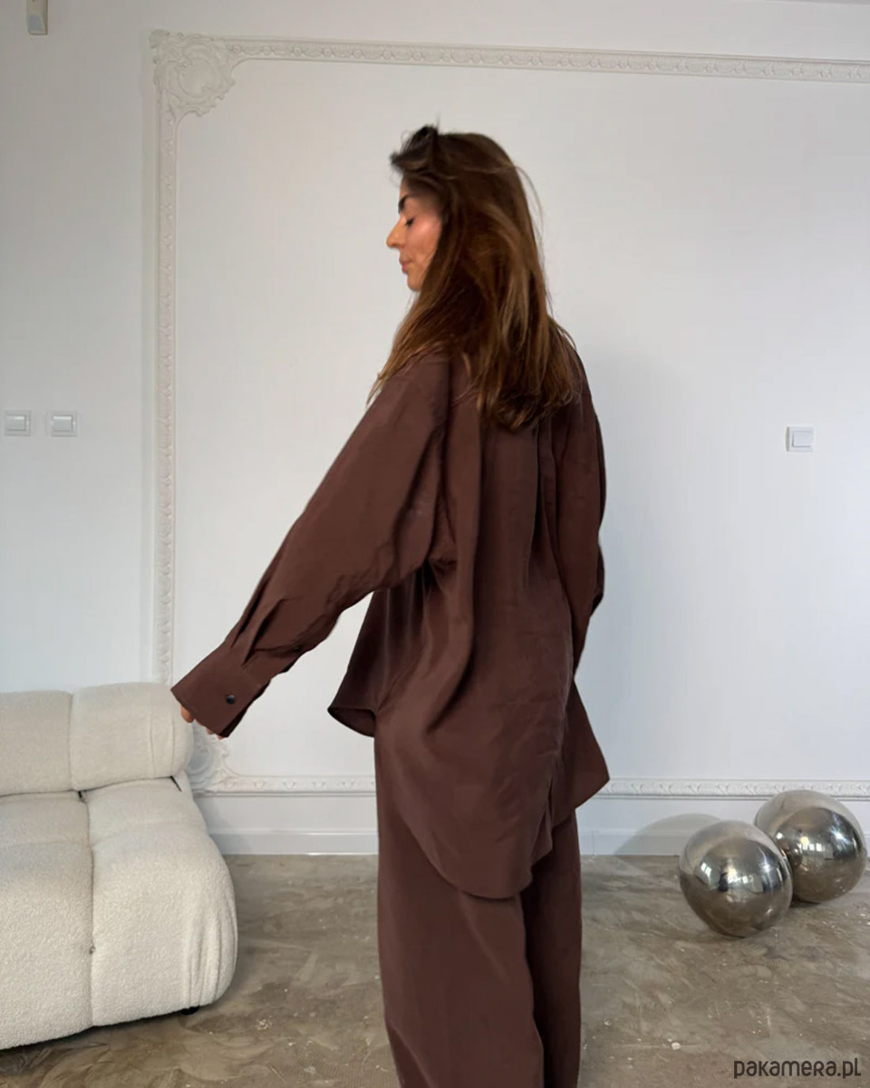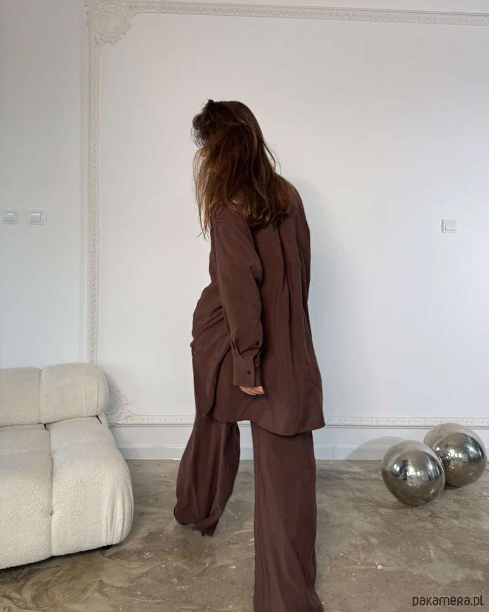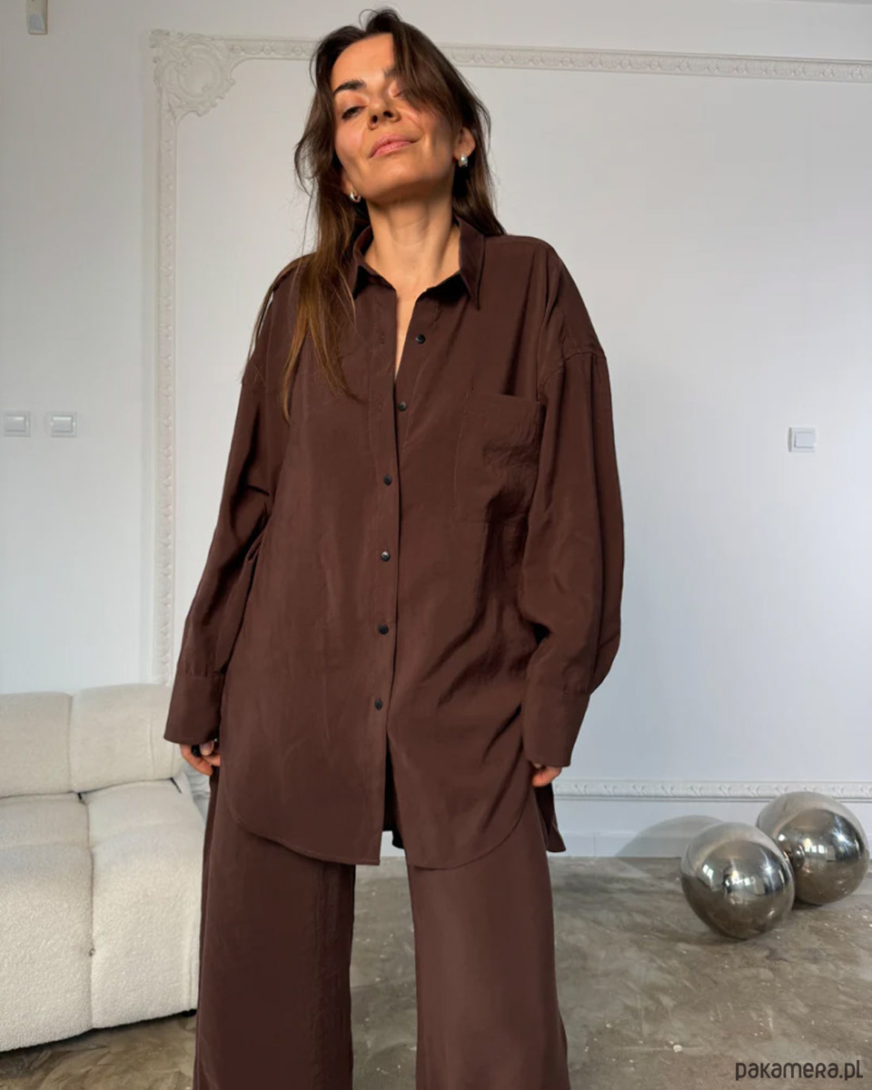 Koszula Calm w kolorze czekoladowym to połączenie naturalnej elegancji i codziennego komfortu. Jej oversize’owy krój z obniżoną linią ramion oraz wydłużony tył tworzą nowoczesną, lekko nonszalancką sylwetkę, która sprawdza się w wielu sytuacjach – od codziennego luzu po bardziej dopracowane stylizacje.