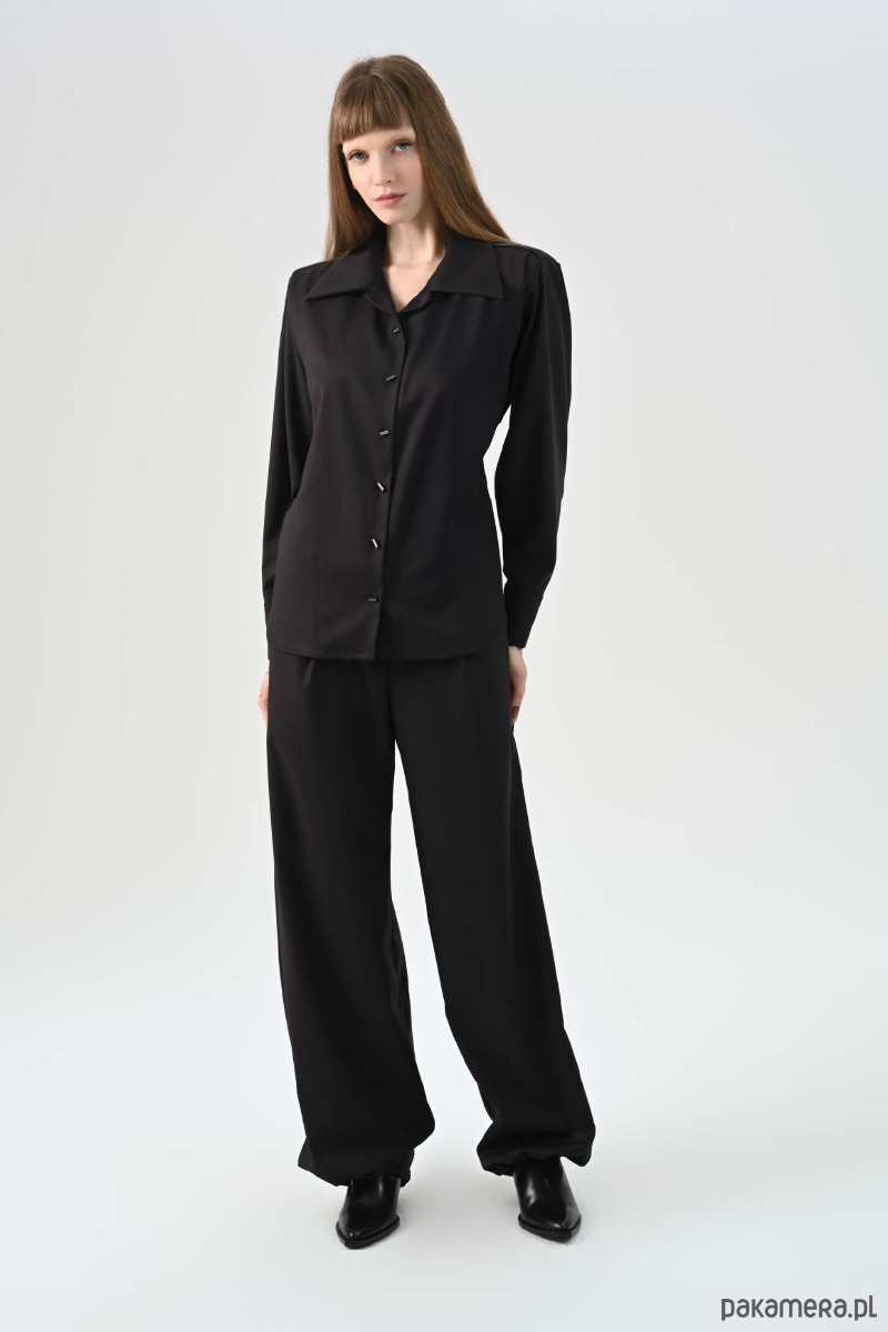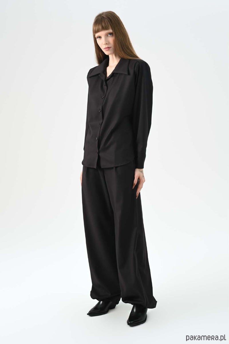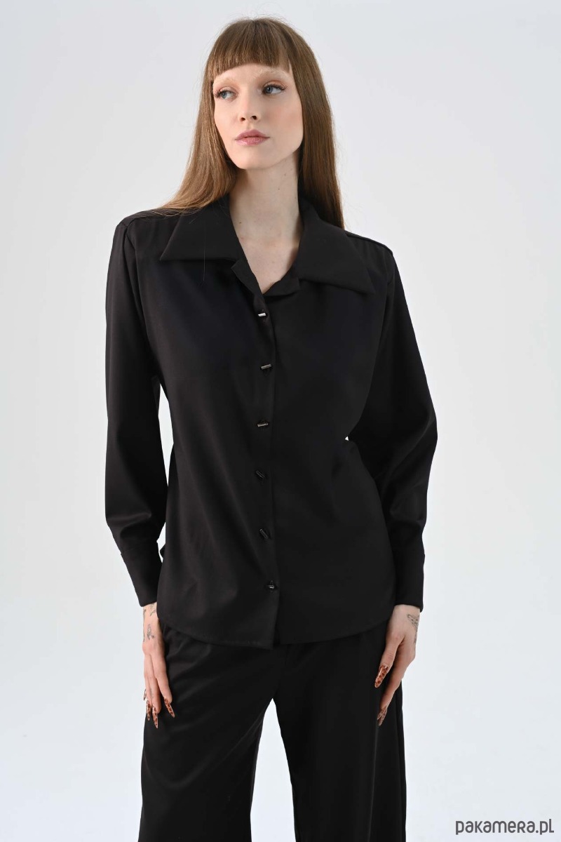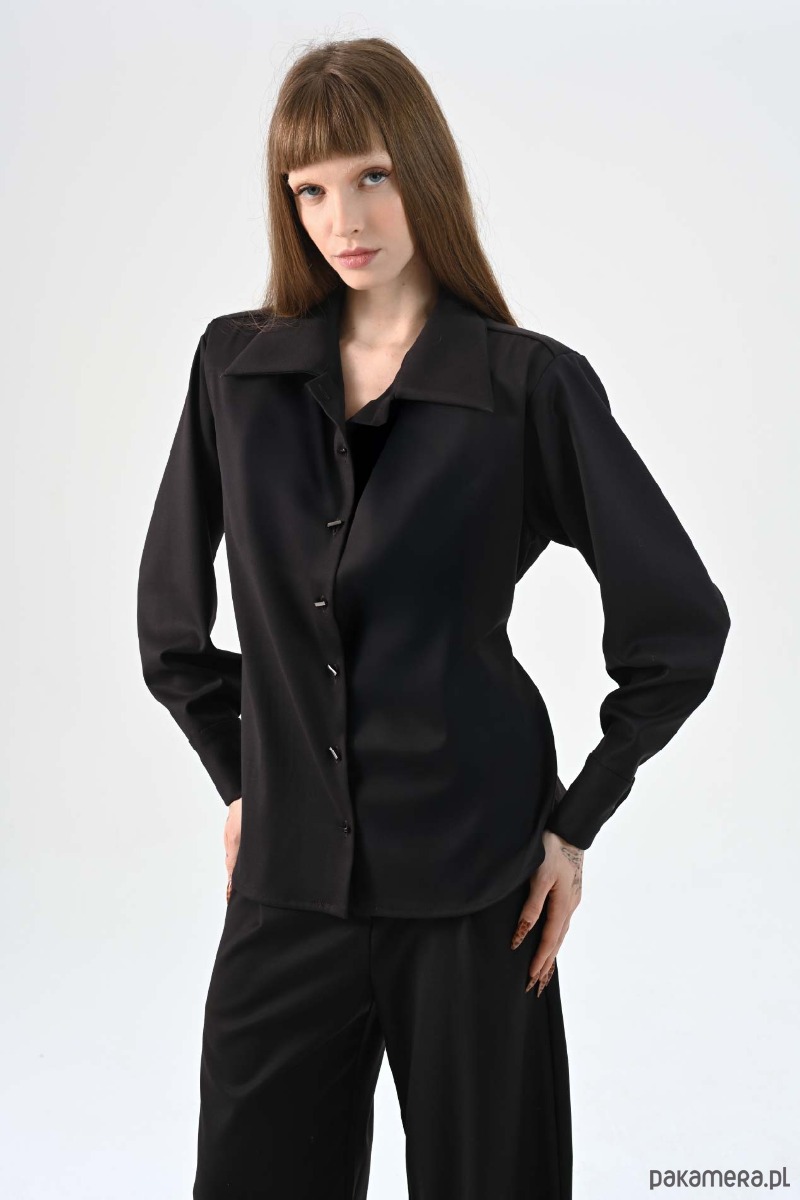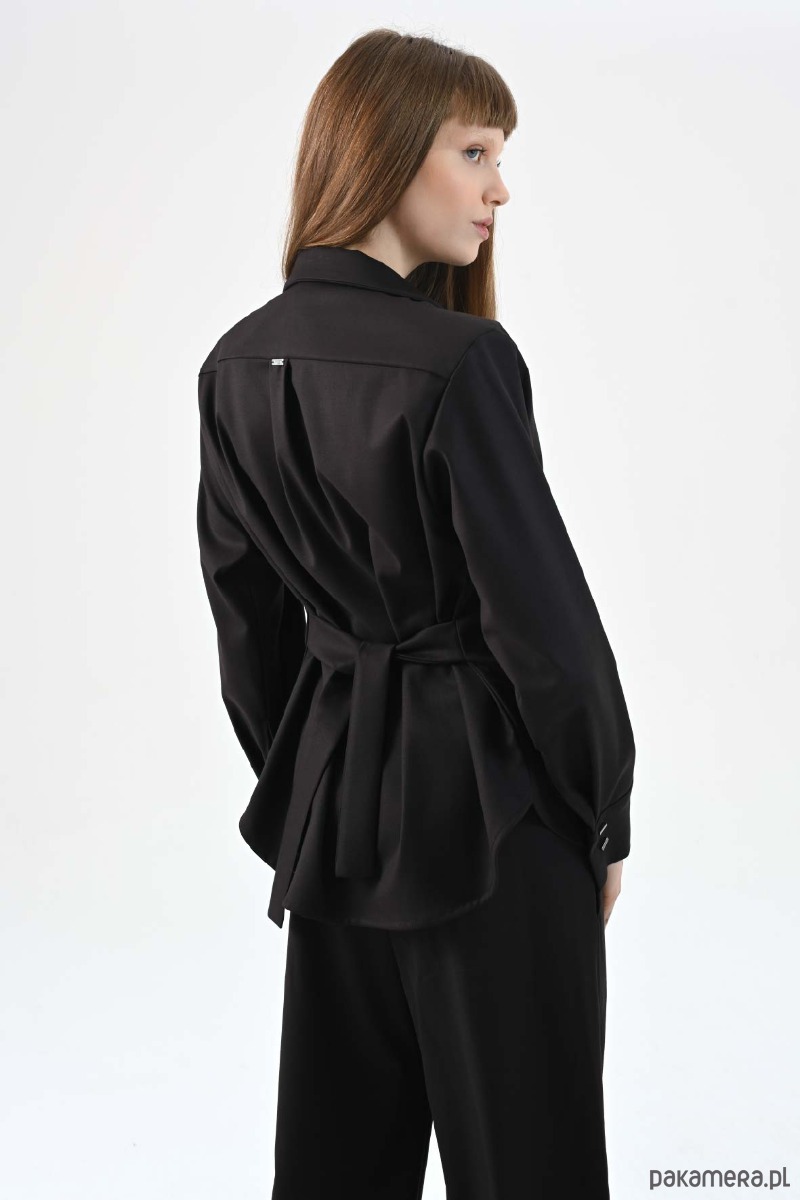 Koszula została dopracowana w każdym szczególe, co widać w wyrazistym, ostrym kołnierzyku oraz eleganckich, szerokich mankietach. Ciemnobrązowy kolor (bitter chocolate) jest niezwykle twarzowy i doskonale komponuje się ze złotą biżuterią, błękitnym denimem czy jasnymi, kremowymi spodniami. Krój koszuli pozwala na noszenie jej na dwa sposoby: mocno dopasowaną dzięki wiązaniu lub nieco luźniej, co daje swobodę ruchów.