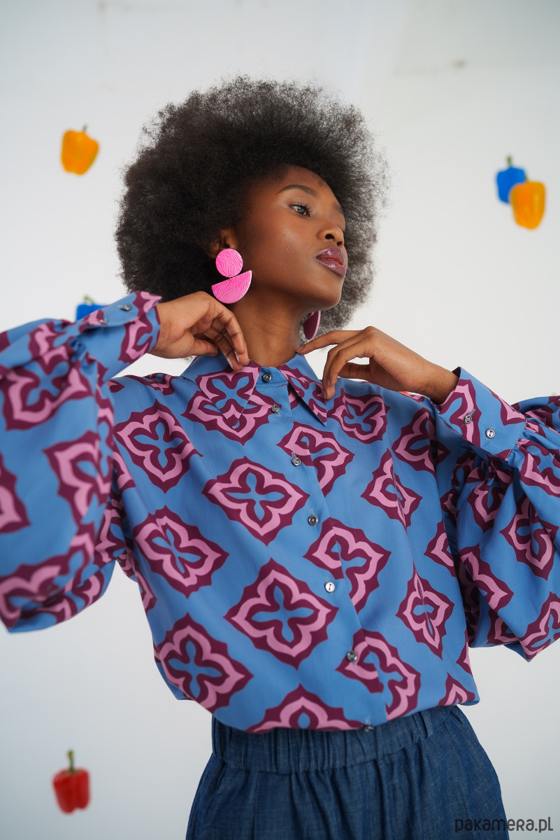 Stylowa, modowa koszula damska, która przyciąga uwagę dzięki oryginalnemu wzorowi i nowoczesnemu krojowi. Model inspirowany estetyką retro, idealny dla kobiet, które cenią sobie wyraziste akcenty w swojej garderobie. Dzięki luźnemu fasonowi koszula doskonale podkreśla sylwetkę i świetnie komponuje się z jeansami, spódnicami lub spodniami z wysokim stanem.