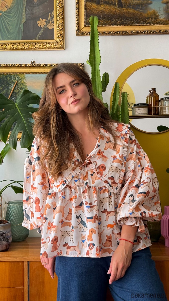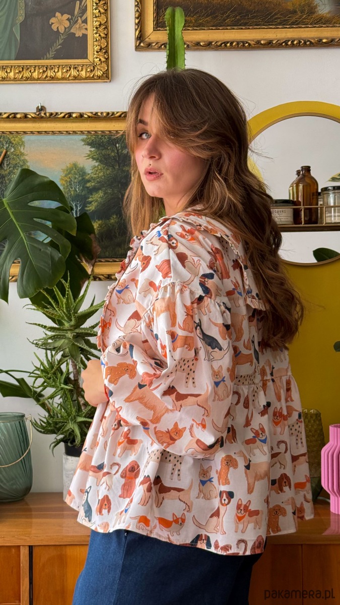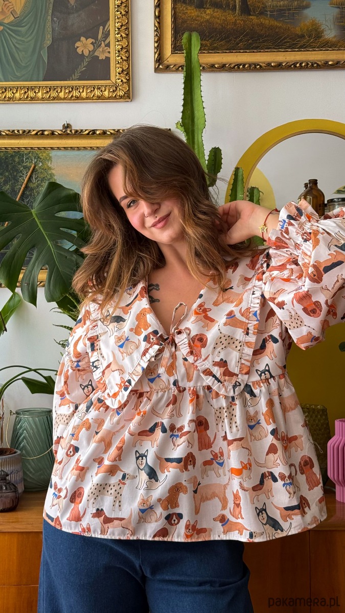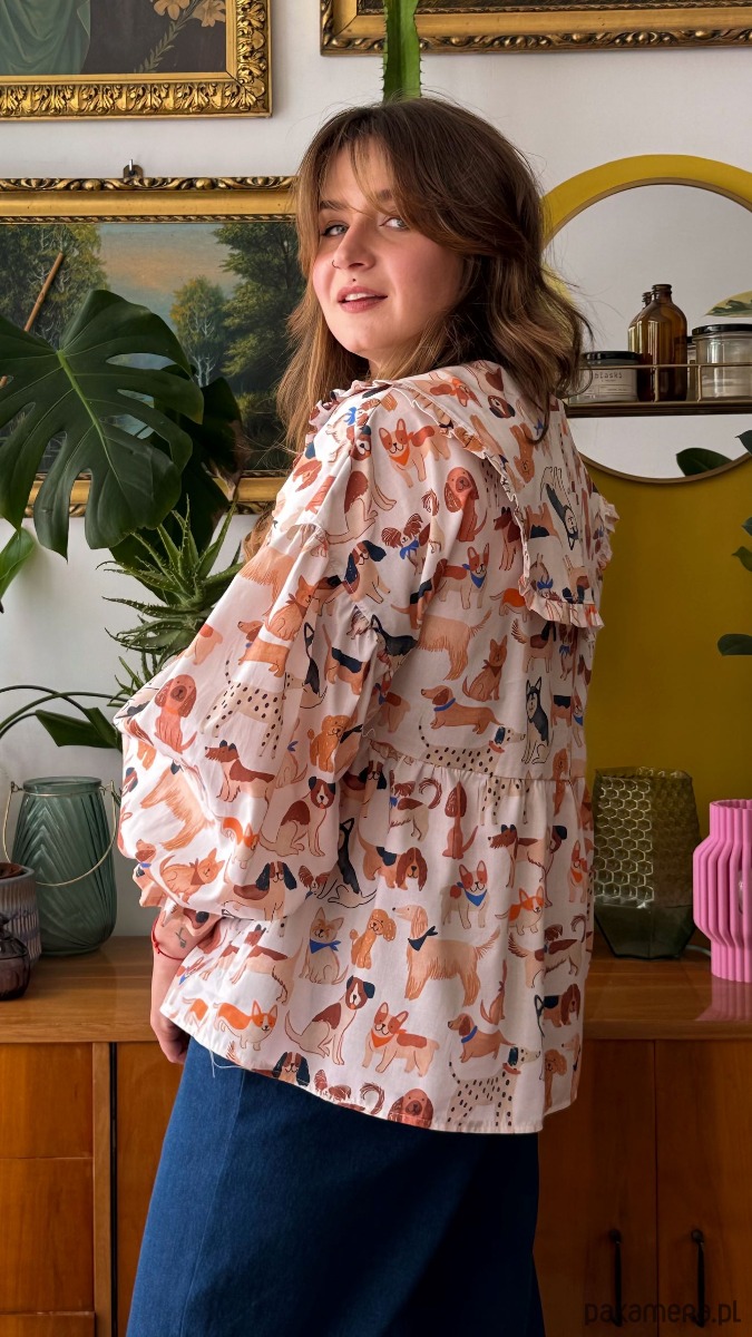 Koszula Kejtry wykonana została z przyjemnej w odczuciu popeliny bawełnianej w kolorze ecru drukowanej w psiaki.