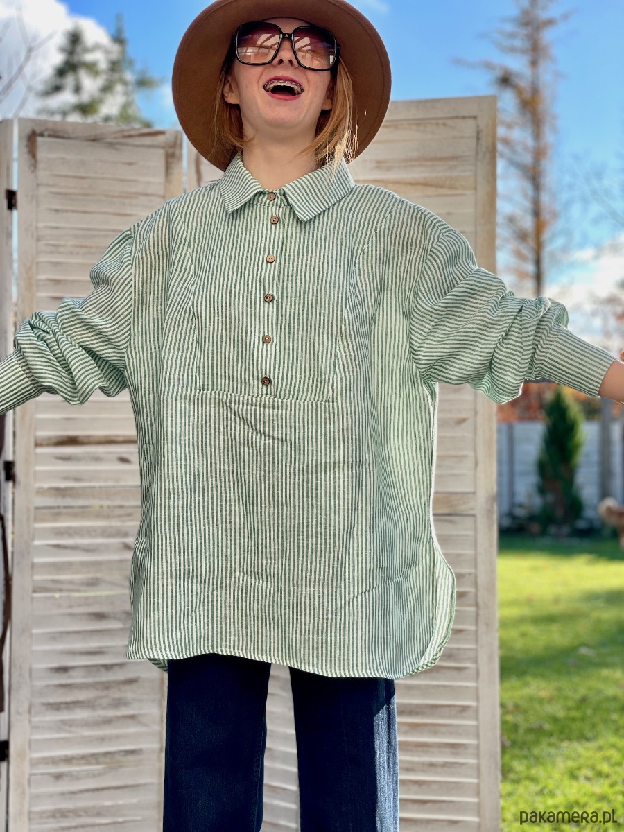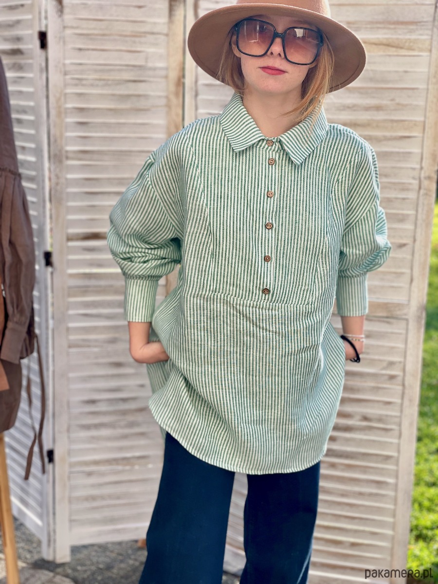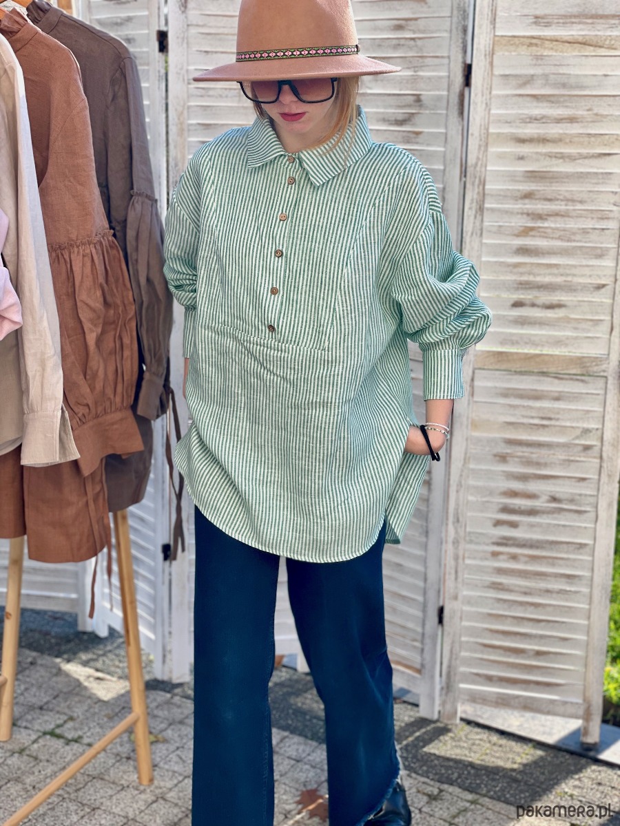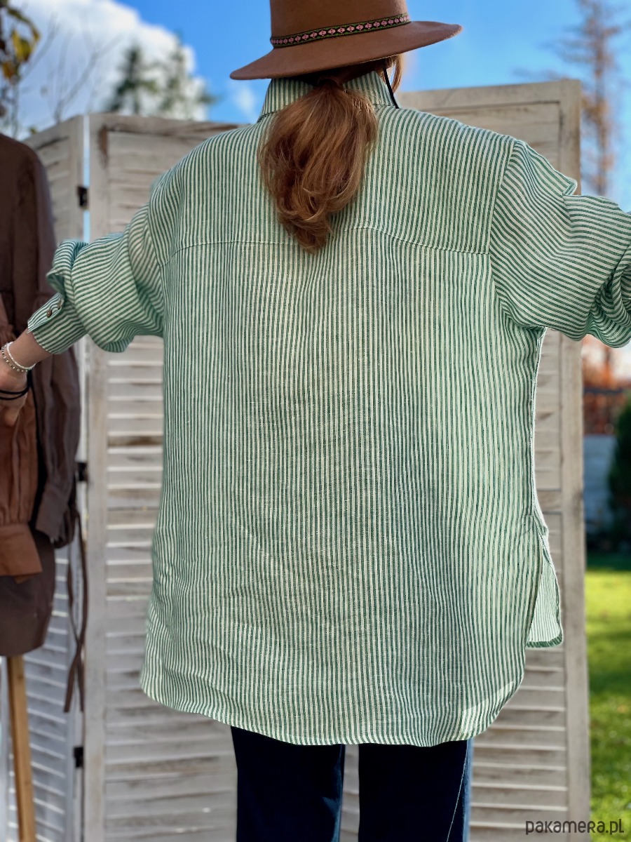 Koszula lniana biała w zielone prążki