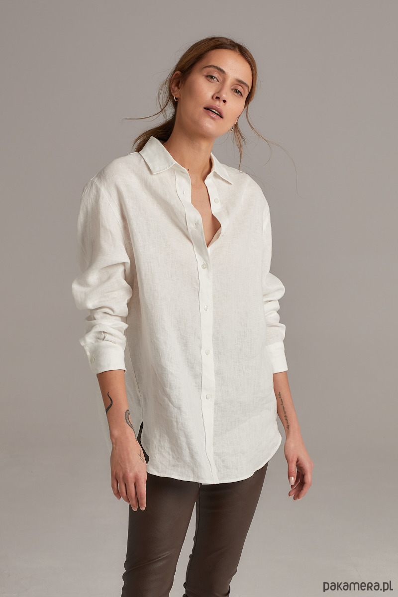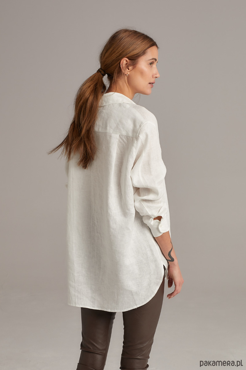 Klasyczna koszula w męskim stylu uszyta z cienkiego 100% lnu w białym kolorze. Całość układa się miękko i plastycznie nie wymagając starannego prasowania. W lecie doskonale sprawdzi się jako przewiewna tunika plażowa lub w zestawie z szortami pozwoli stworzyć wygodny, hipoalergiczny set. Prosta forma z długimi rękawami starannie wykończonymi mankietem. Dół lekko zaokrąglony, tył z karczkiem i zakładkami. Koszula zapinana na guziki, szyja wykończona klasycznym kołnierzykiem. Szwy dodatkowo stebnowane.