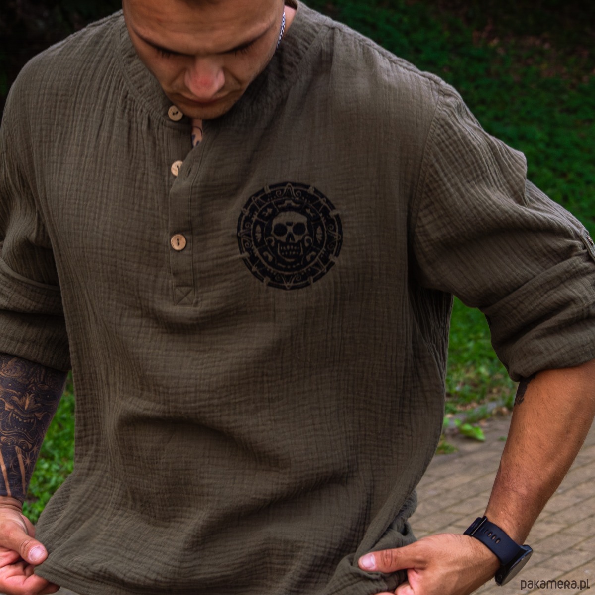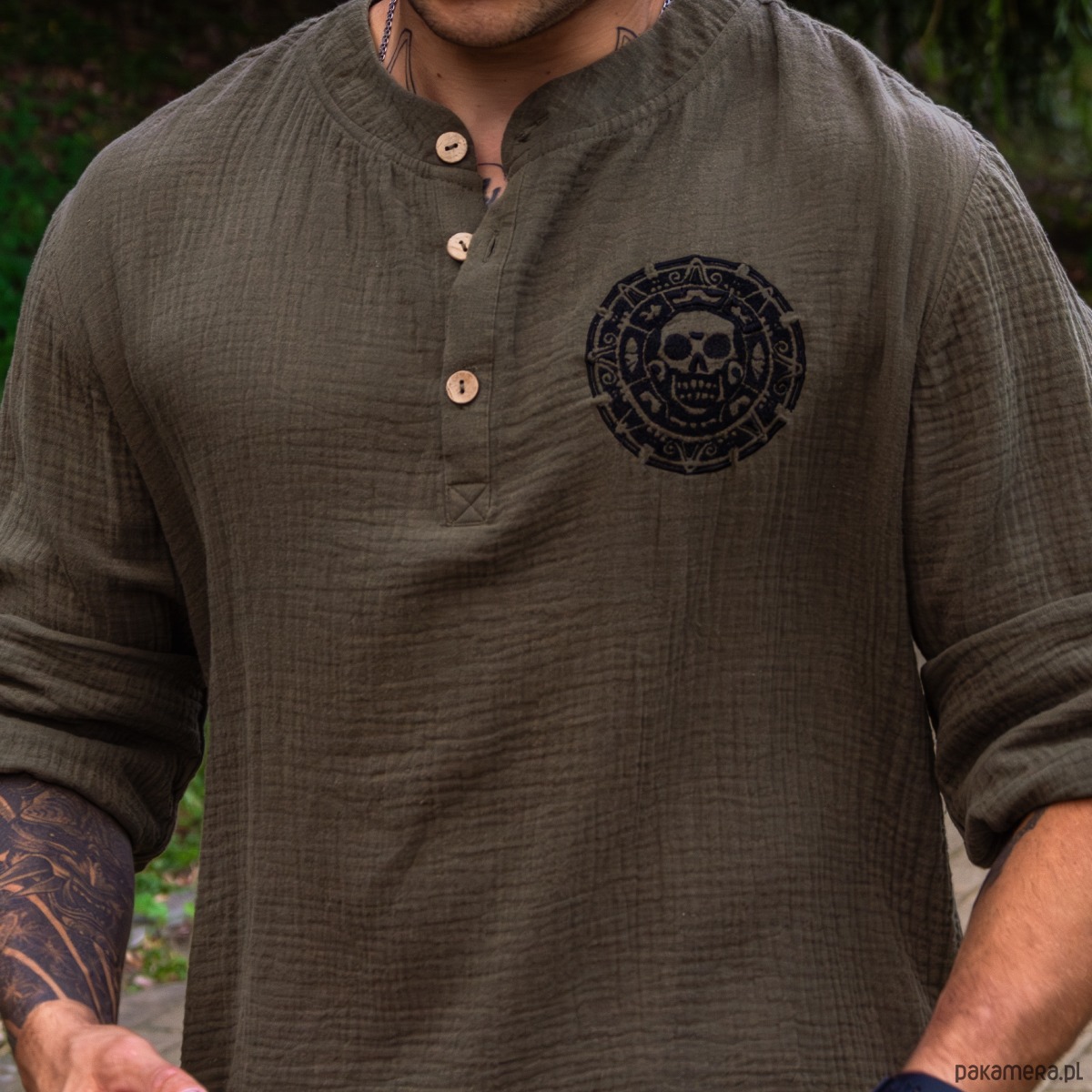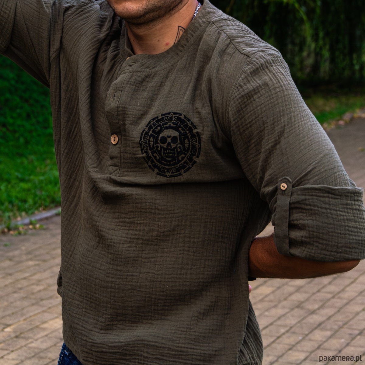 Koszula męska muślinowa Ciemno zielony kolor, Motyw piracki, Złoto Azteków