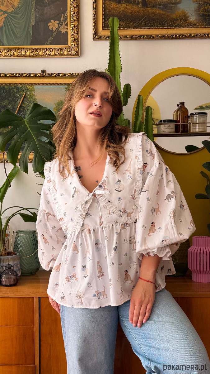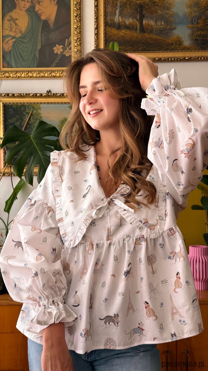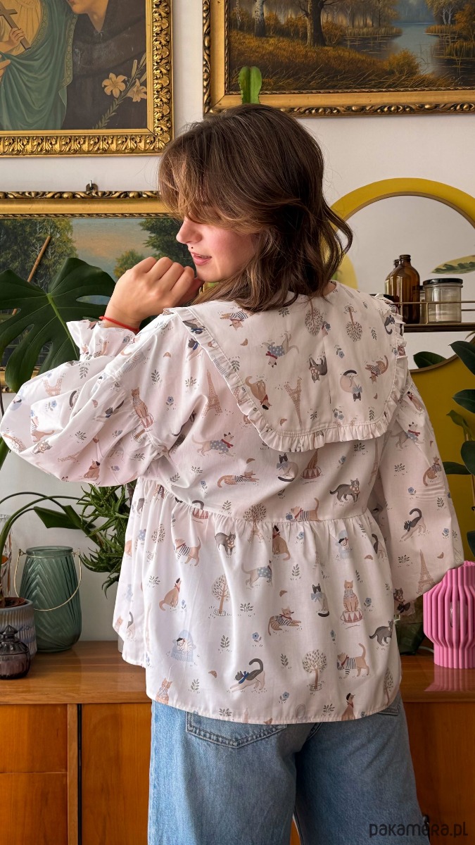 Koszula Mruczki wykonana została z przyjemnej w odczuciu popeliny bawełnianej w kolorze białym drukowanej w kociaki.