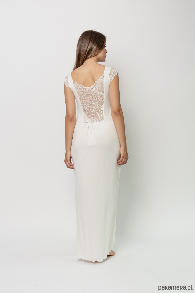 Długa dopasowana koszula. Fason podkreślający sylwetkę. Dekolt przodu wykończony koronką, krótkie koronkowe rękawki. Efektowny głęboki dekolt tyłu zabudowany delikatną koronką. Marszczenie na tyle podkreśla kobiece kształty ale nie opina sylwetki. Dół wykończony mereżką. Delikatna zmysłowa koronka z florystycznymi ornamentami.