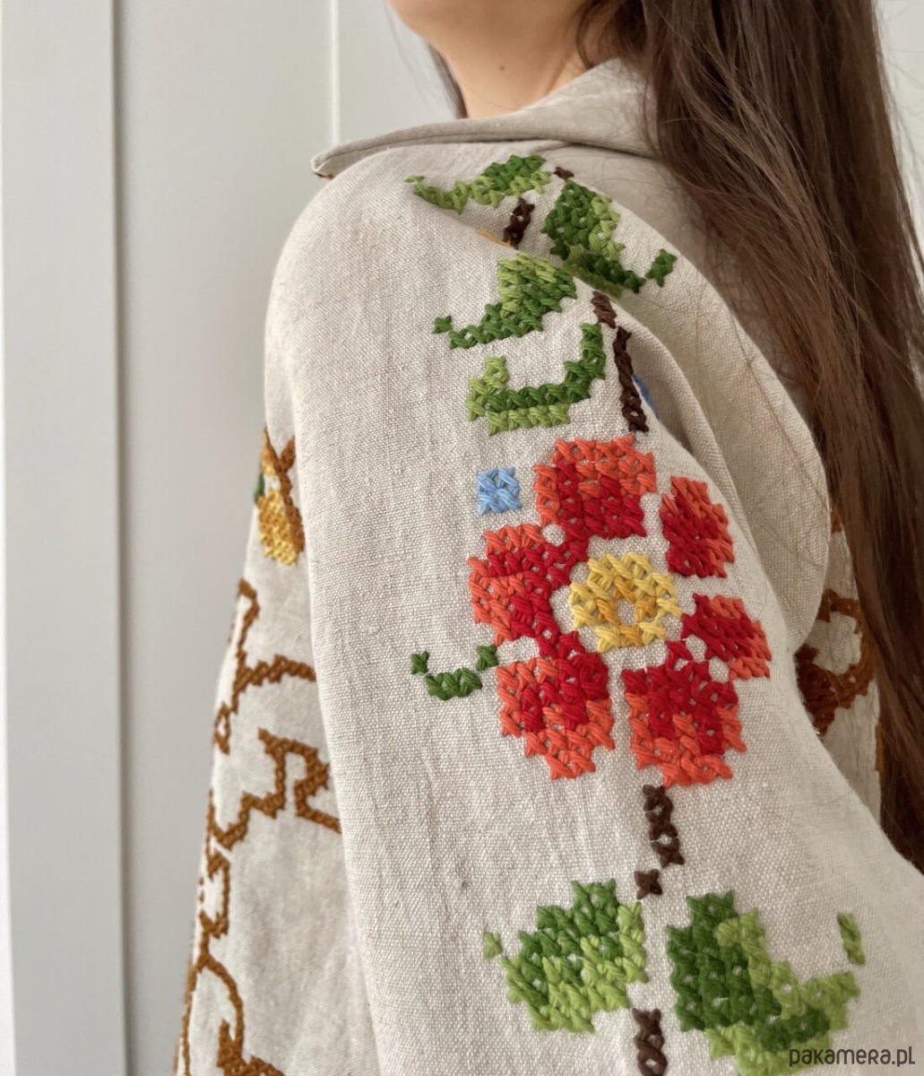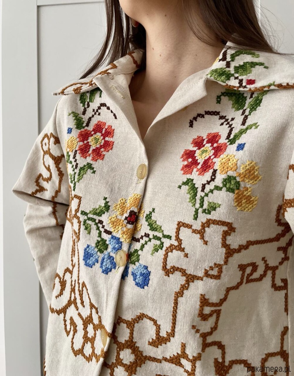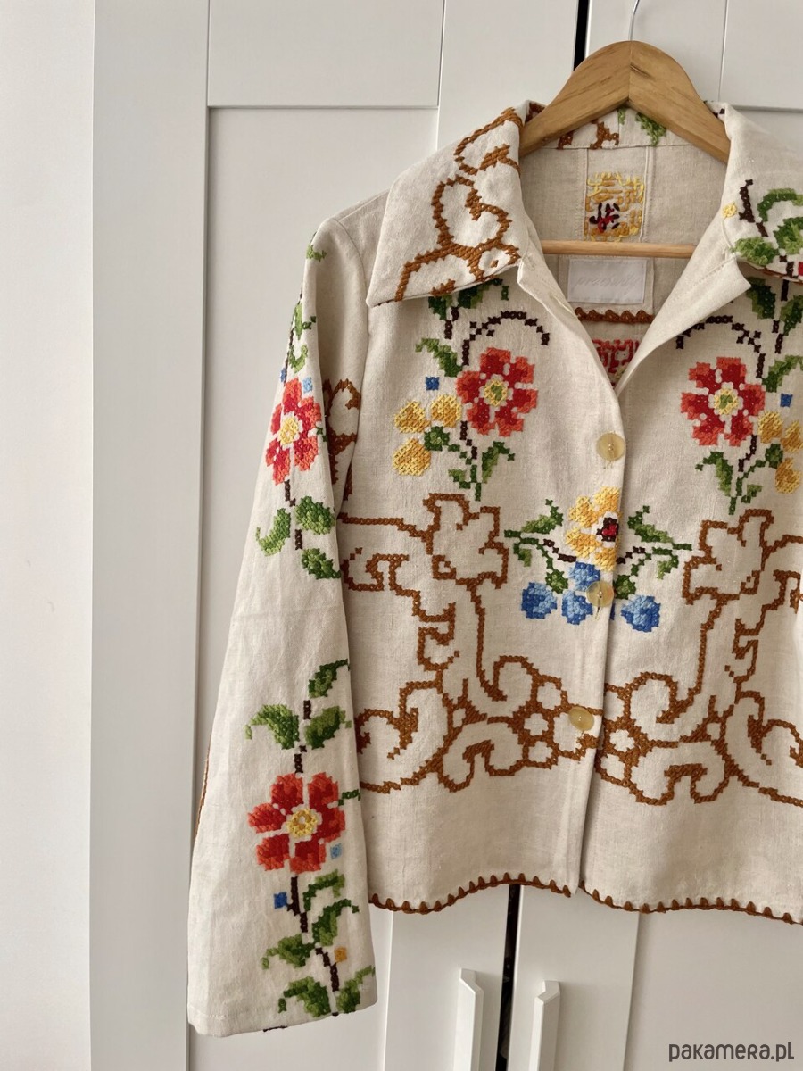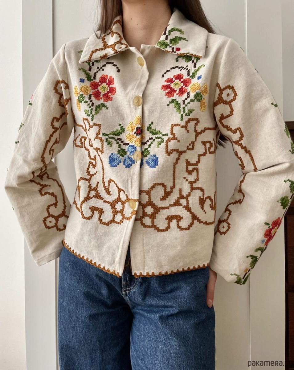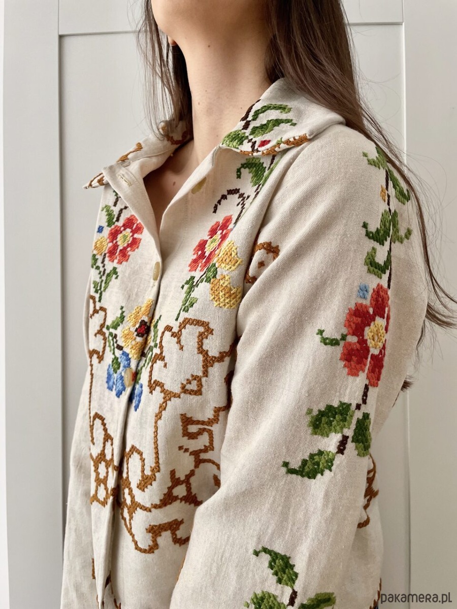 Koszula z długim rękawem uszyta ręcznie z haftowanego obrusa z drugiego obiegu.