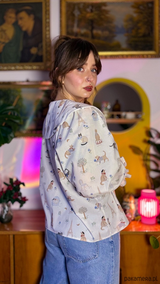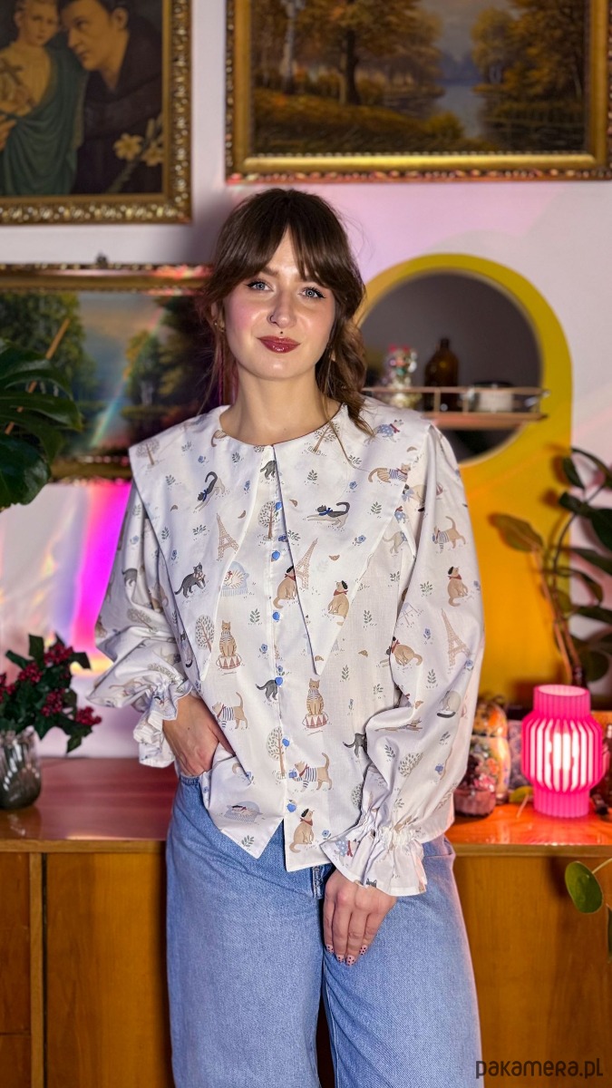 Ten model to kwintesencja uroku-głownie ze względu na zwierzęcy wzór, jest idealna dla fanek kotów. Jednak niewątpliwie największym atutem koszuli są bardzo obszerne, bufiaste rękawy, z obniżoną linią pachy i mankietami wykończonymi gumką i falbanką. Do tego nie zapominajmy o kołnierzu! Tym razem wykończonym na gładko, bez falbanki.