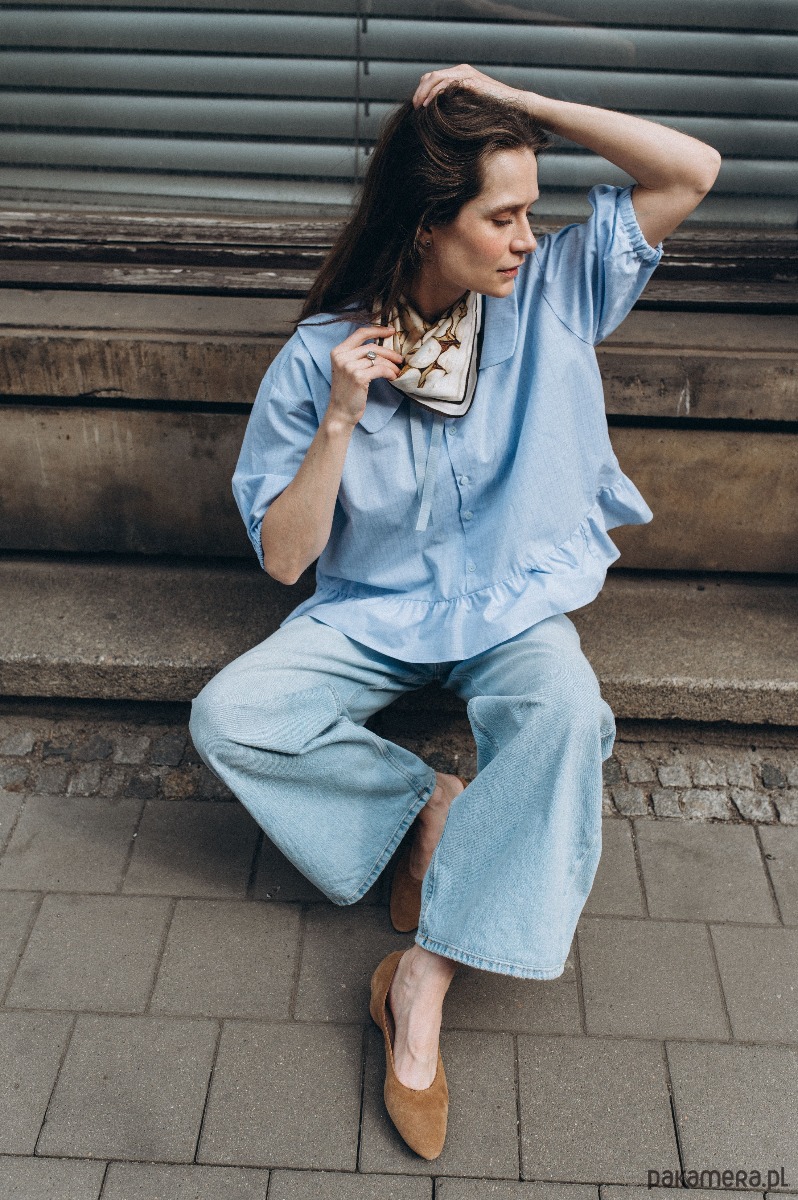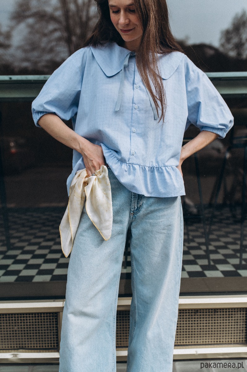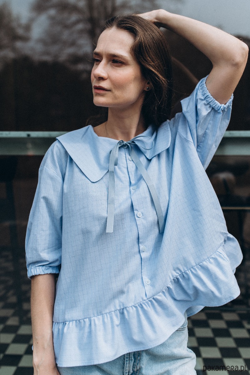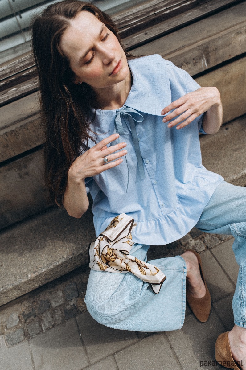 Koszula jest w delikatnym pastelowym kolorze, posiada duży kołnierz,krótkie bufiaste rękawy, taśmę do zawiązania przy szyi oraz fałbanę na dole.
