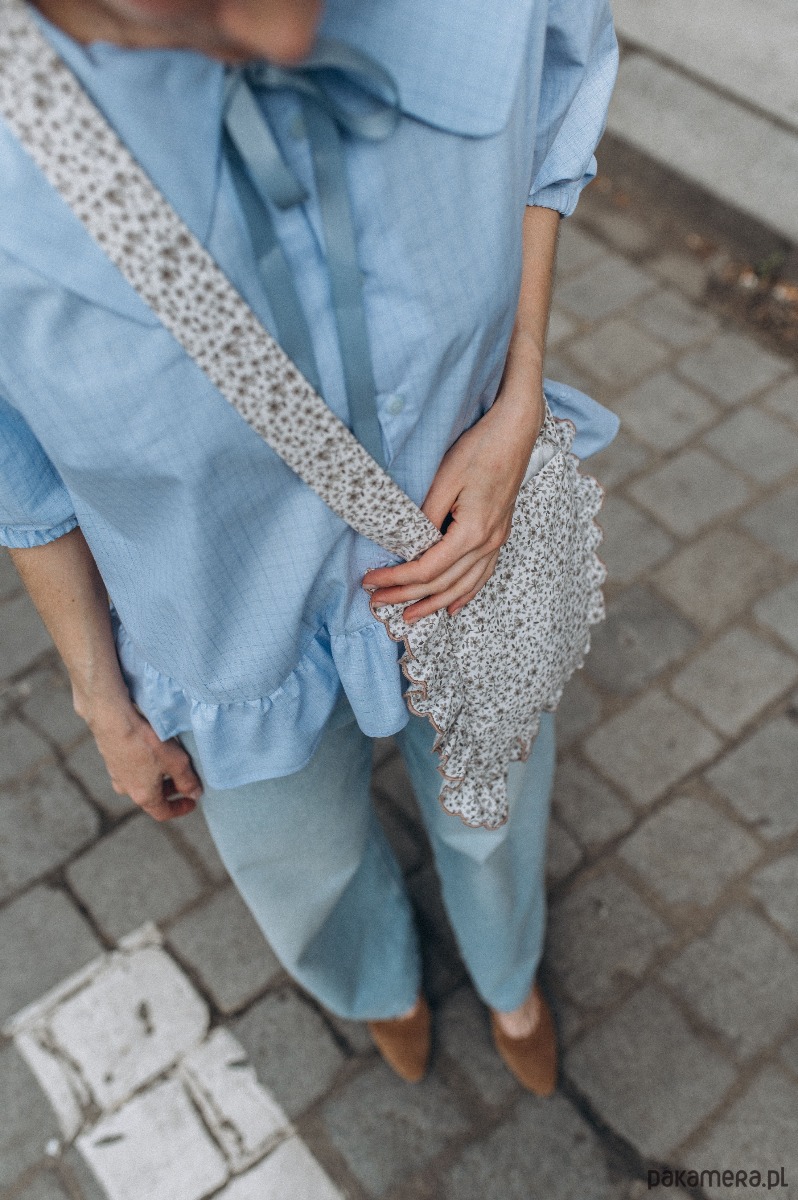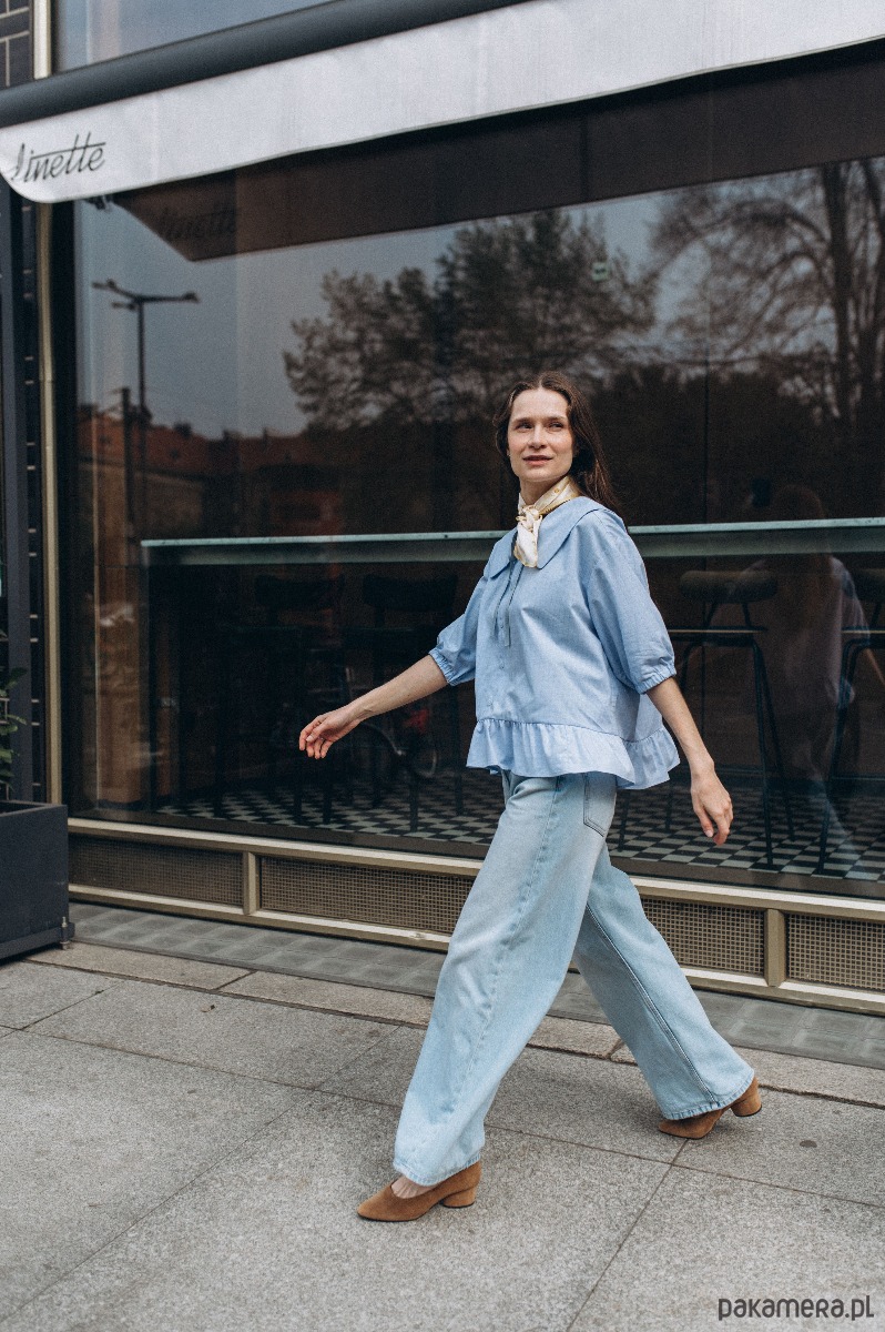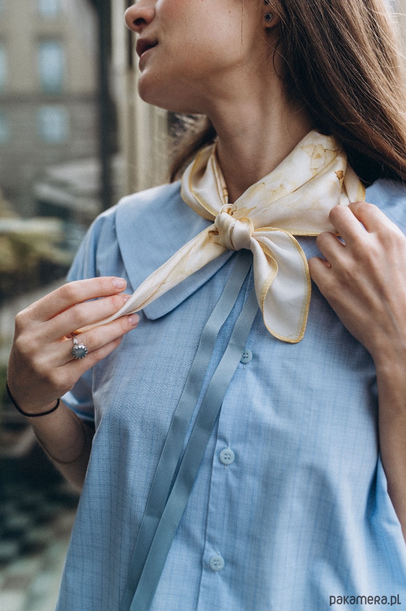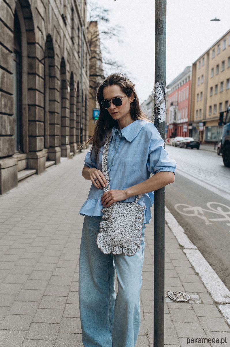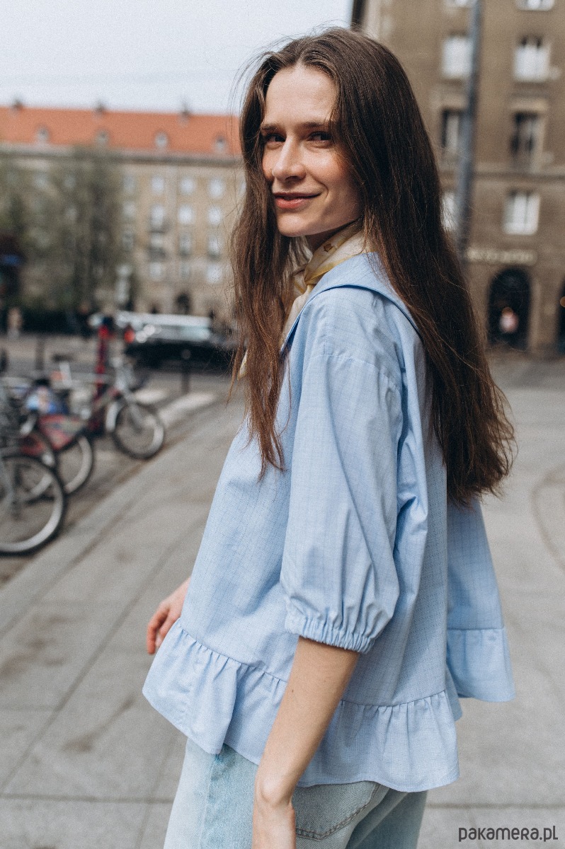 Koszula jest w delikatnym pastelowym kolorze, posiada duży kołnierz,krótkie bufiaste rękawy, taśmę do zawiązania przy szyi oraz fałbanę na dole.