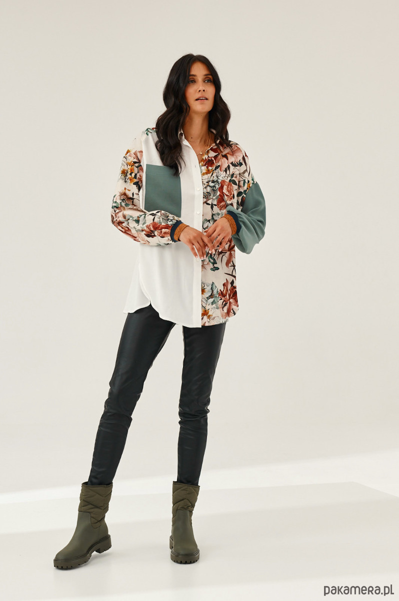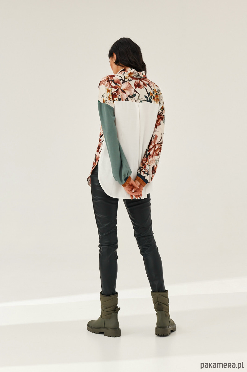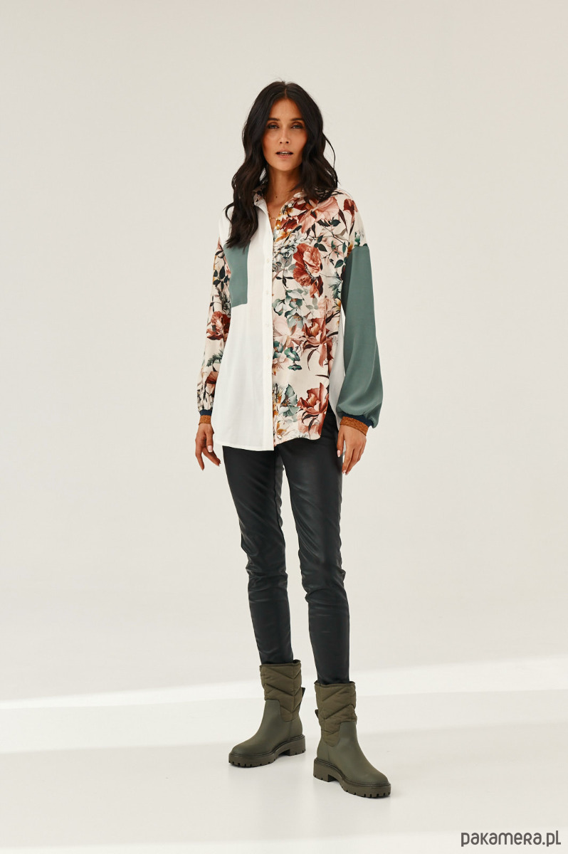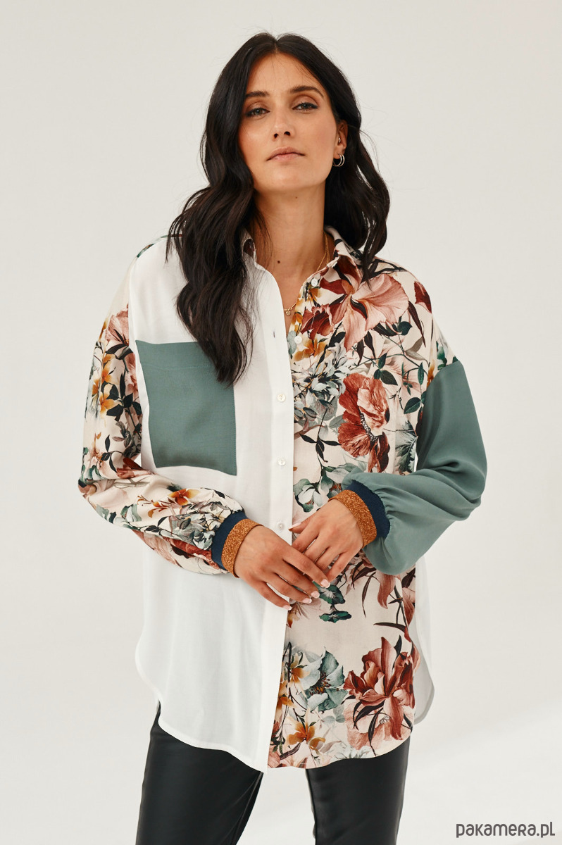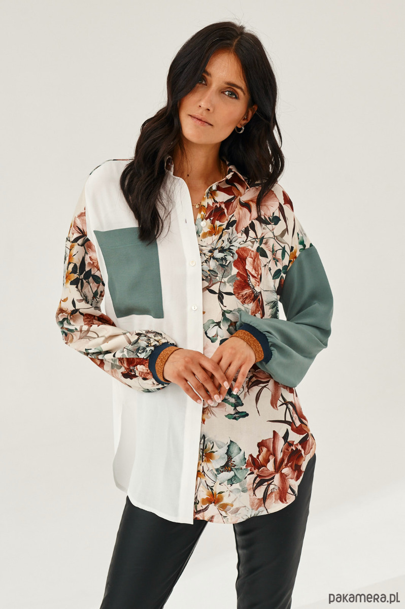 Koszula ABI z delikatnej wiskozowej tkaniny. To połączenie 3 tkanin wiskozowych : drukowana w kwiaty, gładka w kolorze jasnego khaki i gładka w kolorze ecru. Na jednym przodzie naszyta jest kontrastowa kieszonka. Szyja wykończona kołnierzykiem, natomiast rękawy zakończone efektownym i komfortowym ściągaczem. Koszula zapinana na przodzie na guziki.