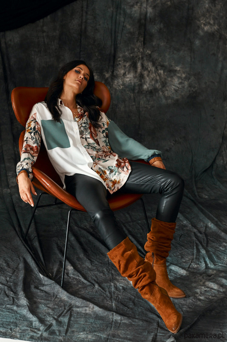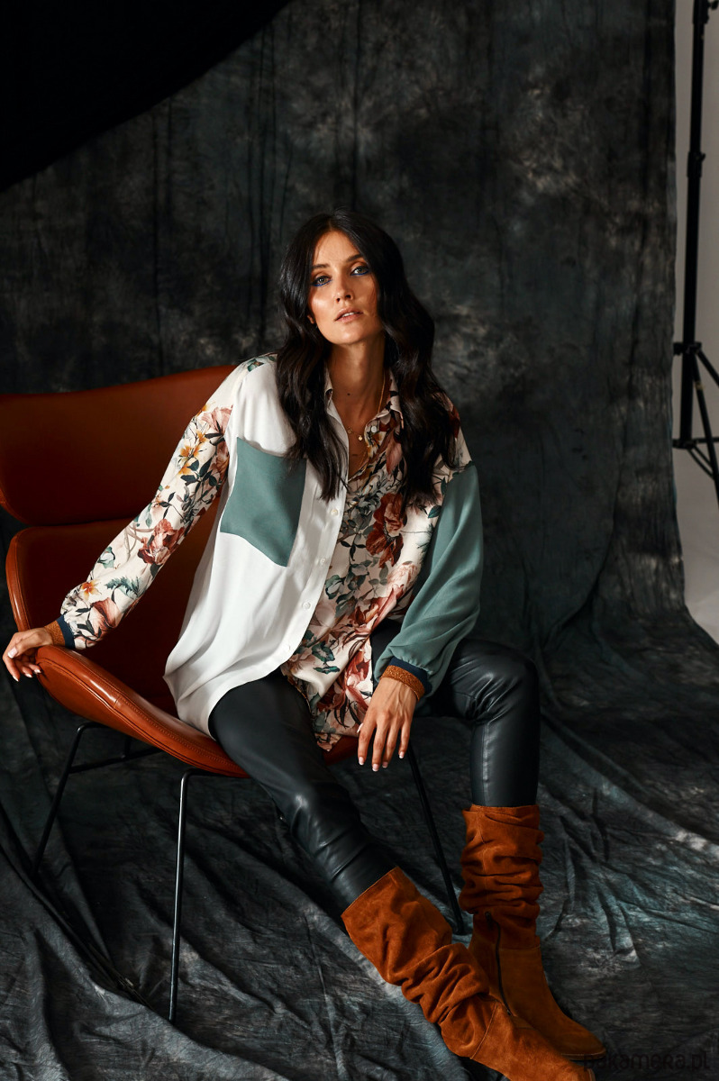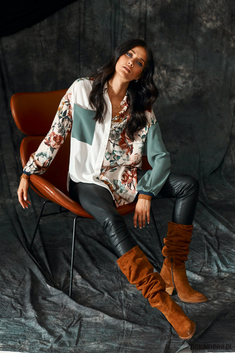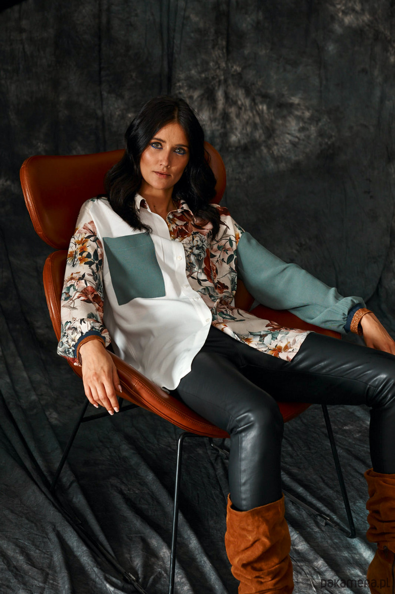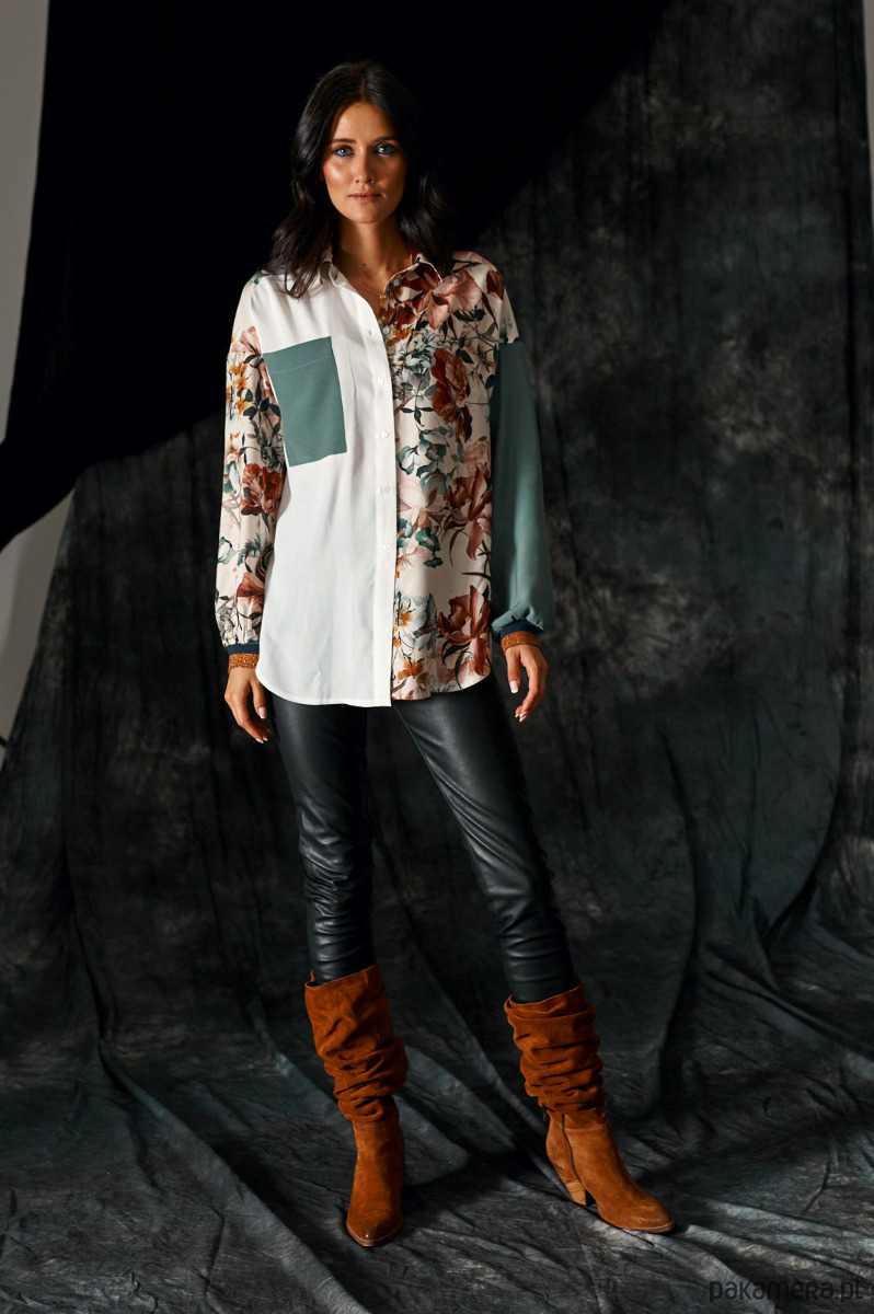 Koszula ABI z delikatnej wiskozowej tkaniny. To połączenie 3 tkanin wiskozowych : drukowana w kwiaty, gładka w kolorze jasnego khaki i gładka w kolorze ecru. Na jednym przodzie naszyta jest kontrastowa kieszonka. Szyja wykończona kołnierzykiem, natomiast rękawy zakończone efektownym i komfortowym ściągaczem. Koszula zapinana na przodzie na guziki.