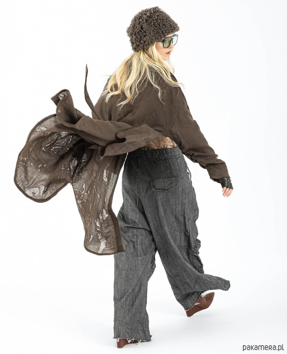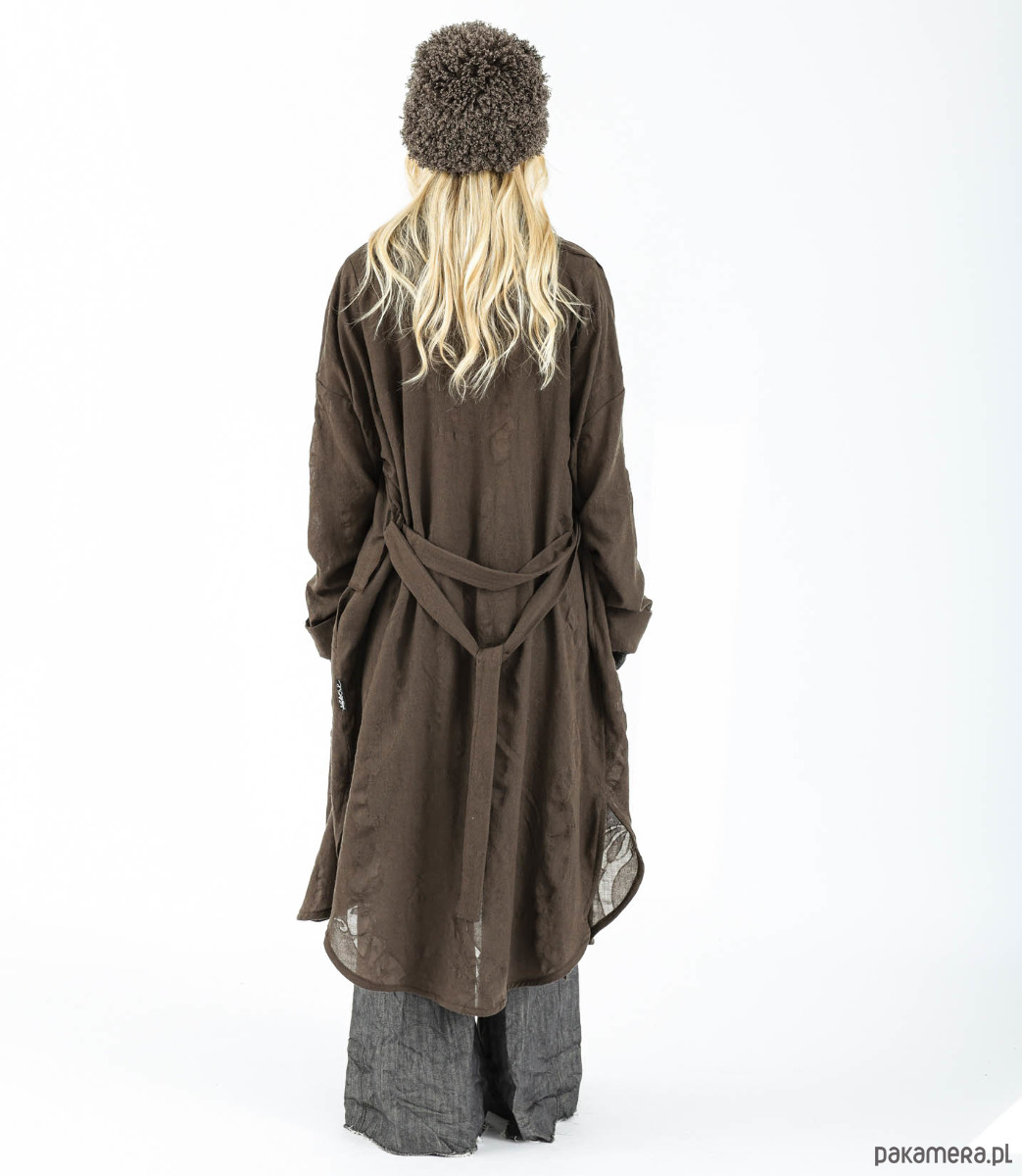 Długa koszula/płaszcz z niezależnym szalikiem, wykonana z ażurowej wełny z widocznymi prześwitami. Wełna ma bardzo ciekawą strukturę, jest lekka i przyjemna w dotyku. Zapięcie centralne na magnesy, kieszenie w szwach bocznych. Dodatkowe wiązanie paskiem.