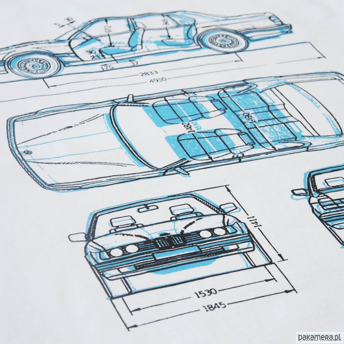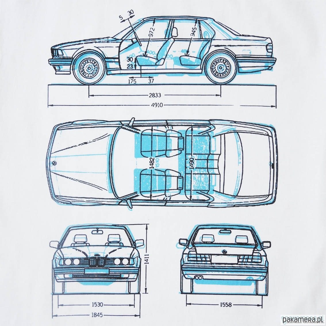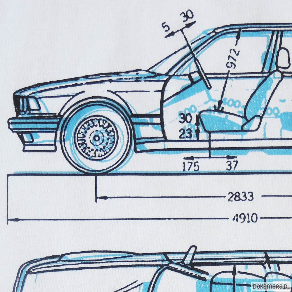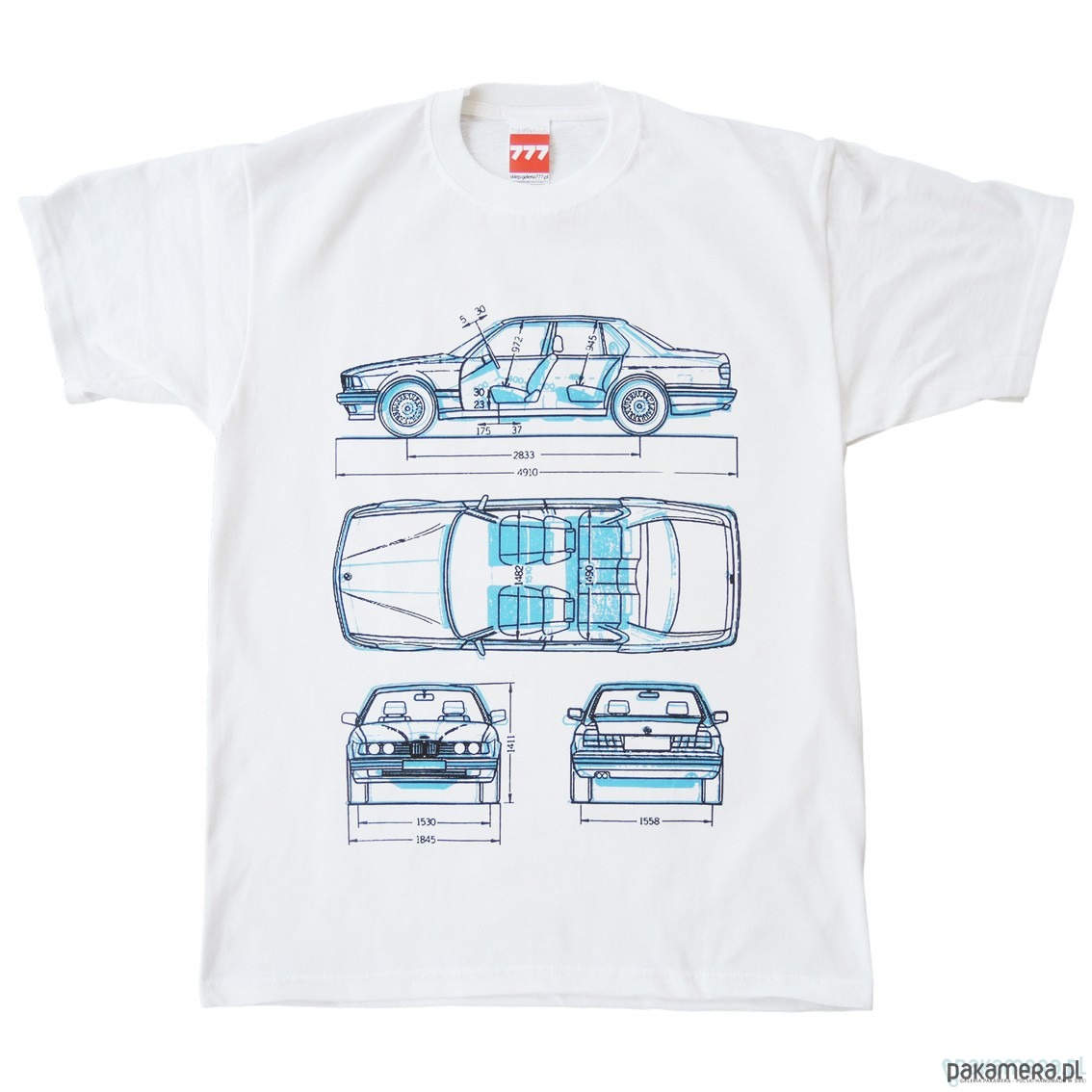 Spotkanie legendarnych limuzyn, czyli dwóch modeli BMW serii 7 - rekinowatego E23 i jego następcy E32. Delikatny w dotyku, trwały nadruk na białej koszulce 100% bawełny, gramatura 160 g. Projekt: 777.