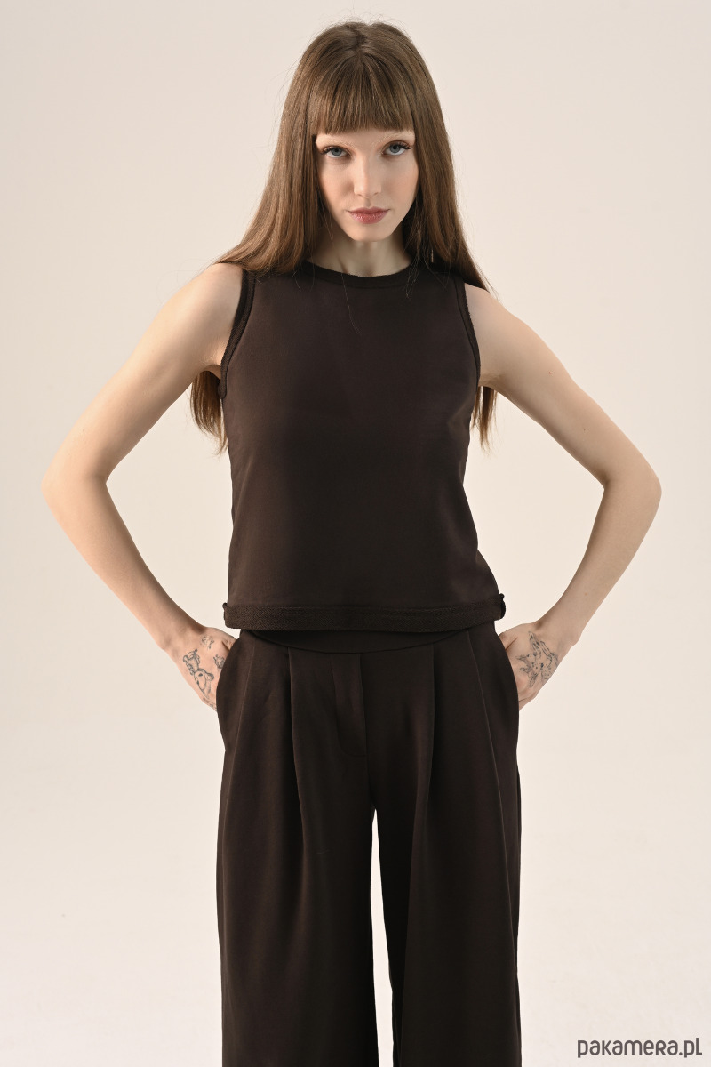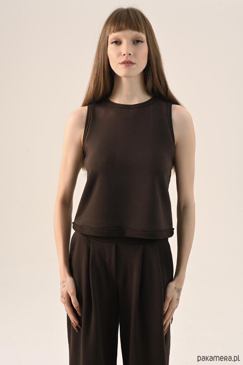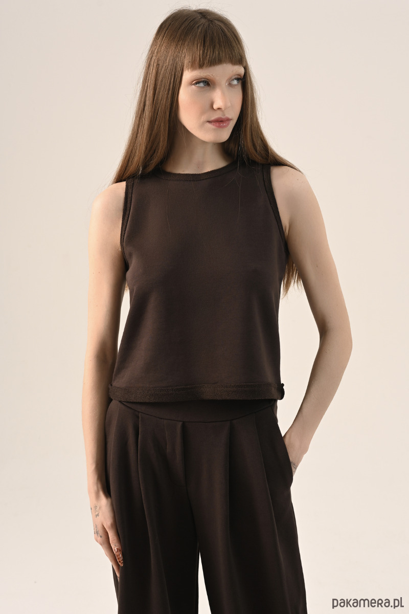 Brązowy top bez rękawów to propozycja dla osób, które cenią sobie wygodę.