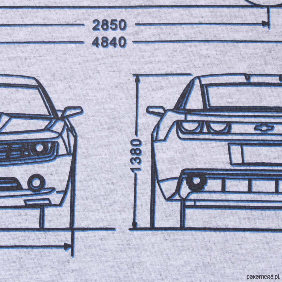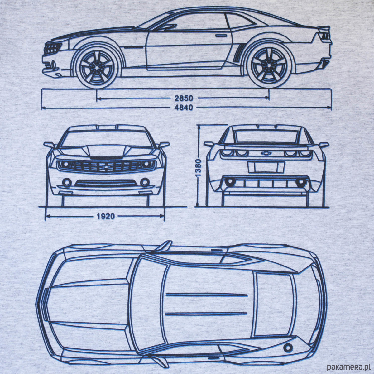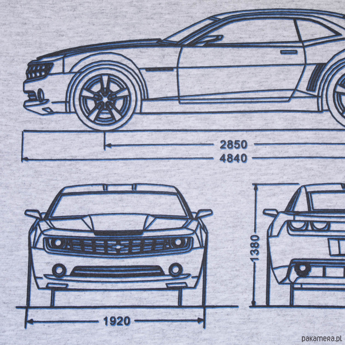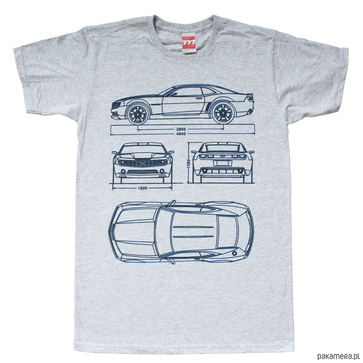 Chevrolet Camaro - amerykańska legenda pisana od połowy lat 60ych. Rzadki przykład modelu, którego każda generacja jest niemal równie udana pod względem designerskim i technicznym. Tu Camaro generacji V z lat 2010-2015. Czarno niebieski nadruk na szarej koszulce 100% bawełny, gramatura 165 g. Projekt 777.