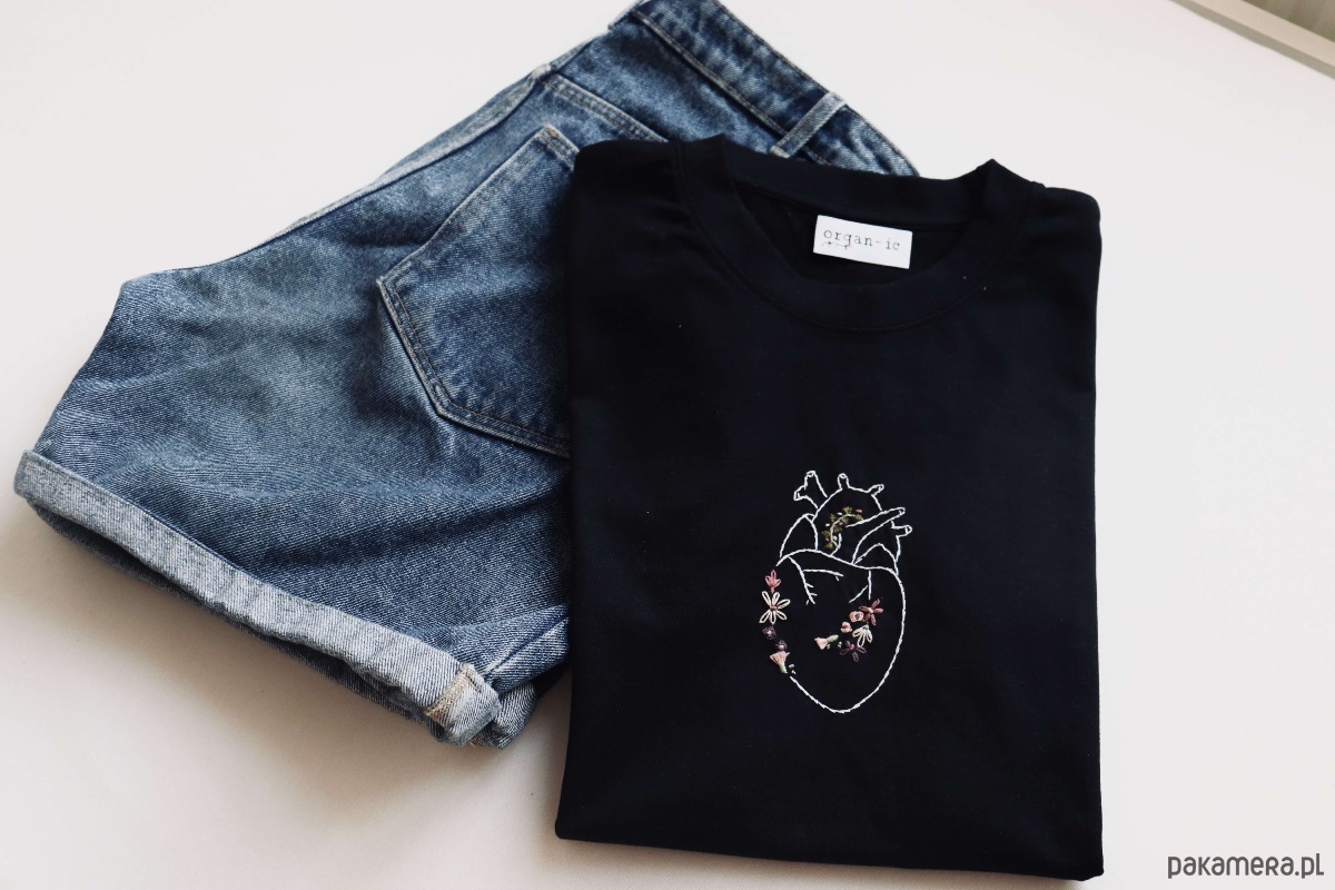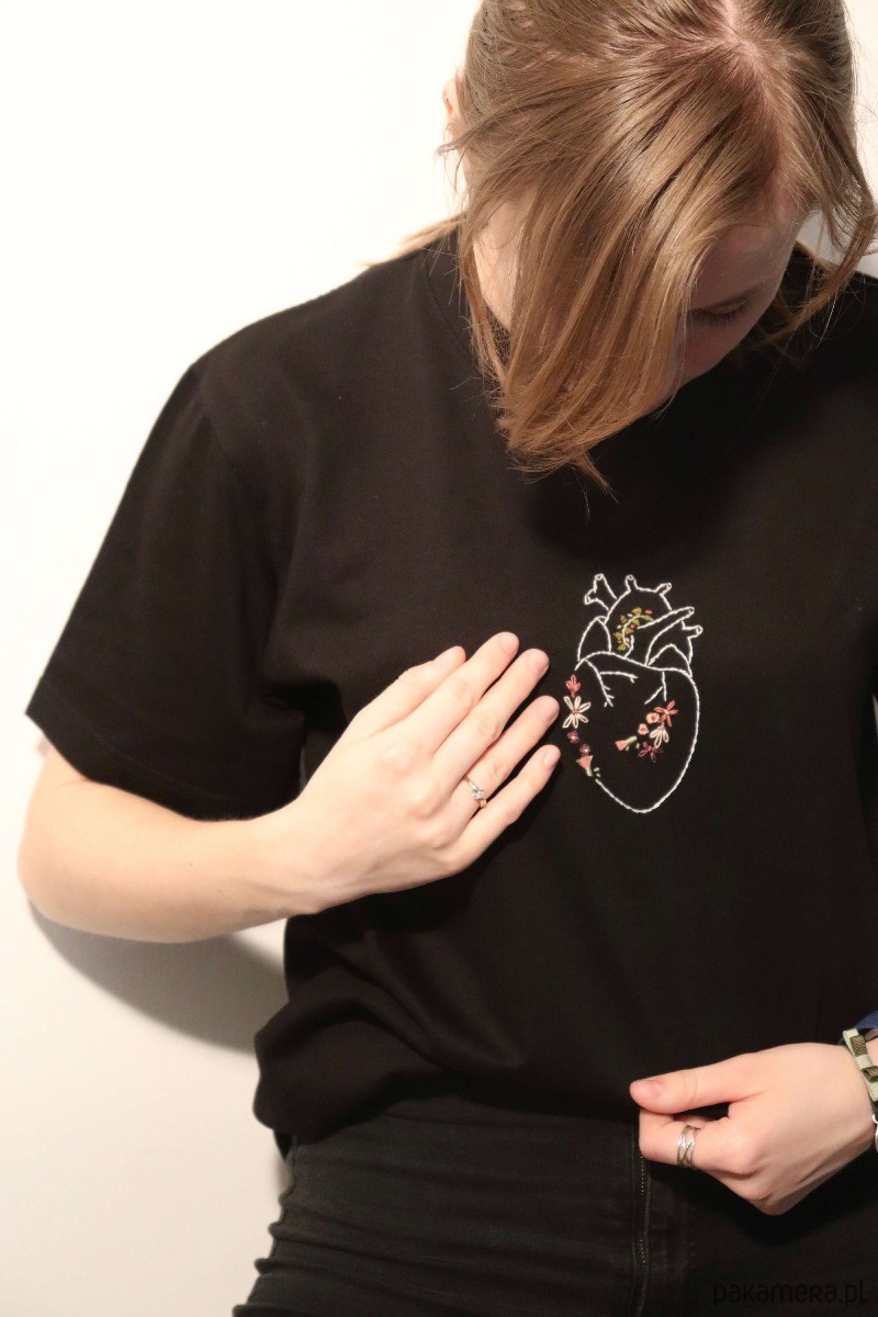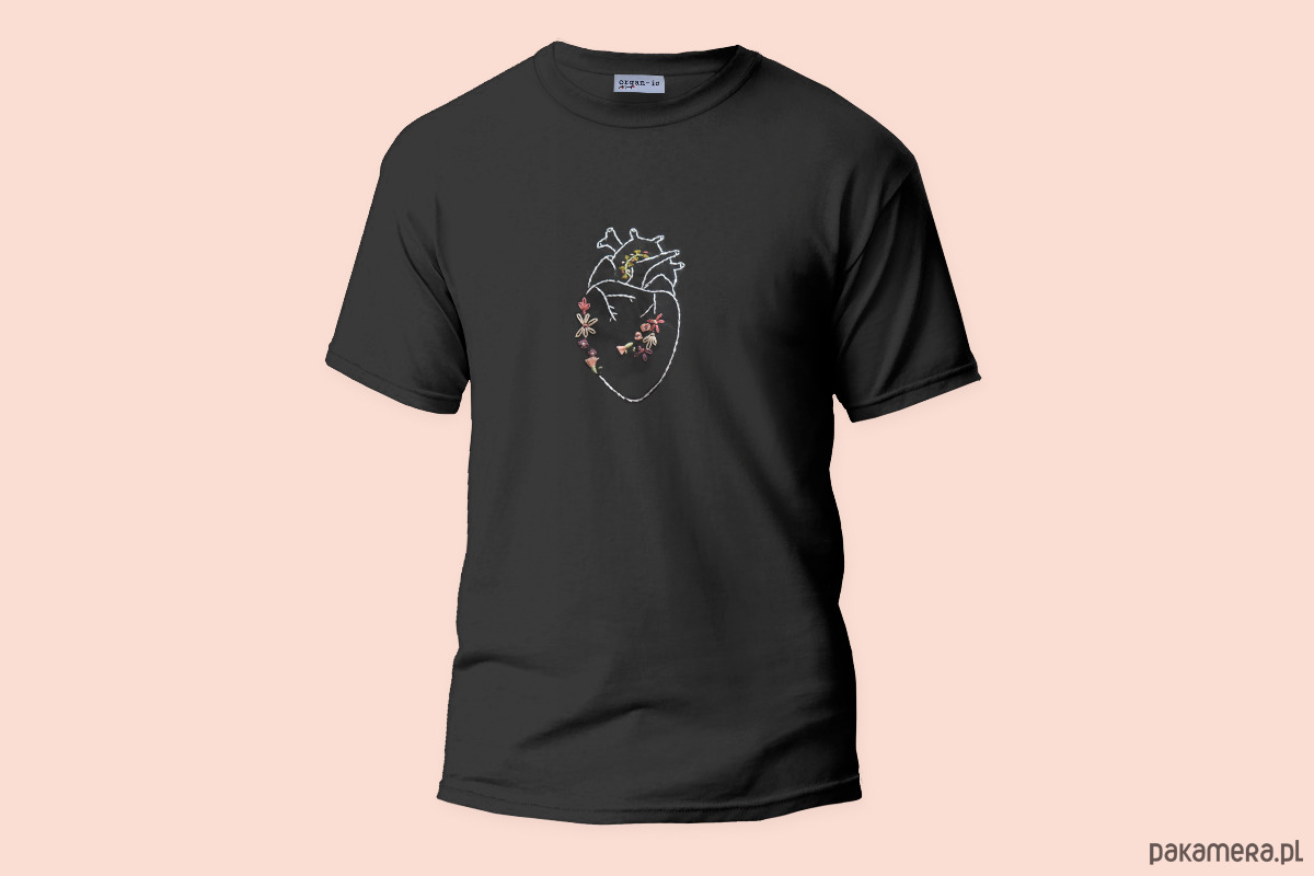 Ręcznie haftowana koszulka z anatomicznym wzorem serca, ubranego w kwiaty w pastelowe kolory.