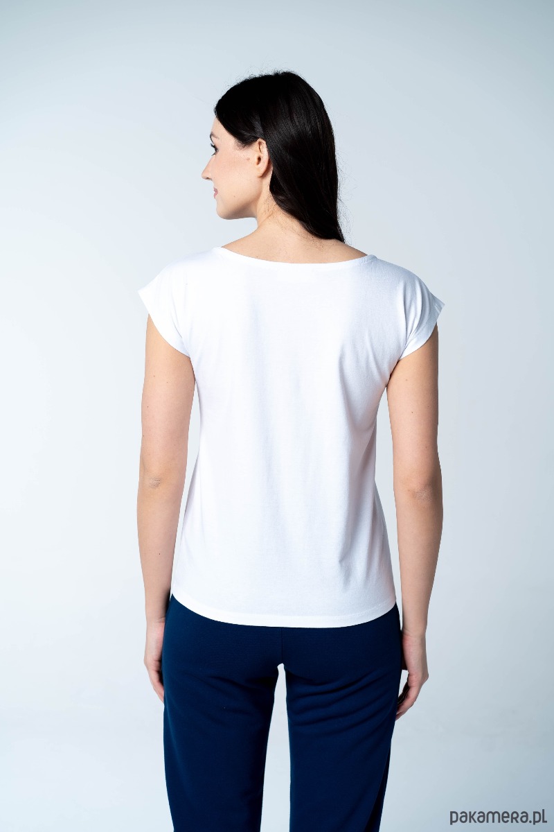 Koszulka charakteryzuje się wykończeniem z dbałością o każdy szczegół. Dekolt został obszyty taśmą z dzianiny, z której wykonano cały t-shirt. Gwarantuje to utrzymanie formy ubrania przez bardzo długi czas użytkowania, bez ryzyka rozciągnięcia się dekoltu, co często się zdarza w przypadku koszulek wykończonych ściągaczami.