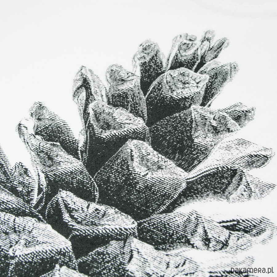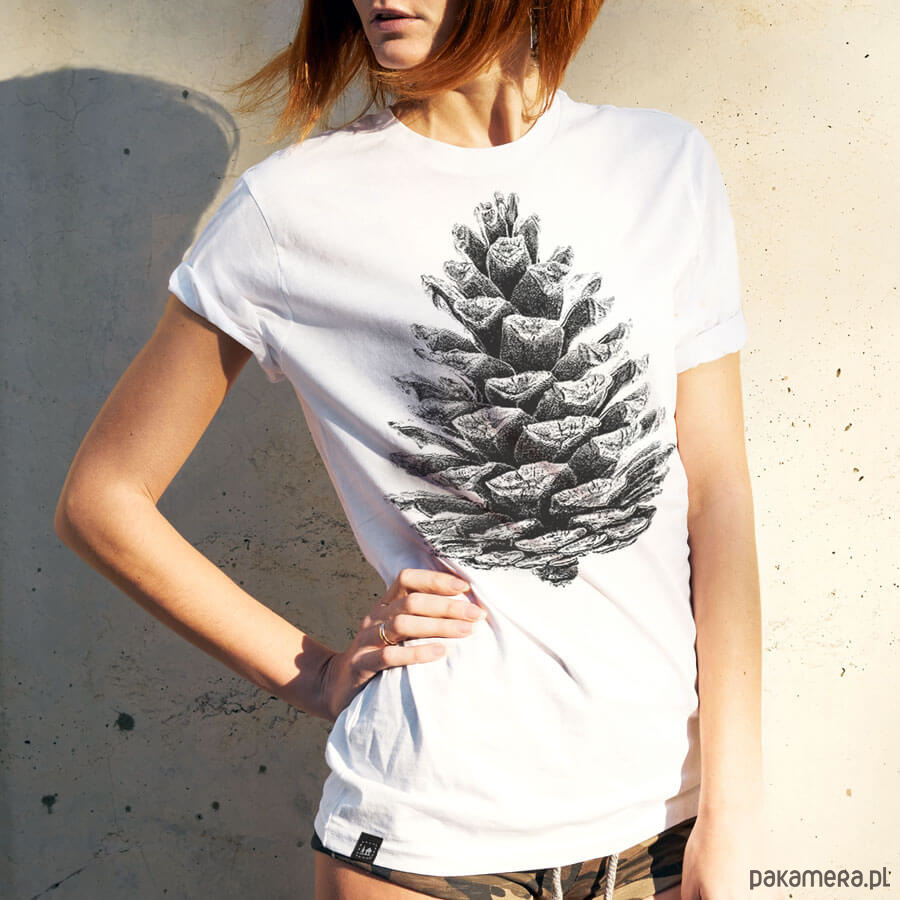 Koszulka damska w białym kolorze z nadrukiem przedstawiającym dojrzałą szyszkę sosny zwyczajnej. Szyszki ze względu na pełnioną funkcję (w ich wnętrzu znajdują się nasiona), w przeszłości symbolizowały życie, nieśmiertelność oraz przede wszystkim płodność. Obecnie jednoznacznie kojarzą się z drzewami iglastymi i borami, dlatego model ten przypadnie do gustu wszystkim osobom, które w kniei czują się jak w domu. Jeśli lubisz leśne szwendaczki oraz kochasz panującą w lesie ciszę i spokój, to zdecydowanie jest to model dla Ciebie. Nasze koszulki bawełniane są w 100% polskim produktem. Charakteryzuje je:- przedłużony, lekko zaokrąglony u dołu krój oraz podwinięte rękawki (typowo damski fason)- gramatura 180g/m2- niespieralny nadruk wykonany w technice sitodruku- karczek z motywami leśnymi (liście, szyszki, żołędzie itp.)- dekolt wzmocniony podwójnym szwem- wykonanie z wysokogatunkowej bawełny czesanej- miękkość i przyjemność w dotyku- skład: 100% bawełna
