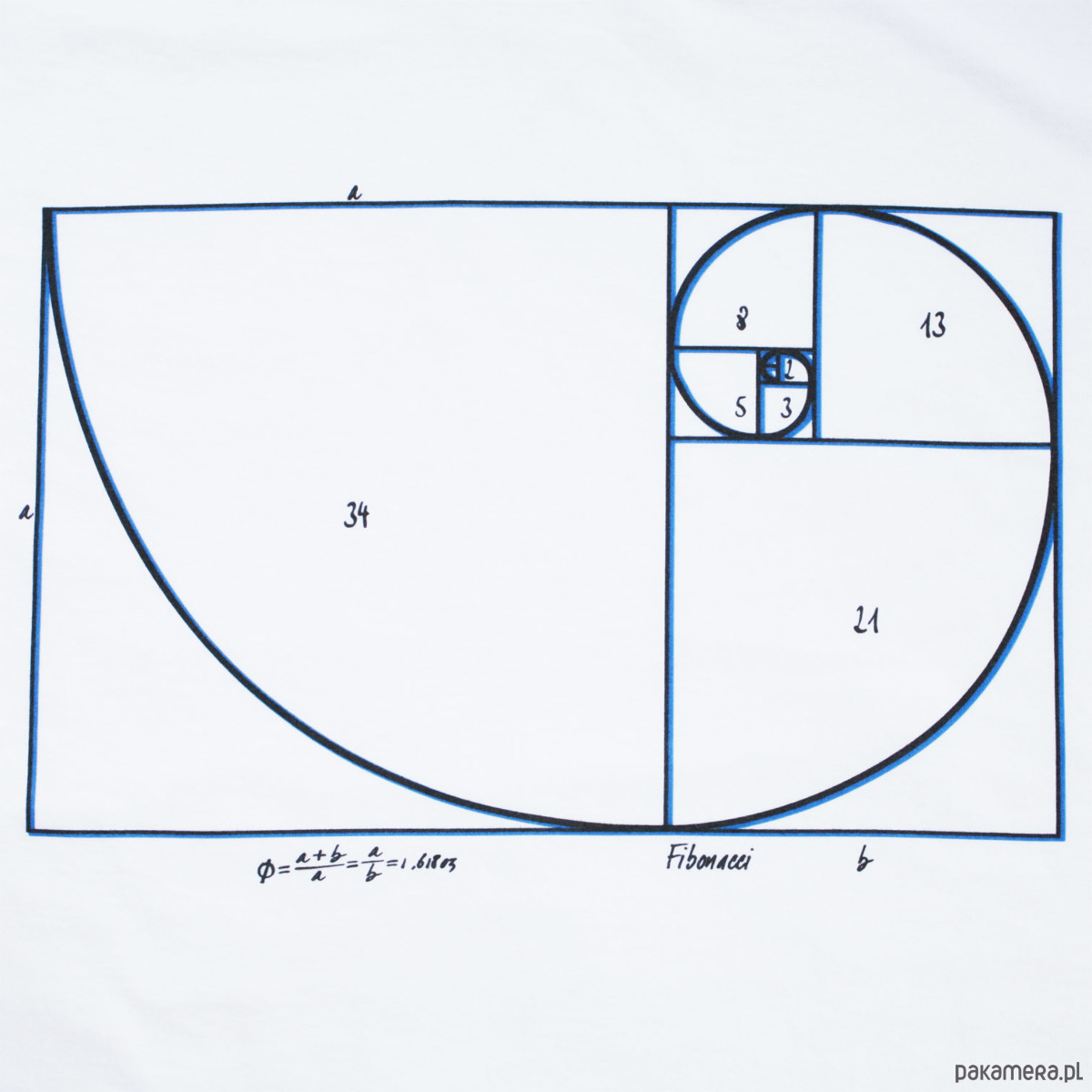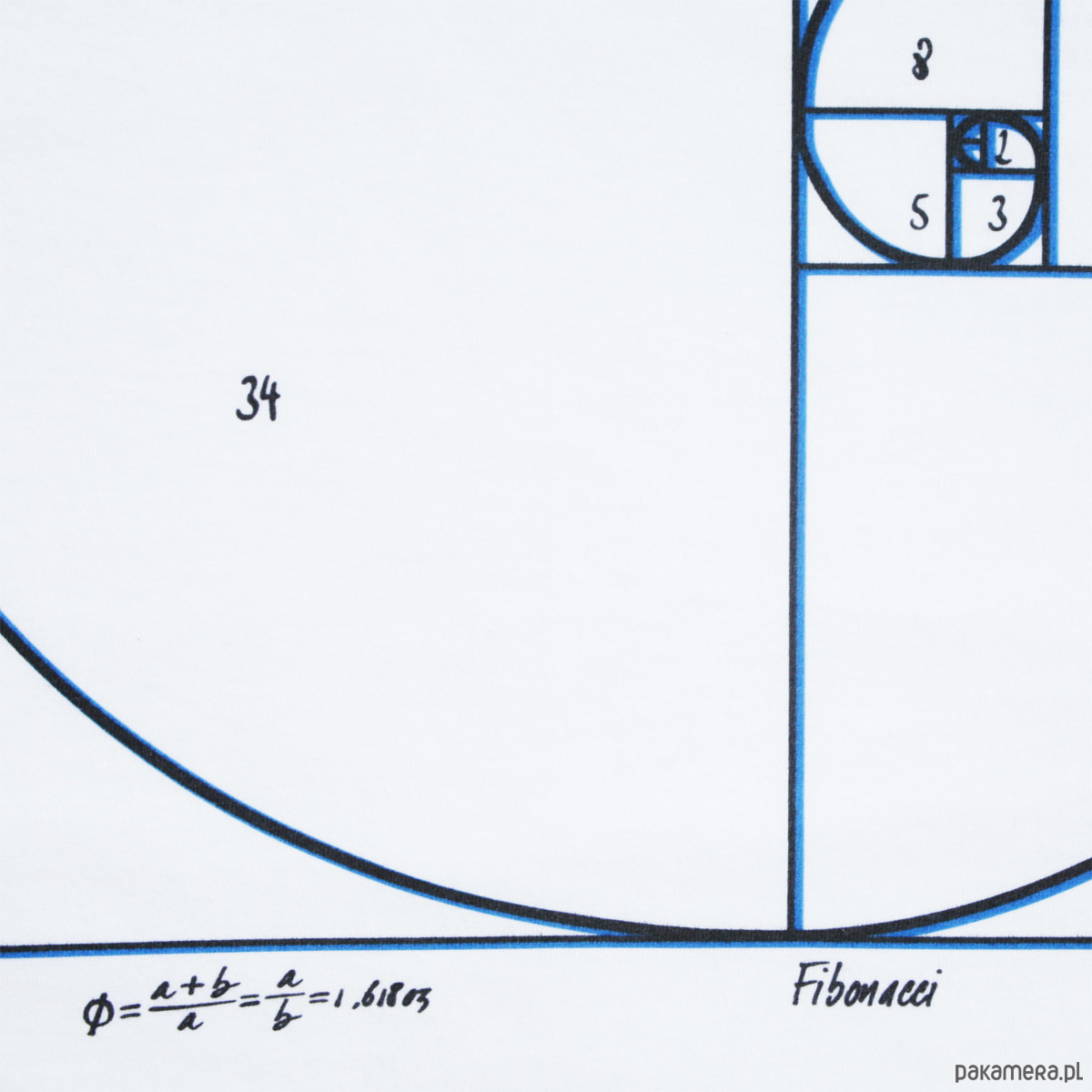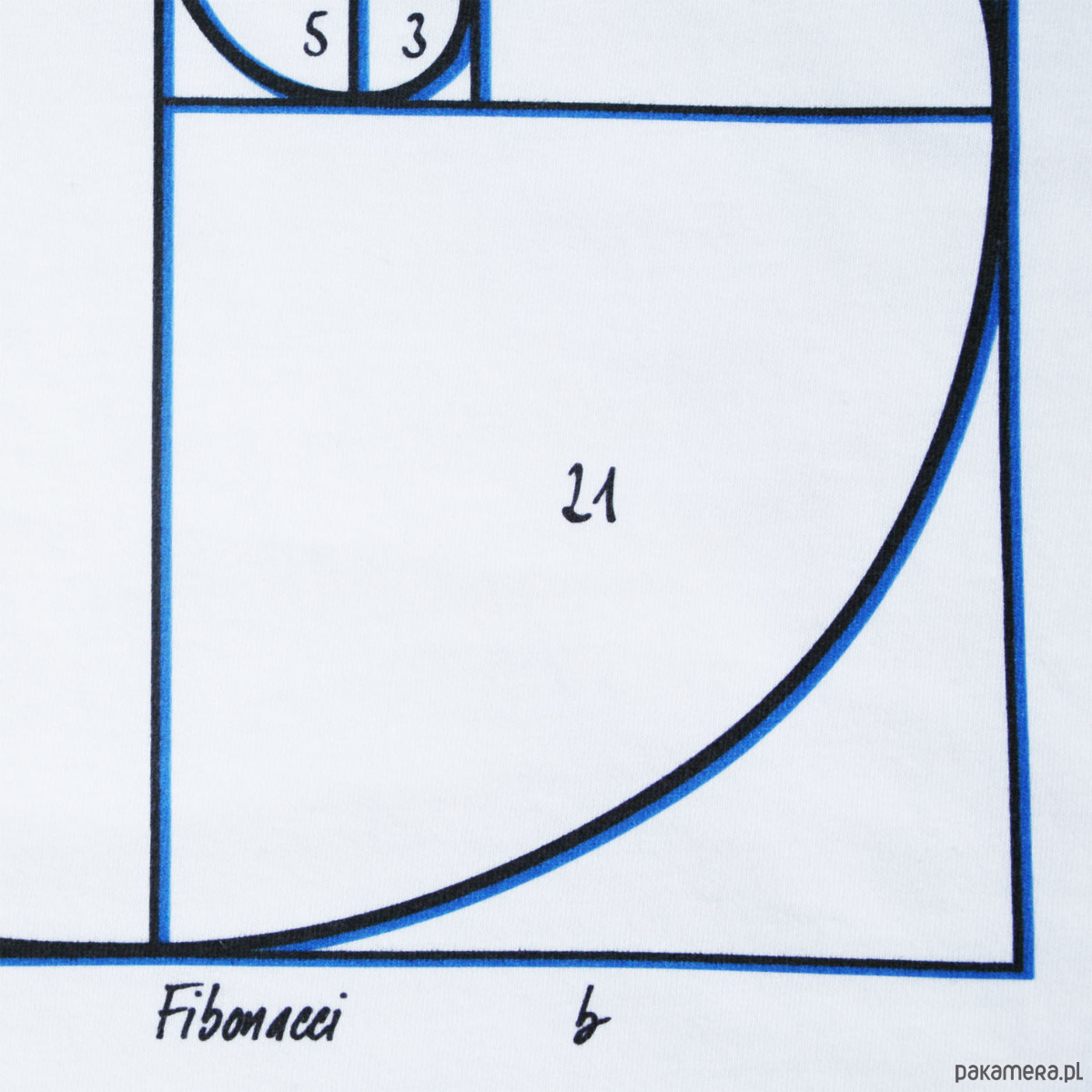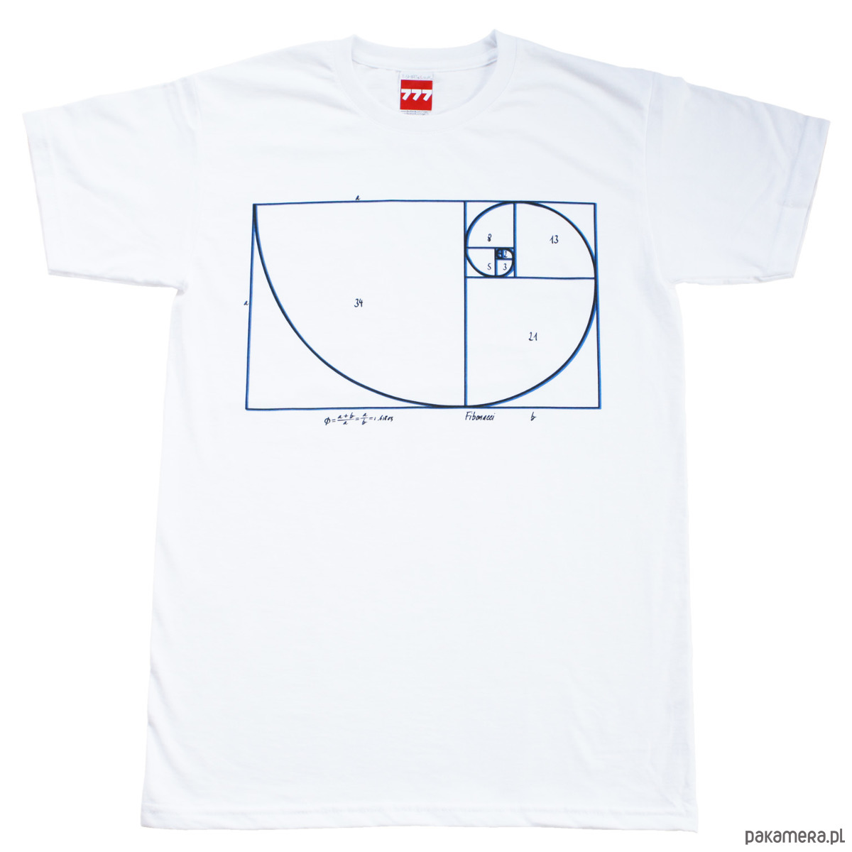 Spirala Fibonacciego to graficzne odzwierciedlenie idealnych, złotych proporcji. Używają jej artyści, fotografowie przy kompozycji kadru. Występuje w naturze (np. rośliny, muszle) i na koszulkach 777. Delikatny w dotyku, czarno niebieski nadruk na białej koszulce 100% bawełny, gramatura 160 g. Projekt: 777.