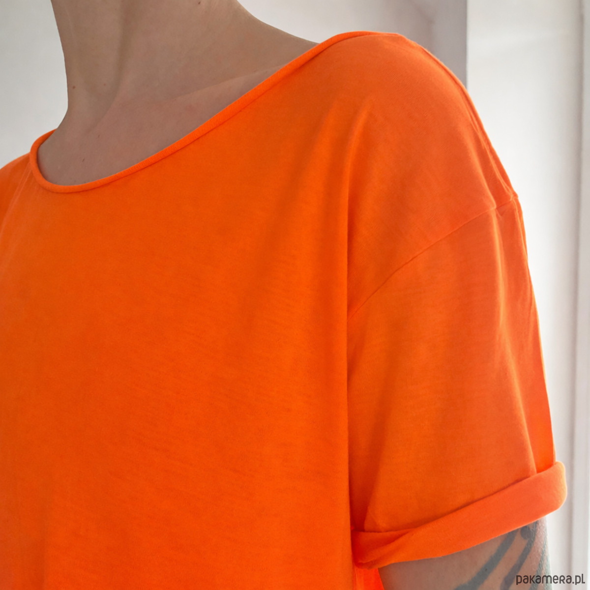 Damska koszulka oversize bez nadruku w intensywnym, fluo pomarańczowym kolorze to mocny akcent w garderobie.