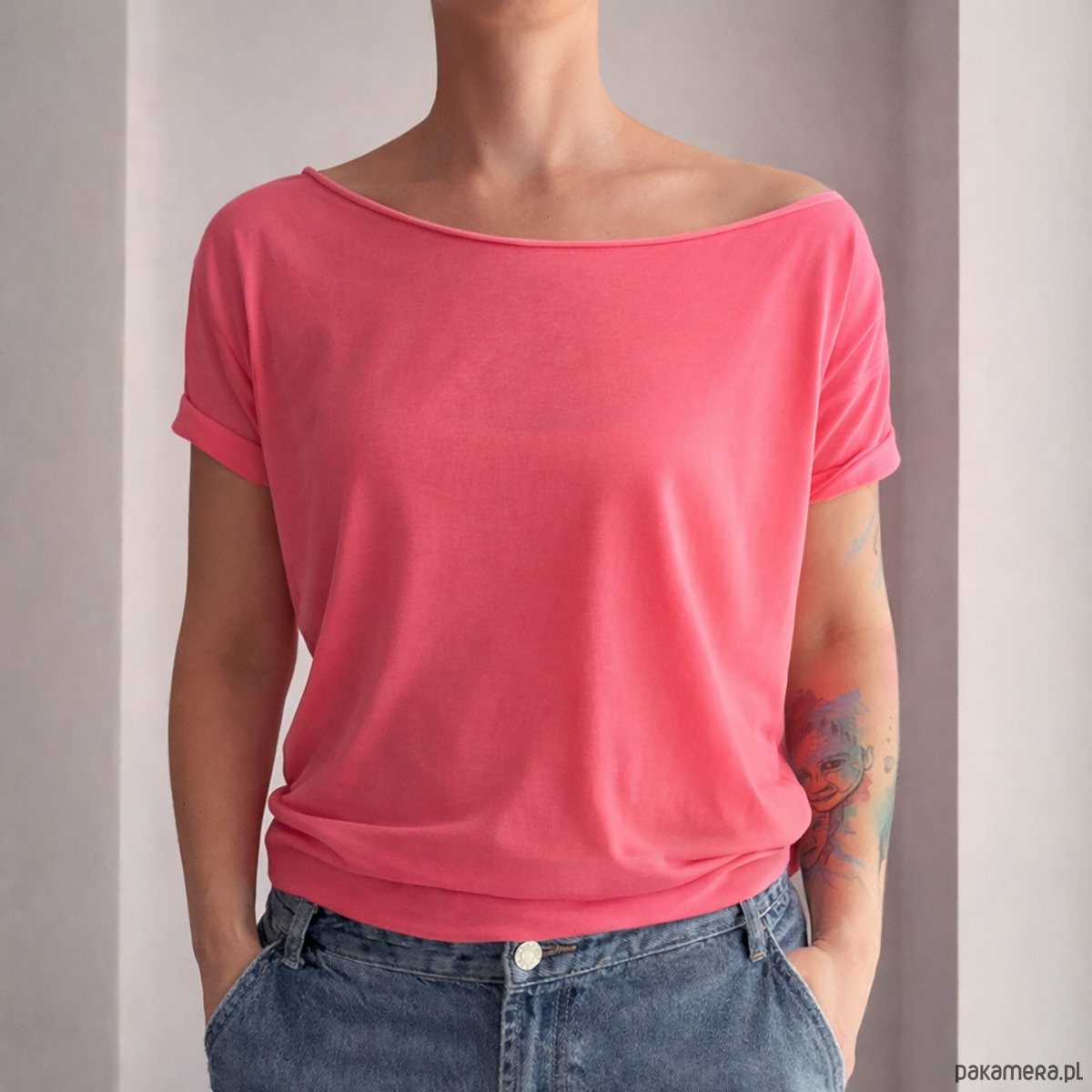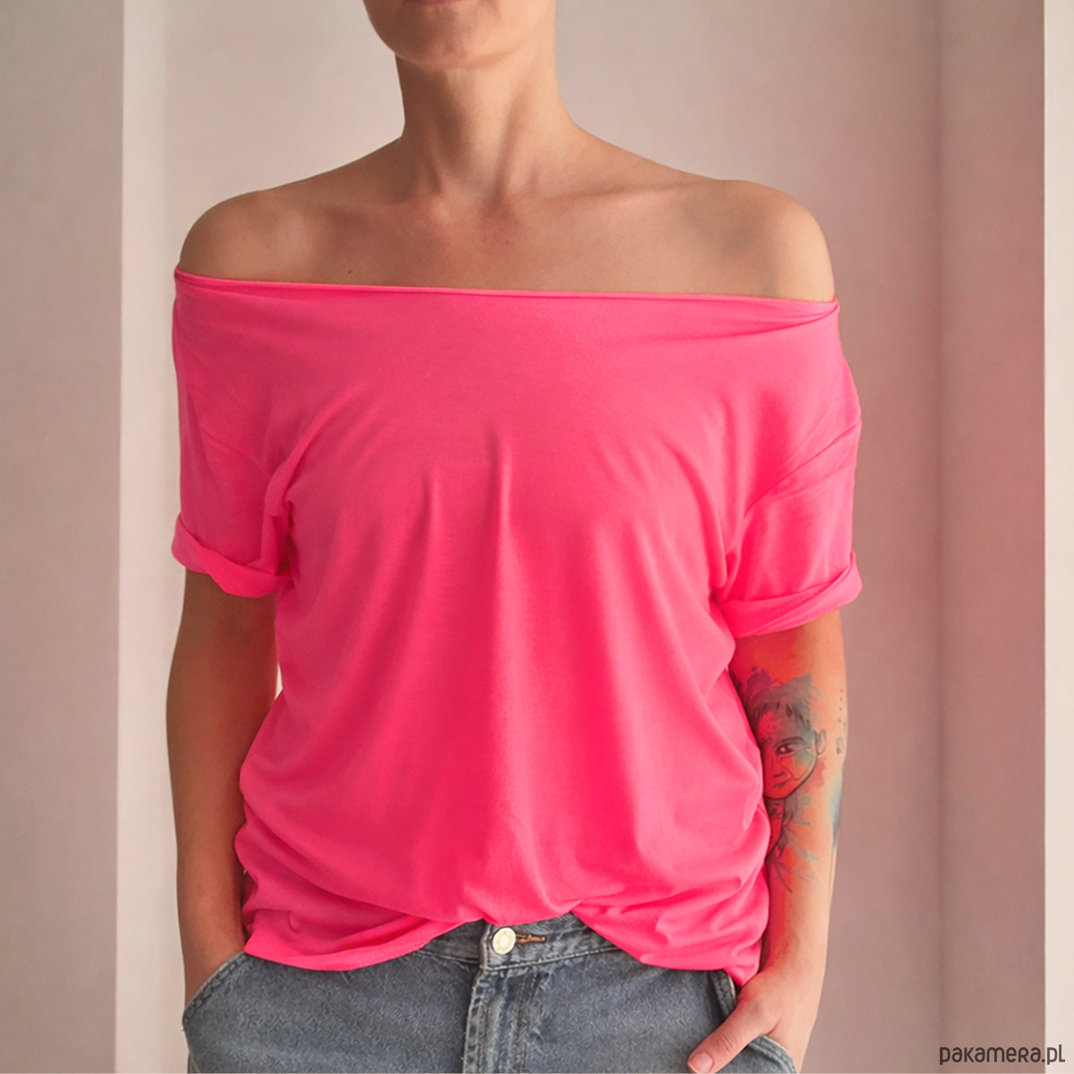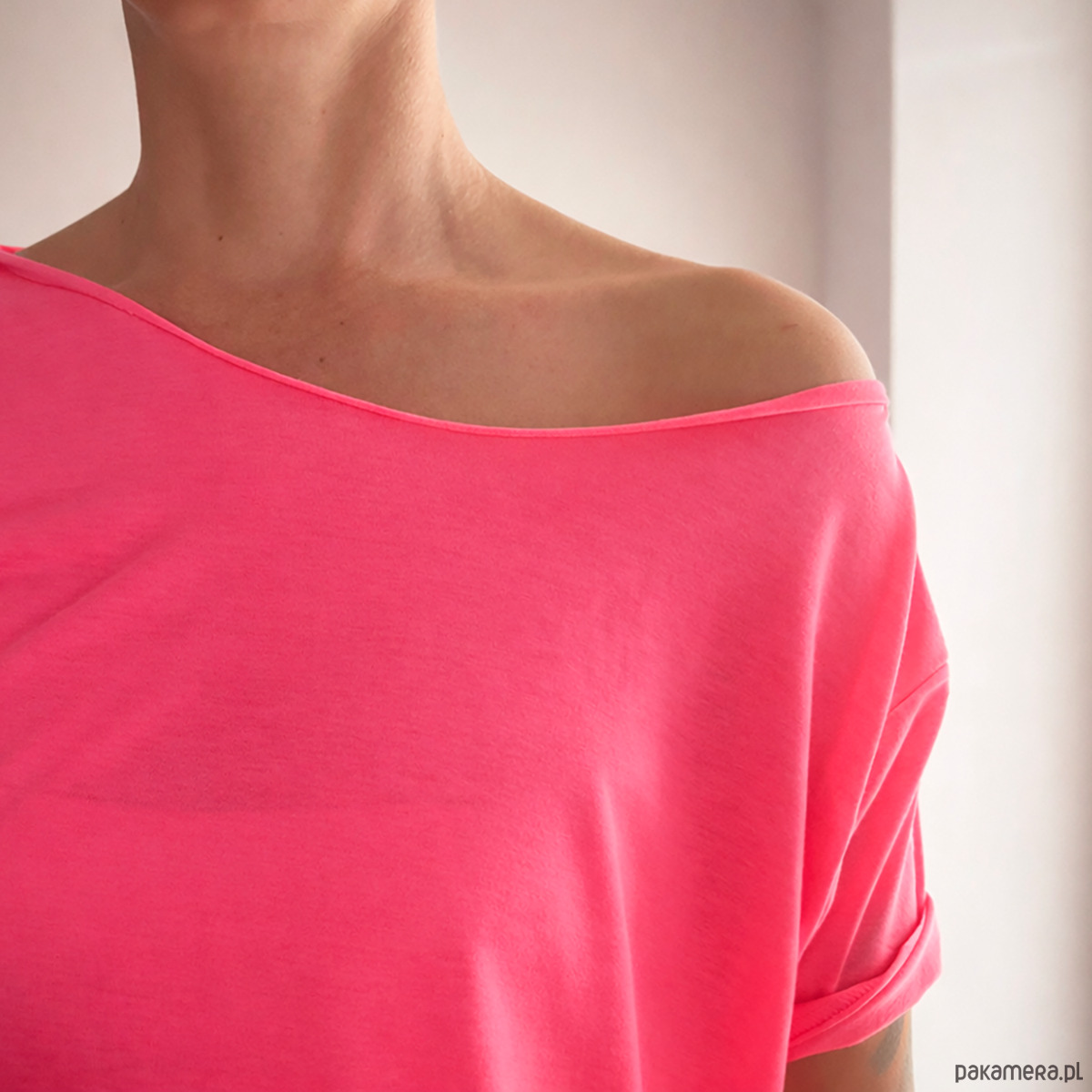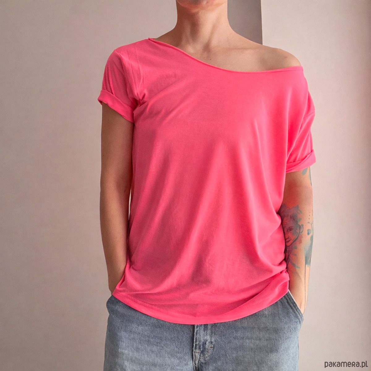 Damska koszulka oversize bez nadruku w intensywnym, fluo różowym kolorze to wyrazisty element garderoby.