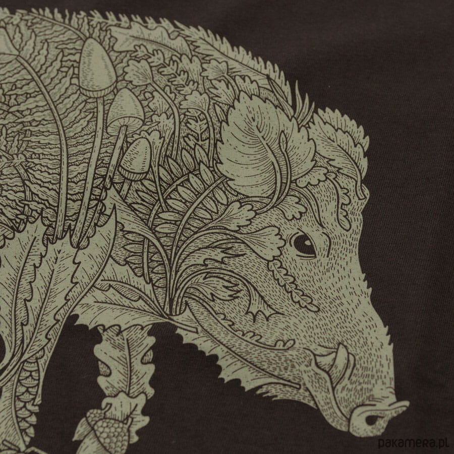 Koszulka męska w brązowym kolorze z nadrukiem przedstawiającym dzika. T-shirt przypadnie do gustu leśnikom, grzybiarzom oraz wszystkim pozostałym miłośnikom szeroko pojętego outdooru. Dziki licznie występują na terenie całego kraju, w szczególności upodobały sobie lasy liściaste i mieszane. Żyją w stadach zwanych watahami, które liczą zazwyczaj od kilku do kilkudziesięciu osobników. Zwierzęta te posiadają bardzo groźny oręż. Chodzi oczywiście o charakterystyczne kły nazywane fajkami (kły górne) i szablami (kły dolne).Samiec dzika, czyli odyniec jest znacznie większy od samicy (lochy). W jednym miocie locha może urodzić nawet tuzin prosiąt (warchlaków). Wydłużone pyski ułatwiają dzikom rycie w ziemi w poszukiwaniu pokarmu. Ze względu na bardzo czuły węch, żerują one głównie w nocy, a w dzień odpoczywają. Pomimo społecznej niechęci do dzików, zwierzęta te są niezwykle pożyteczne m.in. spulchniają glebę oraz zjadają poczwarki owadów, w tym szkodników, gdyż są wszystkożerne. Dziki symbolizują siłę, moc, waleczność i odwagę.Specyfikacja koszulki męskiej Dzik:- wygodny i dopasowany krój (regular fit)- uszyta z wysokogatunkowej bawełny czesanej- gramatura 180g/m2- miękka i przyjemna w dotyku- niespieralny nadruk wykonany w technice sitodruku- karczek z motywami leśnymi- minimalistyczny haft na karku- dekolt wzmocniony podwójnym szwem- polska produkcja- skład: 100% bawełna
