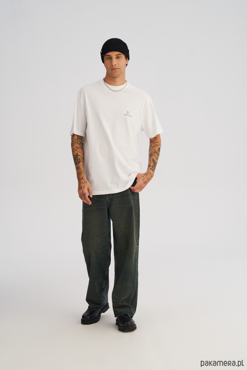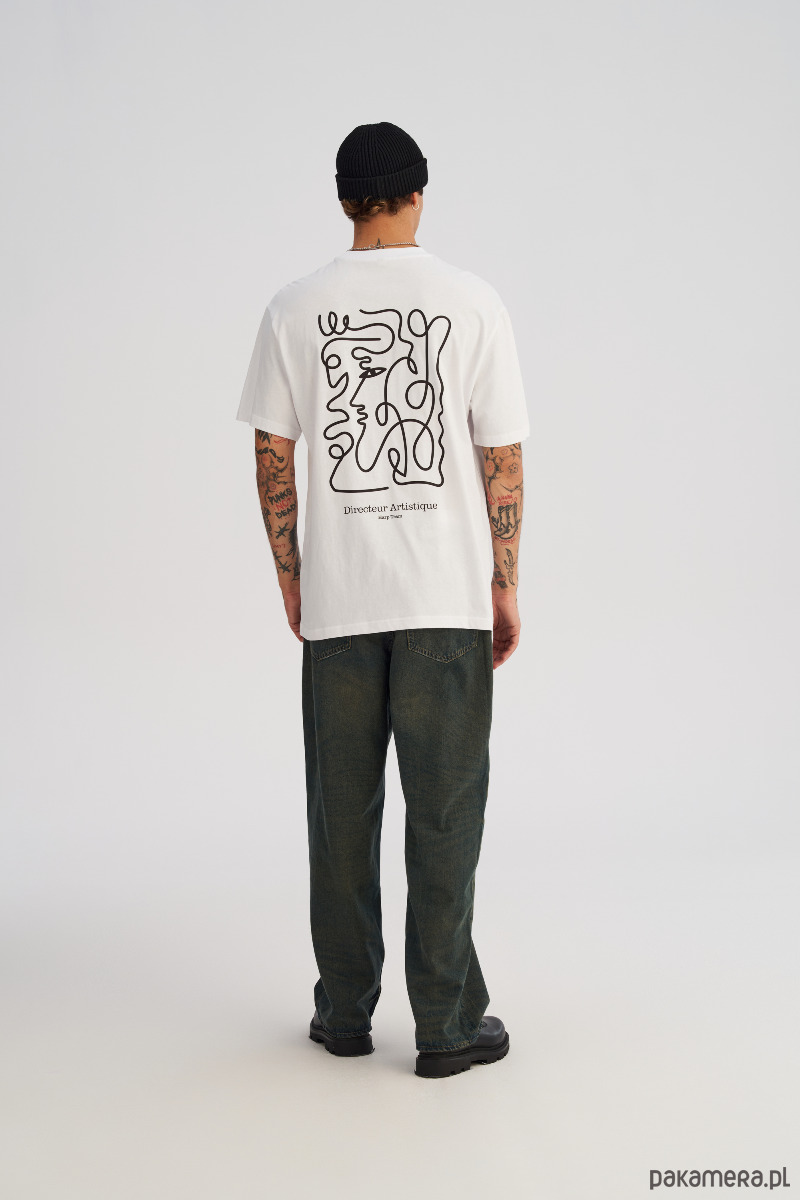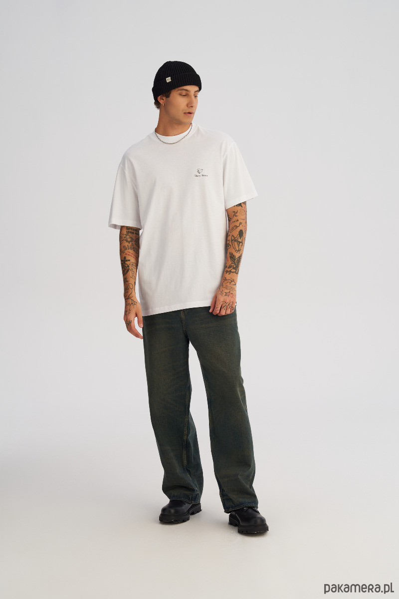 Dłuższy, luźny t-shrt o swobodnym, oversize’owym kroju. Na piersi mały, minimalistyczny nadruk, a z tyłu duży print na całe plecy, który gra pierwsze skrzypce w stylizacji. Wygodna dzianina i wydłużona linia sprawiają, że koszulka dobrze układa się na sylwetce, tworząc nowoczesny, streetwearowy look. Idealna na co dzień — do jeansów, joggerów i pod warstwę z bluzą lub kurtką.