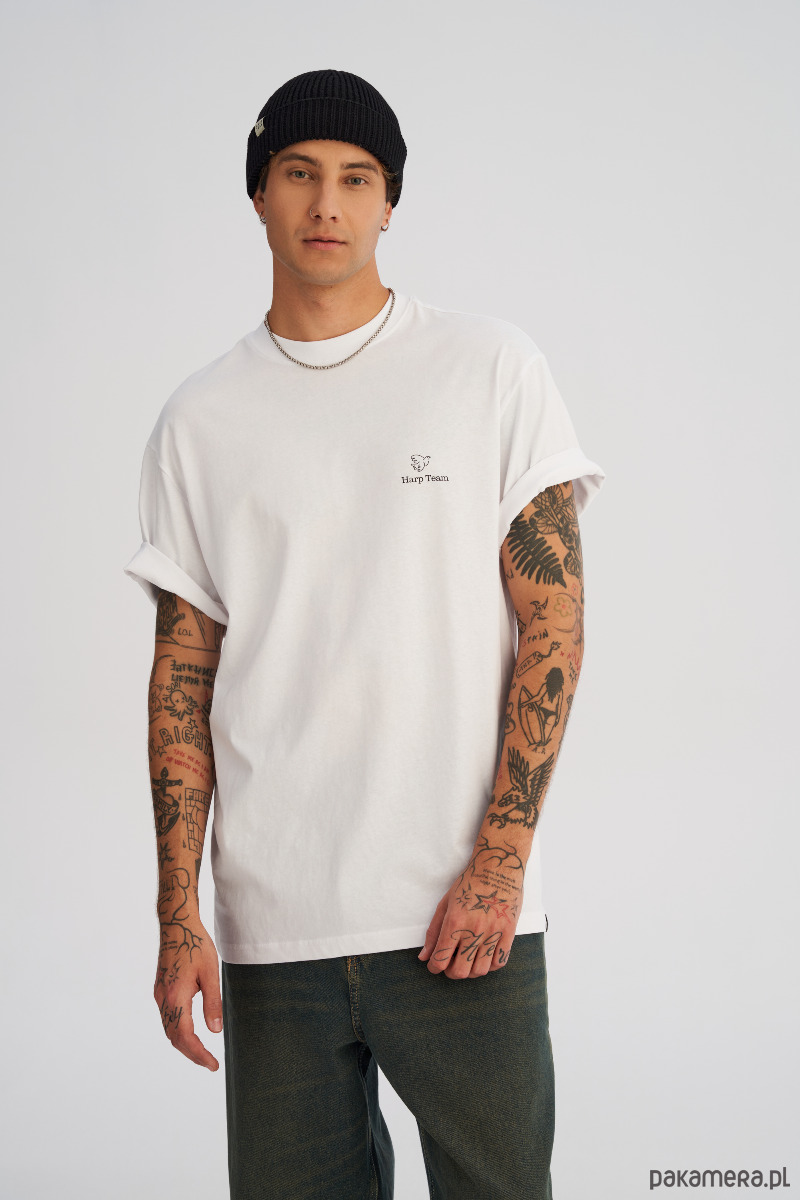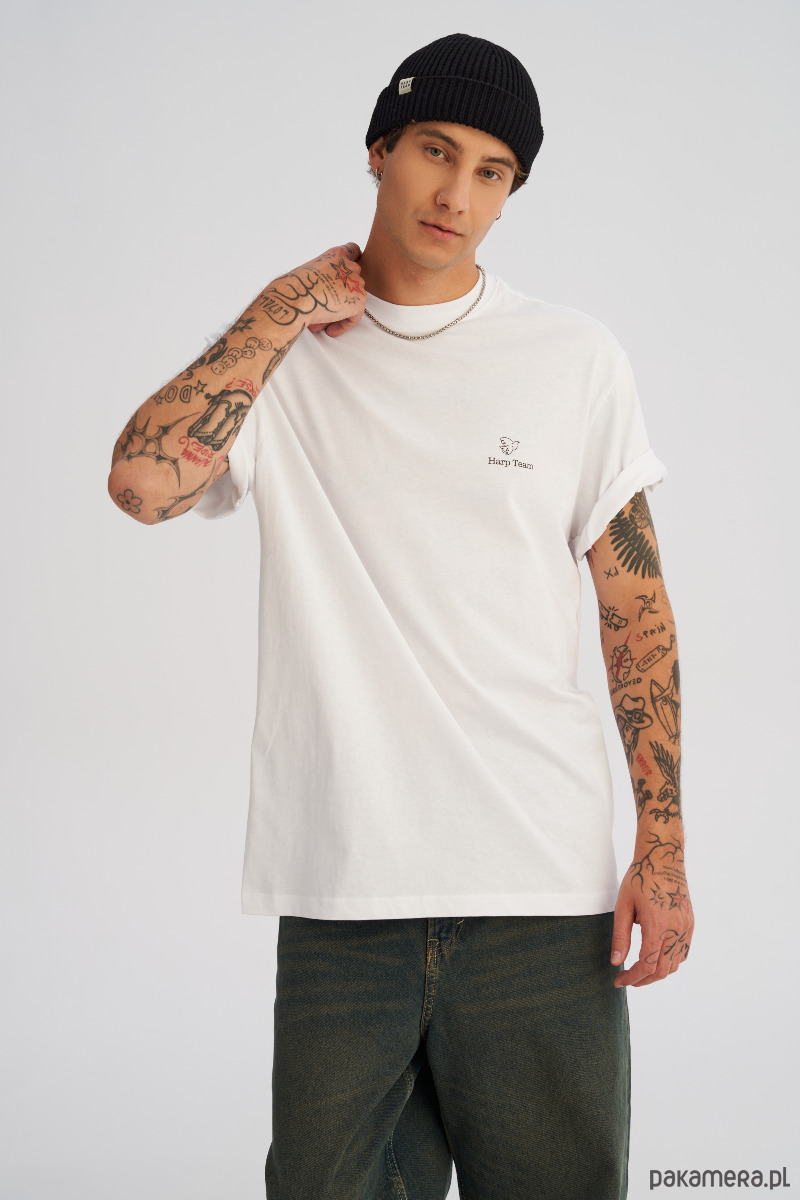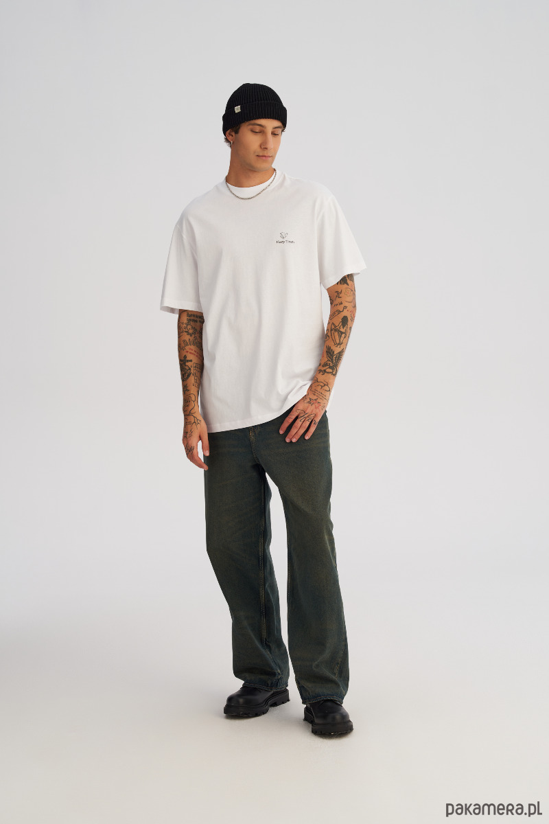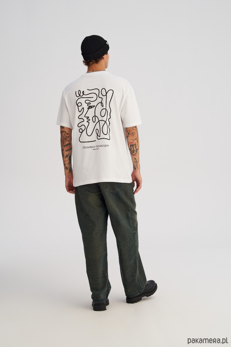 Dłuższy, luźny t-shrt o swobodnym, oversize’owym kroju. Na piersi mały, minimalistyczny nadruk, a z tyłu duży print na całe plecy, który gra pierwsze skrzypce w stylizacji. Wygodna dzianina i wydłużona linia sprawiają, że koszulka dobrze układa się na sylwetce, tworząc nowoczesny, streetwearowy look. Idealna na co dzień — do jeansów, joggerów i pod warstwę z bluzą lub kurtką.