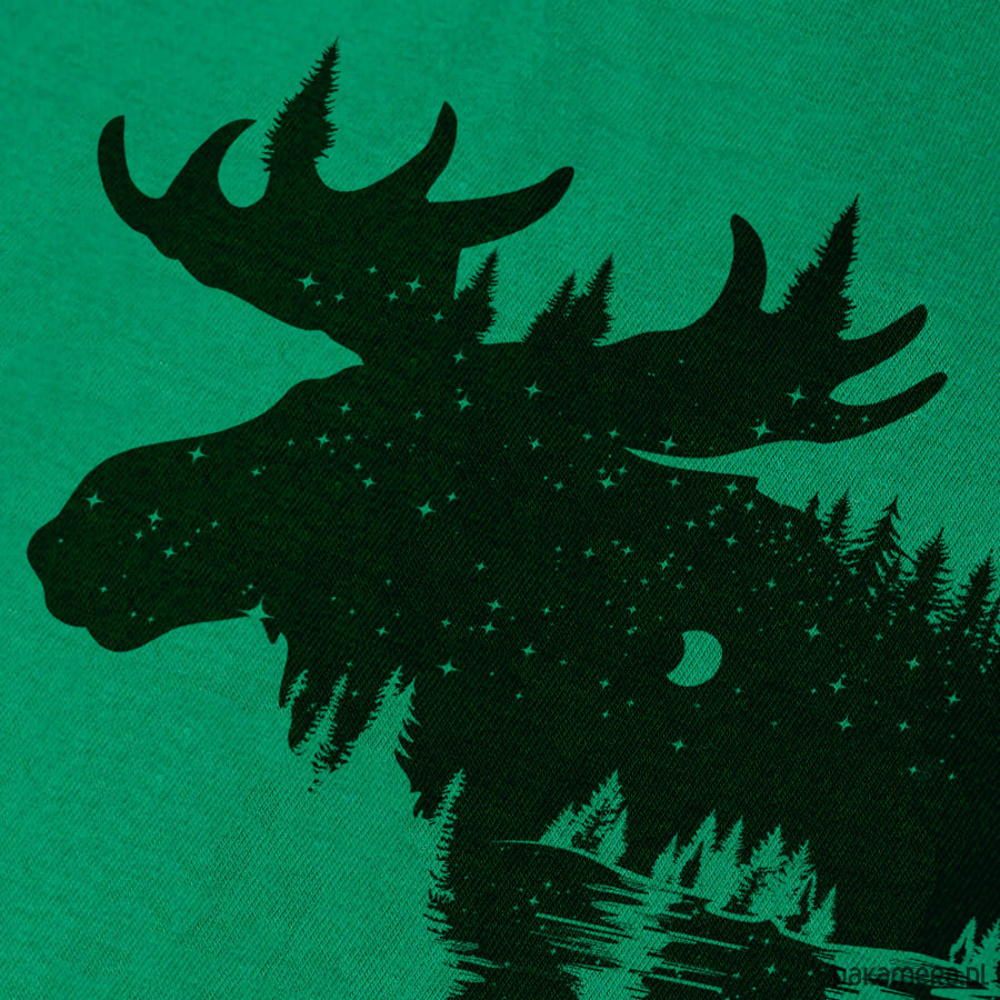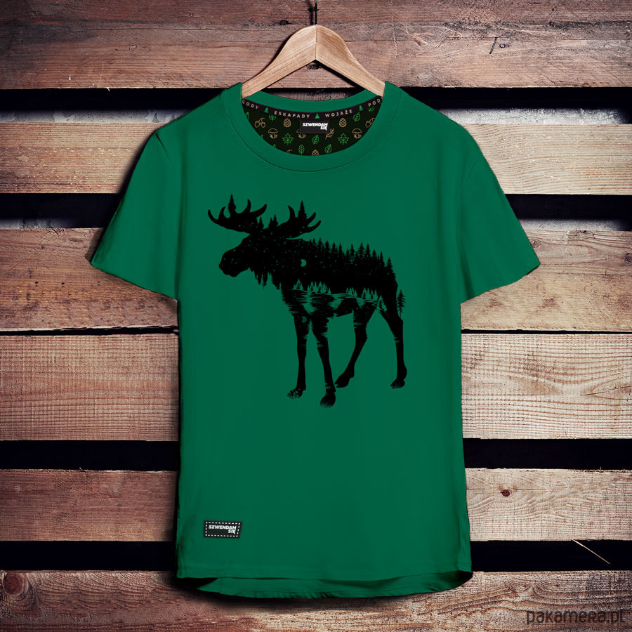 Koszulka męska w zielonym kolorze z nadrukiem przedstawiającym łosia. Łoś to największy przedstawiciel rodziny jeleniowatych i niekwestionowany król polskich bagien, mokradeł i torfowisk. Atrybutem samców (byków) jest charakterystyczne poroże w kształcie szerokich łopat. Nie każdy osobniki dostępuje zaszczytu posiadania tego oręża. Łosie pozbawione łopat nazywane są badylarzami (byki z łopatami to łopatacze). W Polsce łosie najliczniej występują w Biebrzańskim i Kampinoskim Parku Narodowym.