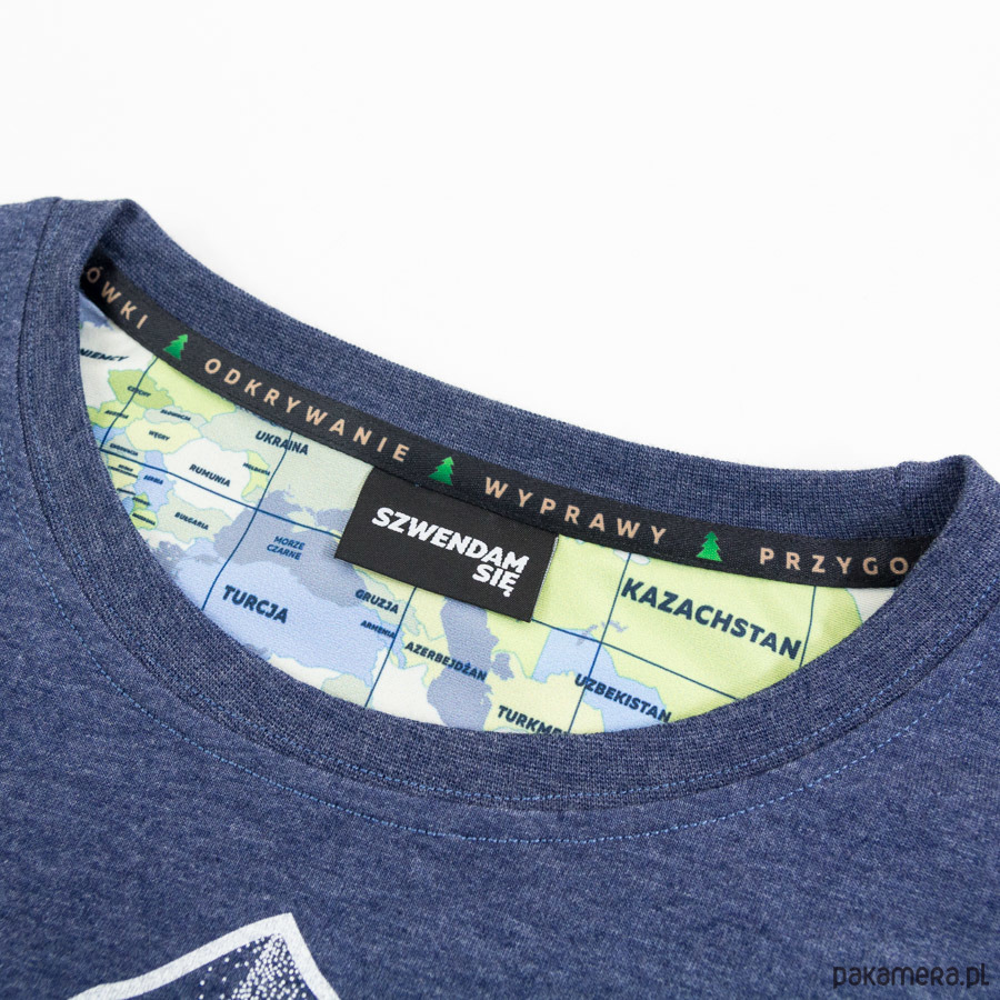T-shirt męski Szwendam się posiada karczek z fragmentem mapy politycznej świata, co dodaje mu smaczku i podróżniczego charakteru. Każda koszulka ma losowy wycinek mapy, dzięki czemu jest unikatowa i jedyna w swoim rodzaju. Model został również wyposażony w odblask na karku z tyłu koszulki, charakterystyczną taśmę potnikową nawiązującą do szlaku i trzy żakardowe metki. Wysokiej jakości dzianina sprawia, że t-shirt idealnie nadaje się do miejskiego użytkowania, jak i na mniej wymagające wycieczki w teren.