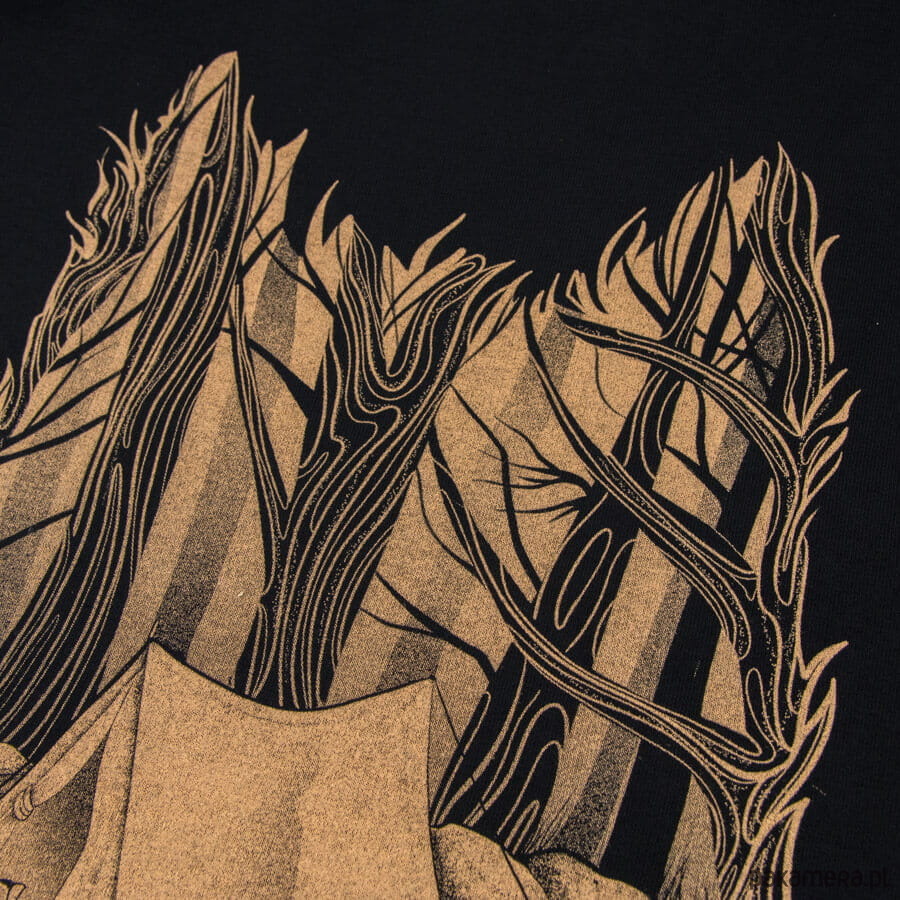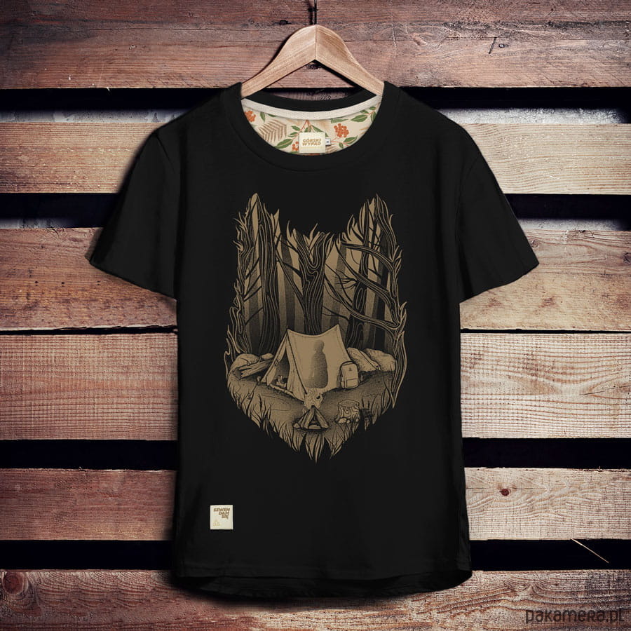 Na czarnej tkaninie umieszczono unikalny nadruk przedstawiający wilczą głowę, z centralnie ulokowanym rozbitym namiotem, w którym dostrzec można zarys ludzkiej sylwetki. Obok namiotu znajduje się plecak turystyczny oraz płonące ognisko, a dookoła znajduje się malownicza knieja, co doskonale oddaje klimat leśnych wypraw.