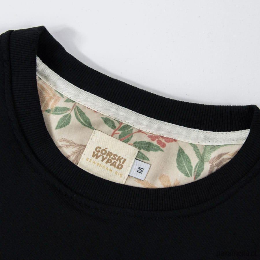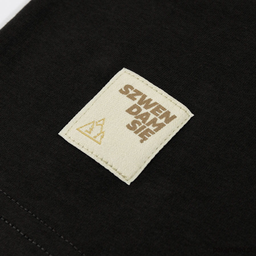 Koszulka wyróżnia się niespieralnym nadrukiem wykonanym w technice sitodruku oraz starannie wzmocnionym dekoltem podwójnym szwem. Z tyłu znajdują się minimalistyczny haft w formie choinki oraz ozdobne detale, takie jak karczek z motywami leśnymi, czy bawełniany potnik z taśmy jodełkowej. Dodatkowo, na prawym dolnym rogu znajduje się żakardowa wszywka z napisem „Szwendam się”, co podkreśla charakter i oryginalność produktu.