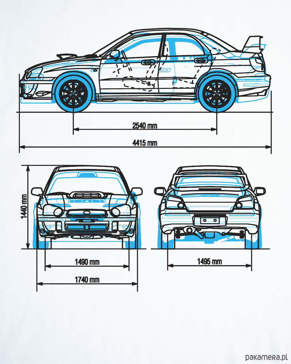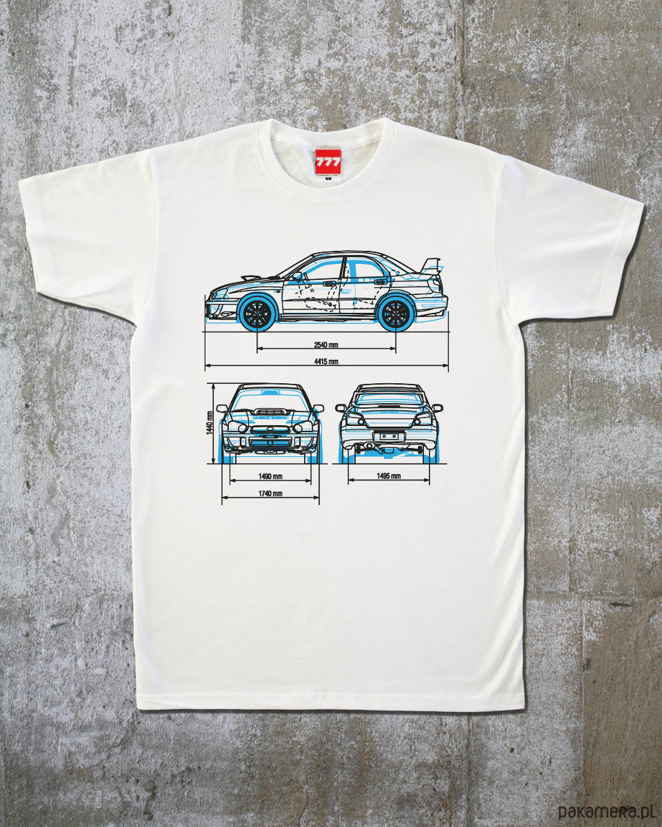 Subaru Impreza WRX - rajdowa legenda. Na czarno druga generacja, po przeprowadzonym w 2003 r lifcie nazywana "blobeye". Na niebiesko pierwsza, produkowana w latach 1992-2001 "mean eye". Delikatny w dotyku nadruk na białej koszulce 100% bawełny, gramatura 160 g. Projekt: 777.