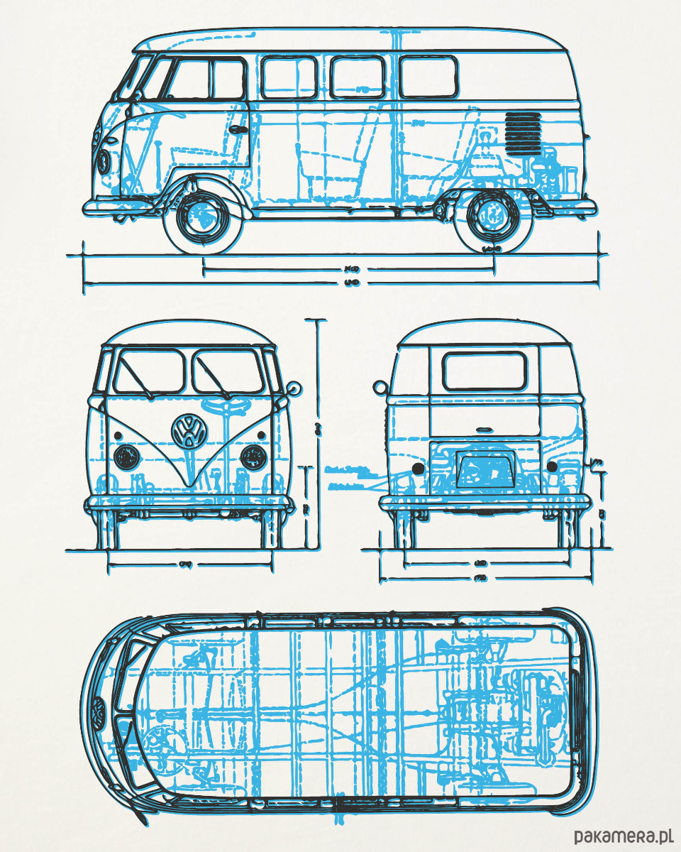 VW T1 - czyli pojazd, który zmotoryzował hippisów. Produkowany od 1950 roku - także w USA. W Polsce nazywany "Ogórkiem" lub bardziej międzynarodowo "Bulikiem". Delikatny w dotyku nadruk na białej koszulce 100% bawełny, gramatura 160 g. Projekt 777.