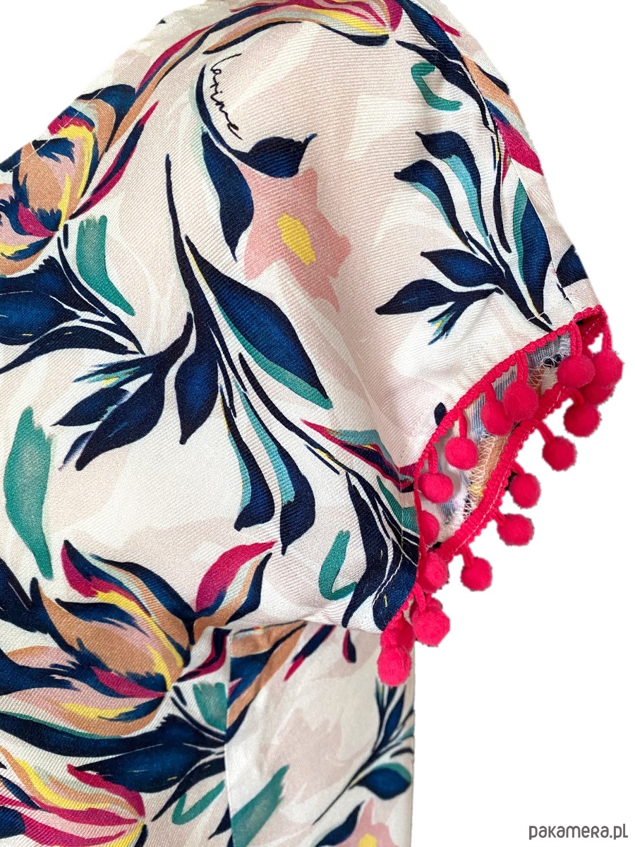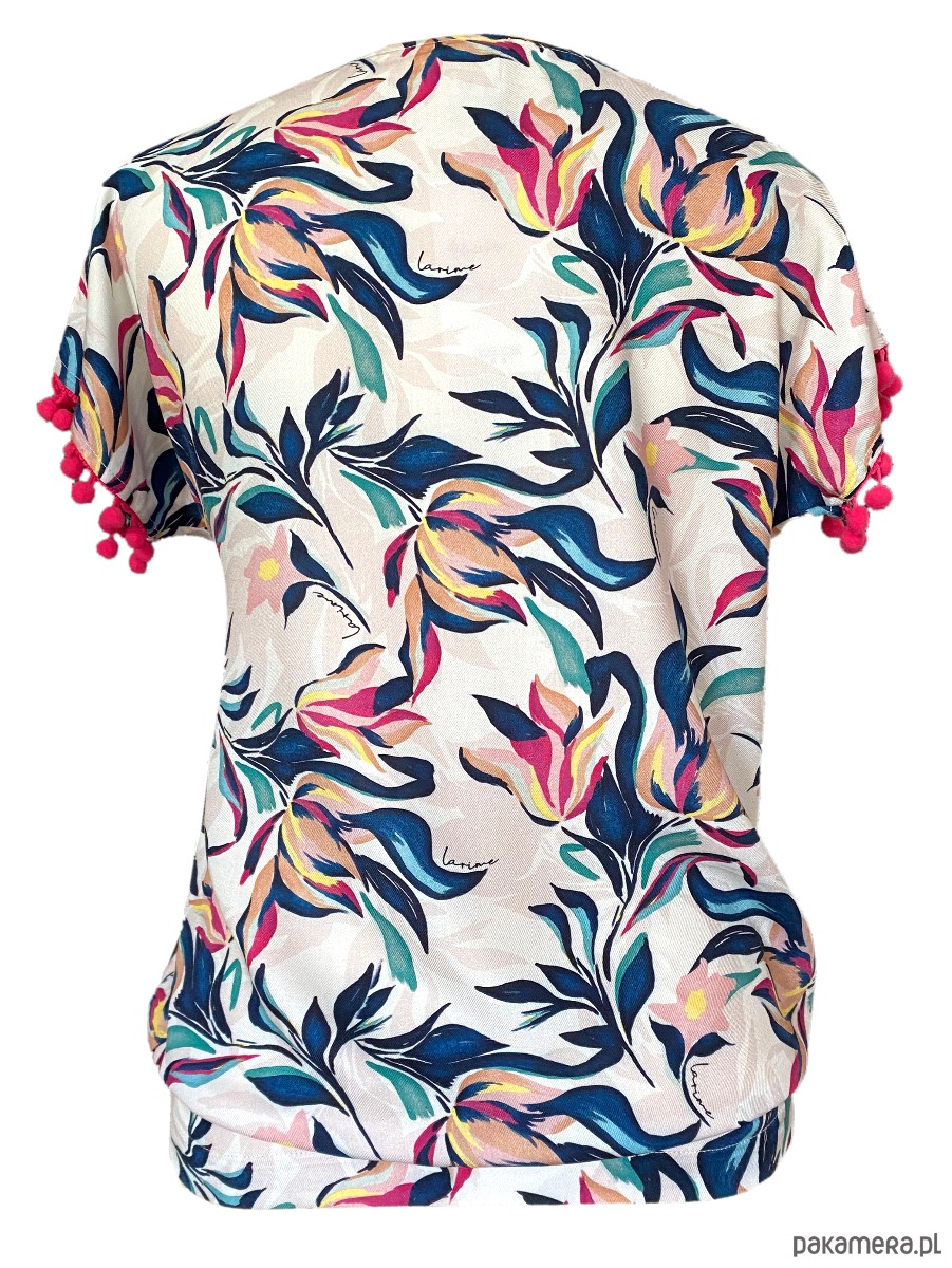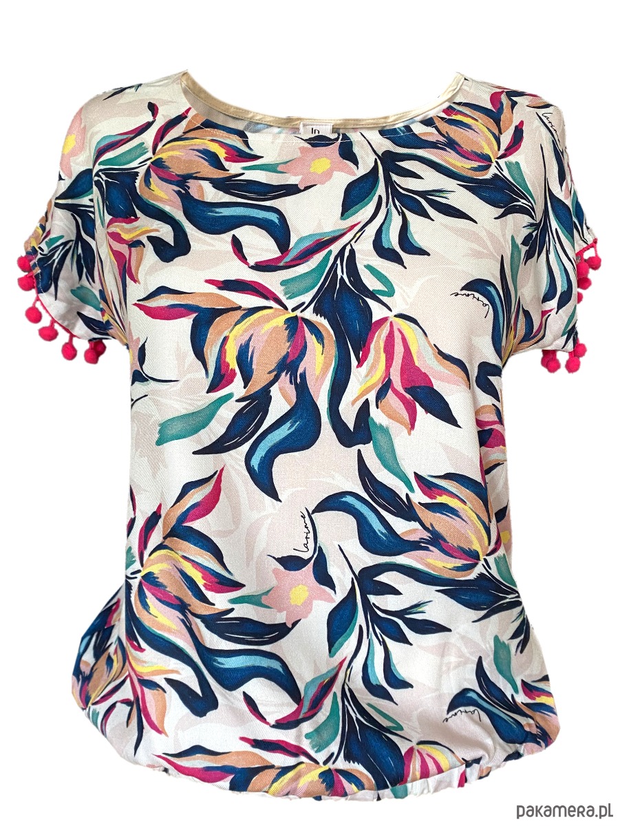 Koszulka - bluzka Begonia z wiskozy . Tkanina z autorskim, malarskim drukiem. Druk w kwiatowy . Bluzka w kształcie kimona, z krótkim rękawem, tak zwany "nietoperz". Doły rękawków wykończone taśmą z kuleczkami - bąbelkami.