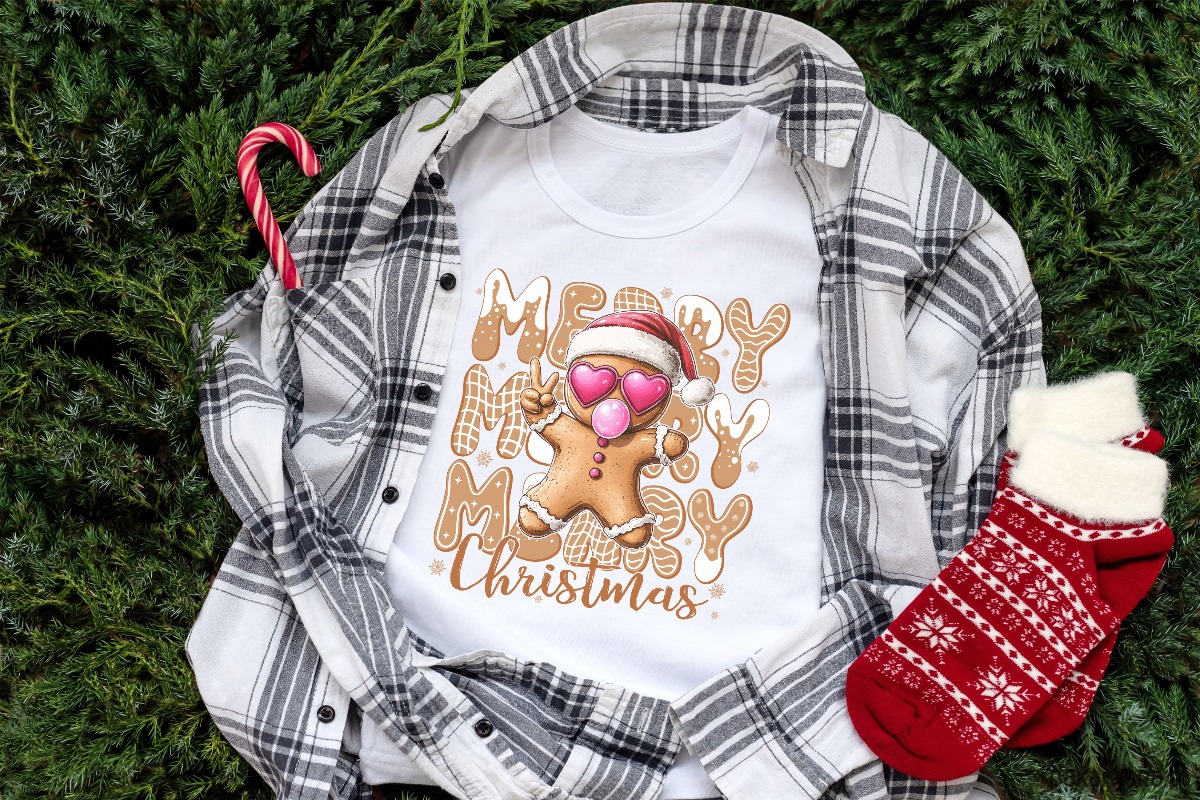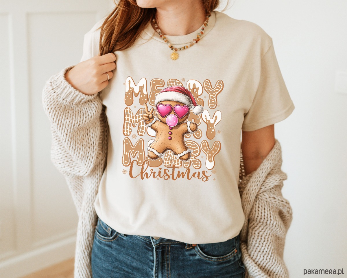 Koszulka świąteczna MERRY z nadrukiem ciastka w czapce Mikołaja i gumą balonową