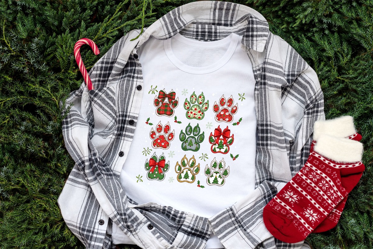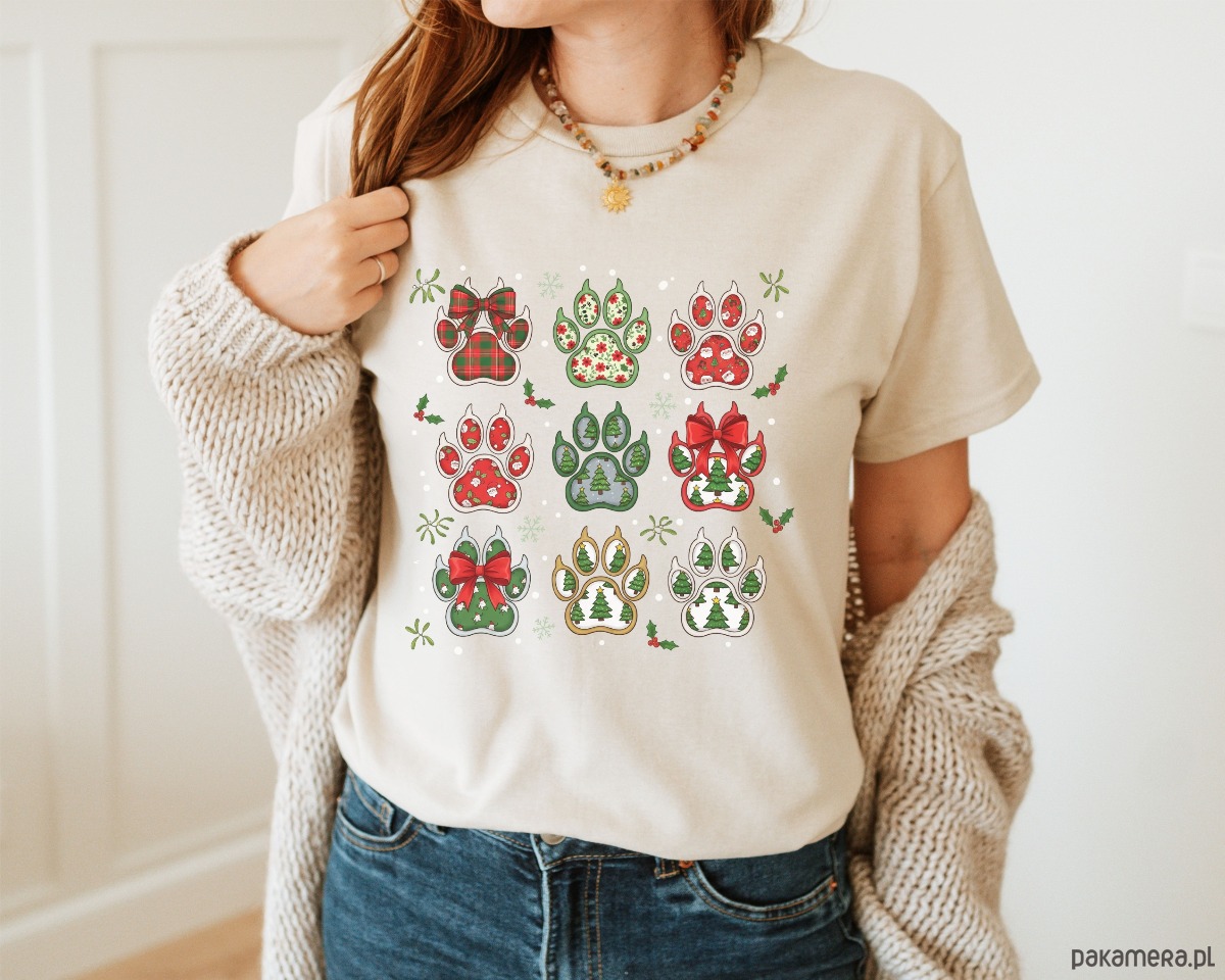 Koszulka w świąteczny motyw psich łap to hołd dla wszystkich futrzastych przyjaciół, którzy sprawiają, że grudzień jest jeszcze bardziej magiczny.