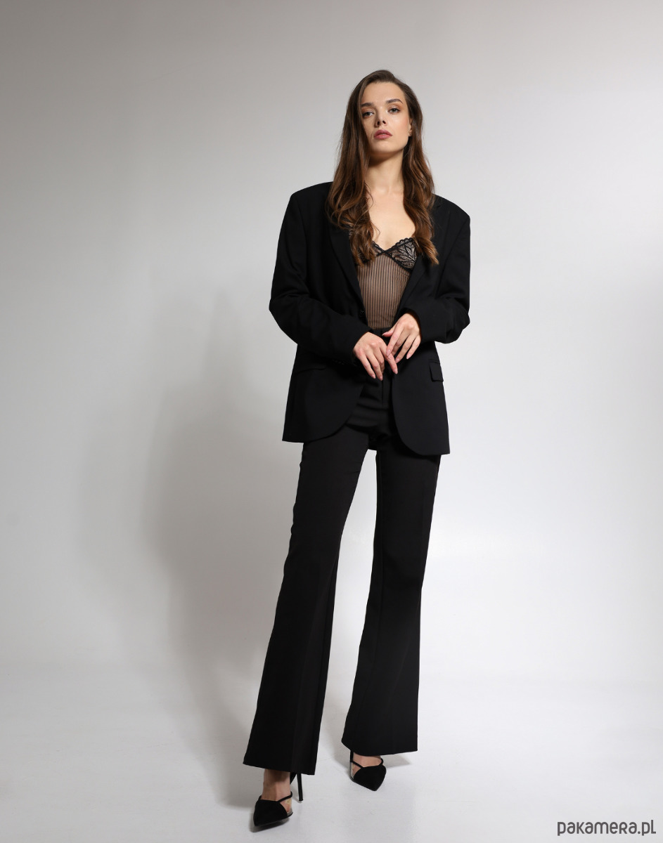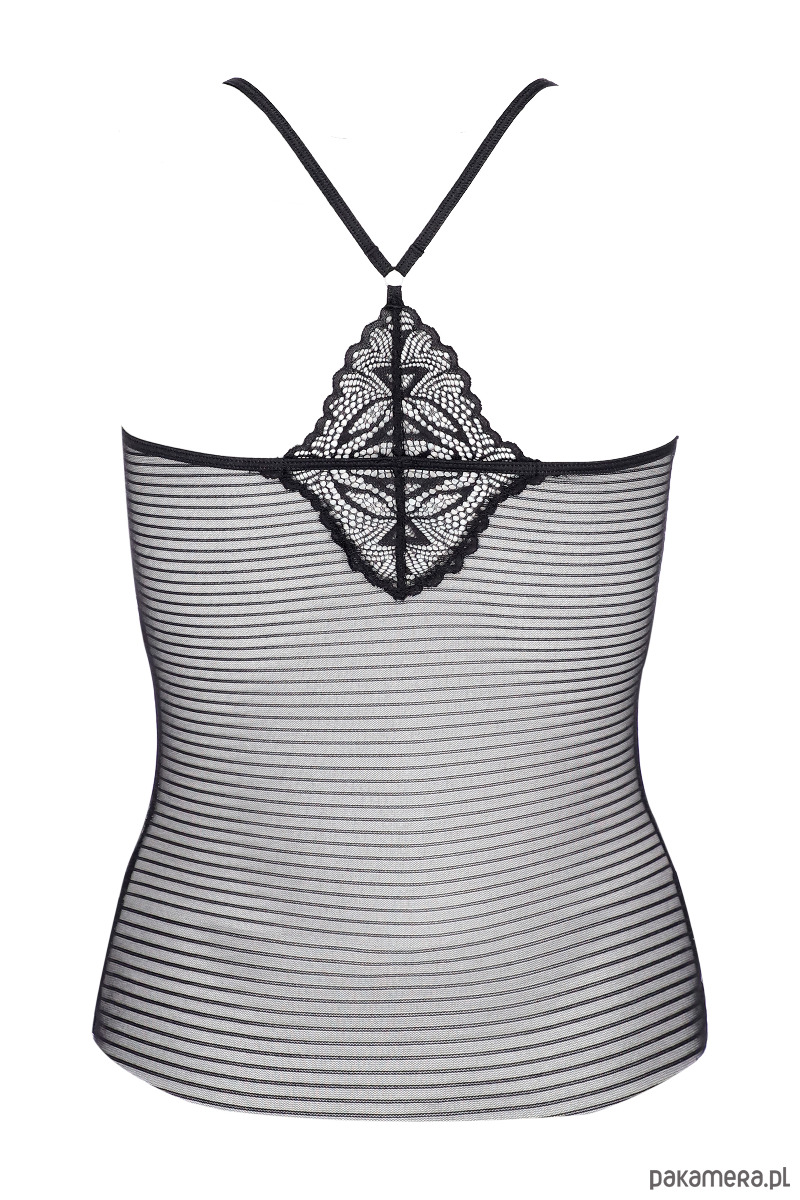 Koronkowa koszulka nocna Bianca w czarnym kolorze to niezwykle elegancka bielizna nocna dla kobiet. Wykonaliśmy ją z delikatnego i miękkiego w dotyku tiulu. Na piersiach koszulka jest wykonana z pięknej koronki w orientalnym wzorze. Na plecach, nieco poniżej łopatek, wszyliśmy koronkę w kształcie odwróconego latawca, dzięki czemu pięknie podkreśliliśmy plecy. Koszulka trzyma się na wąskich ramiączkach schodzących na plecach do latawca. Dolna część koszulki to miękki i delikatny tiul w motyw prążków.