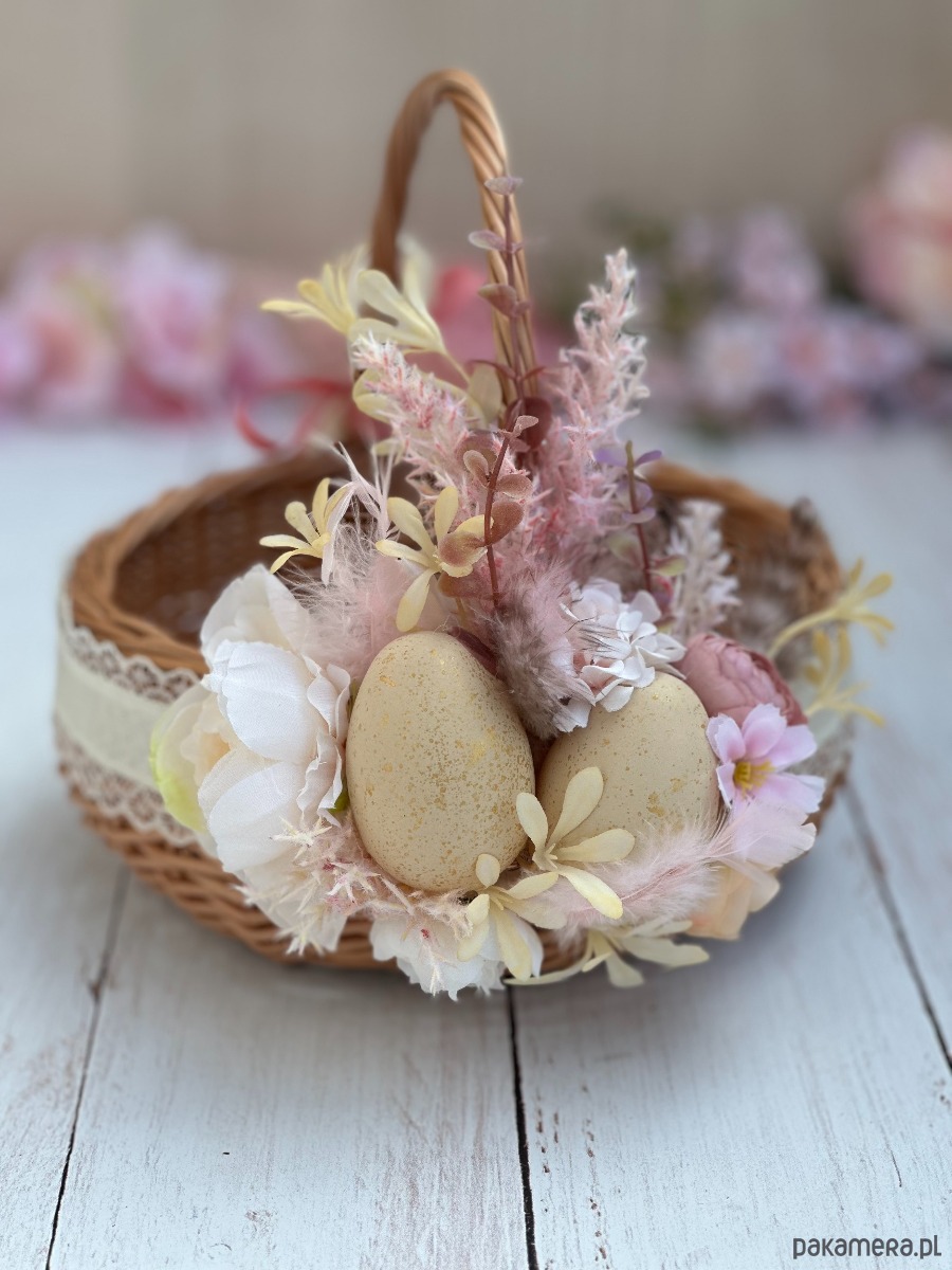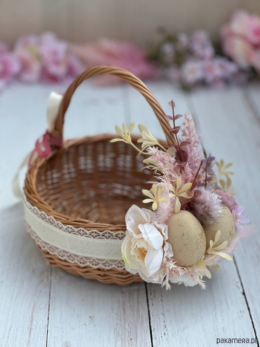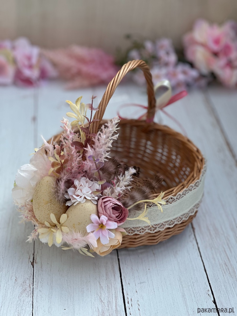 Koszyczek wielkanocny z naturalnej wikliny, ozdobiony kwiatami i dodatkami sztucznymi. Dekoracja na stałe przymocowana do koszyczka, przygotowana przeze mnie ręcznie :)