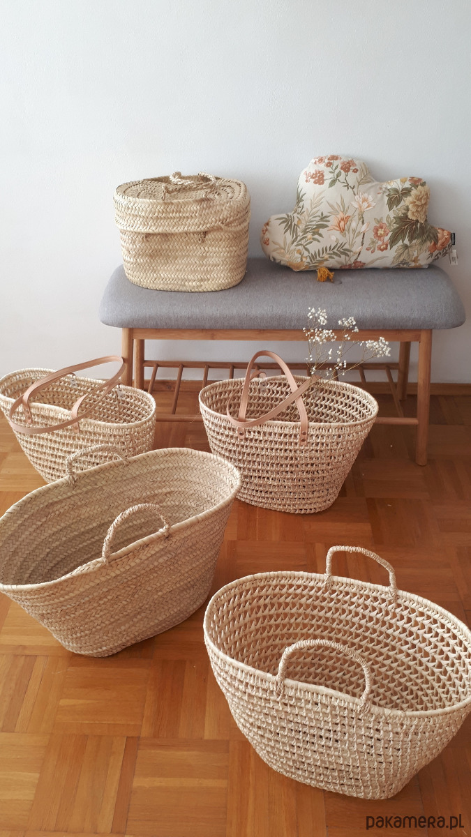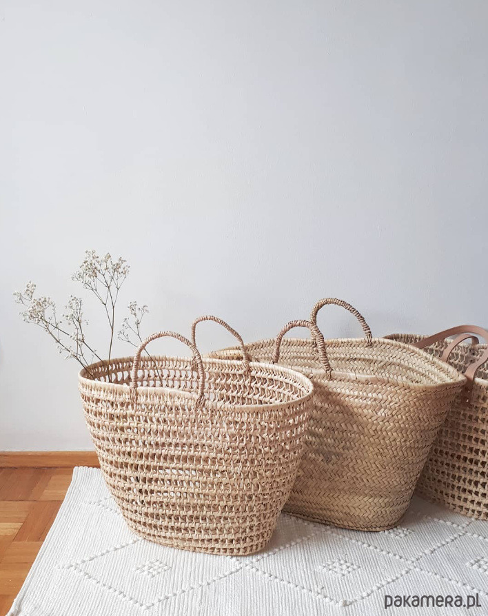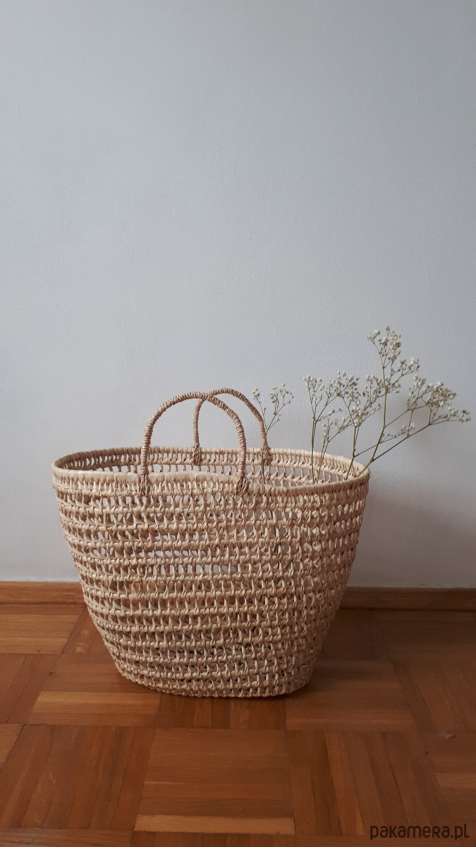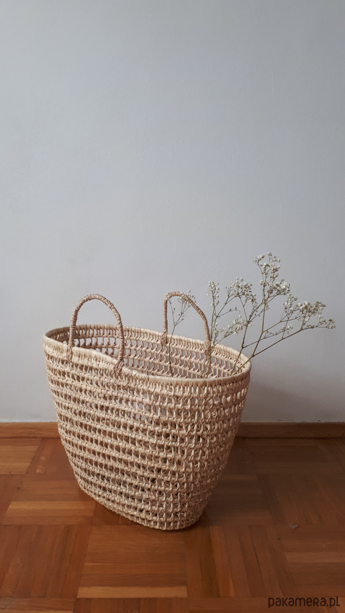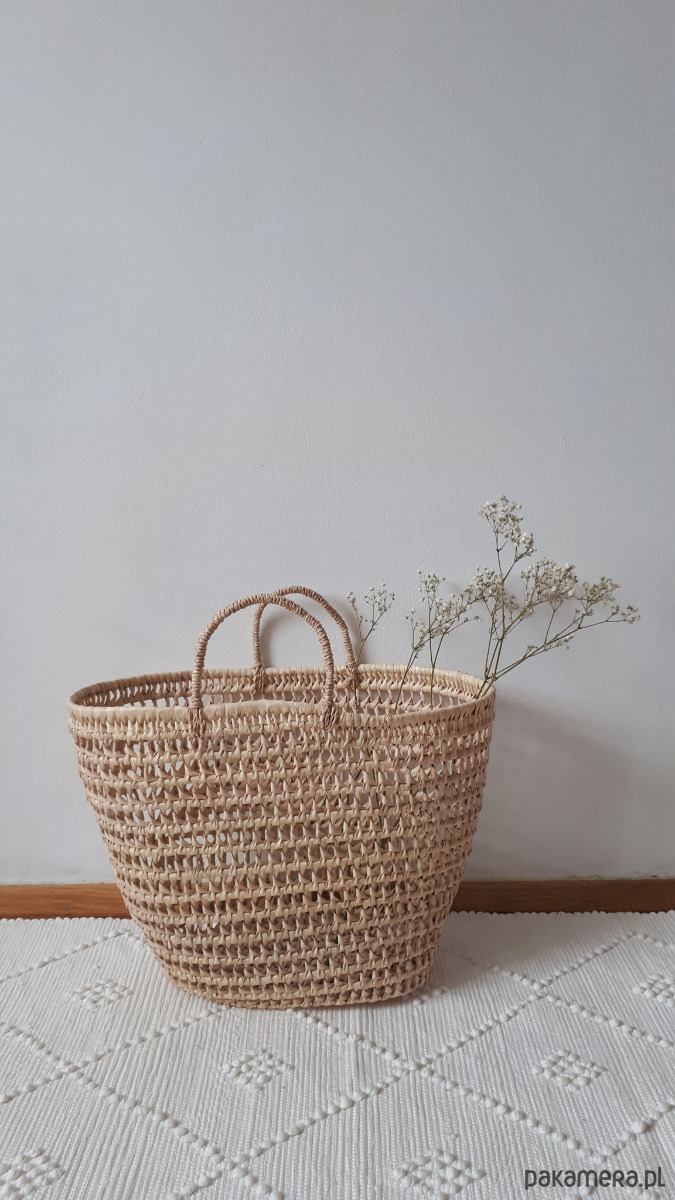 Koszyk, torba pleciona z liści palmowych, ażurowa. Idealna do sukienek na lato, w stylu boho. Może służyć też jako kosz-pojemnik-dekoracja, sprawdza się w każdym pomieszczeniu.