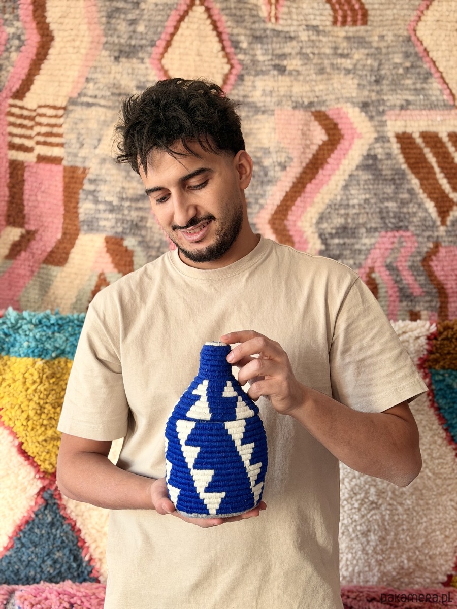 Ten wyjątkowy koszyk dekoracyjny ze zdejmowaną pokrywką to połączenie tradycyjnego marokańskiego rzemiosła z nowoczesną estetyką. Ręcznie tkany z naturalnych liści palmowych i zdobiony miękką, barwioną wełną, zachwyca intensywnym kolorem i geometrycznym wzorem inspirowanym kulturą Amazigh.
